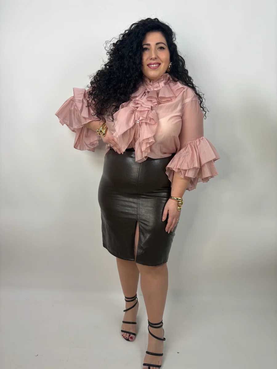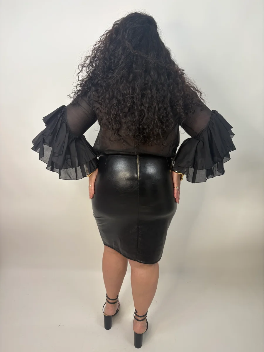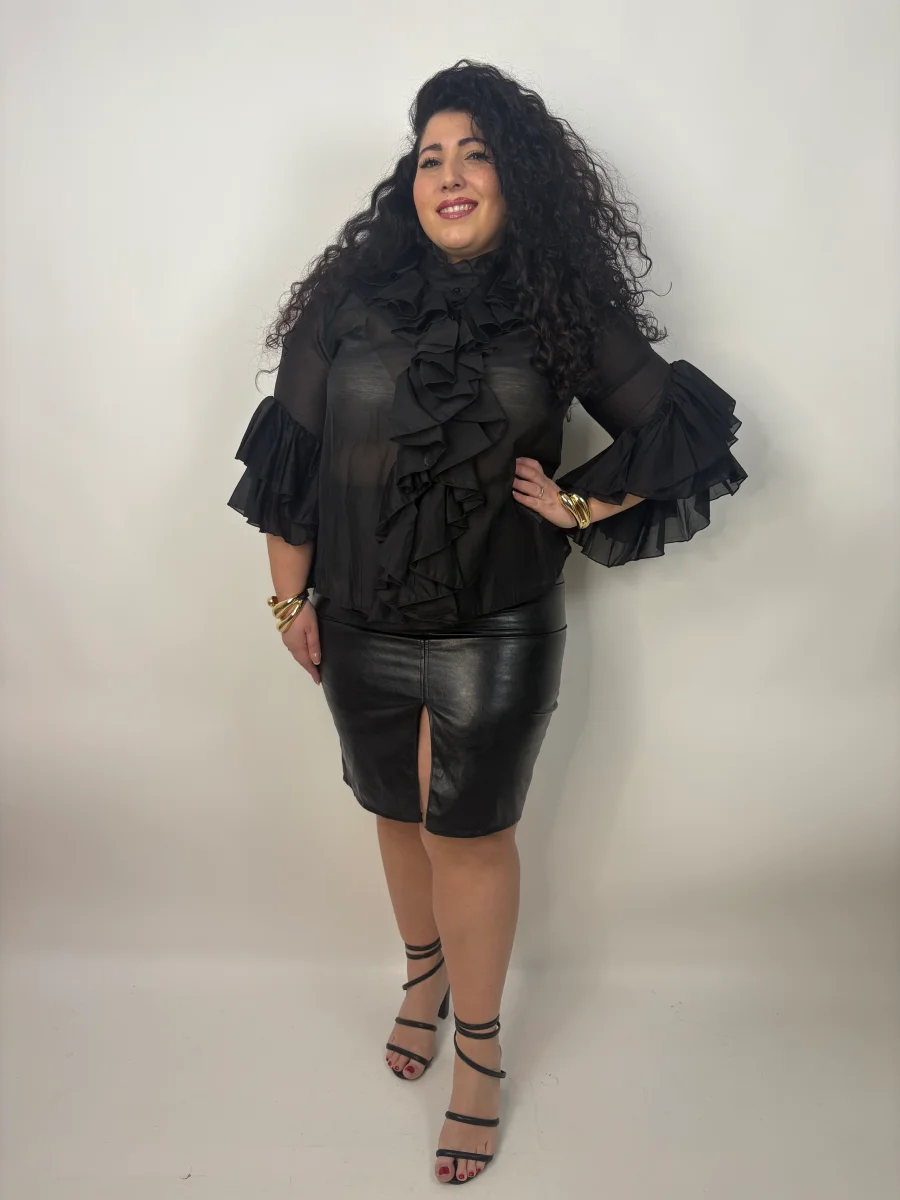 Gonna in ecopelle in taglia unica Curvy, veste dalla taglia 48alla taglia 52. La ragazza in foto รจ taglia 52-54. I centimetri del suo corpo sono: Altezza 1.69 cm/ Giro vita 123 cm / Giro fianchi 143