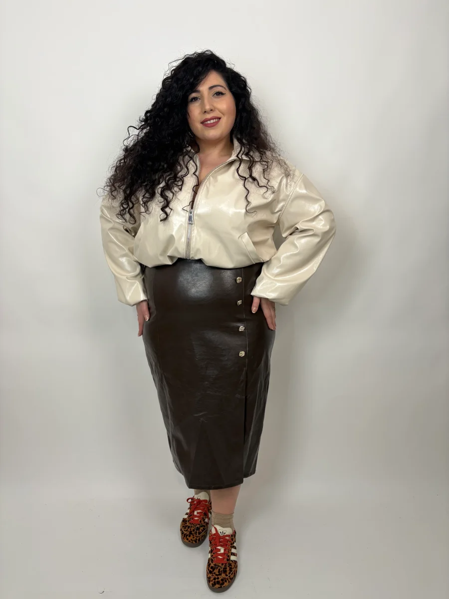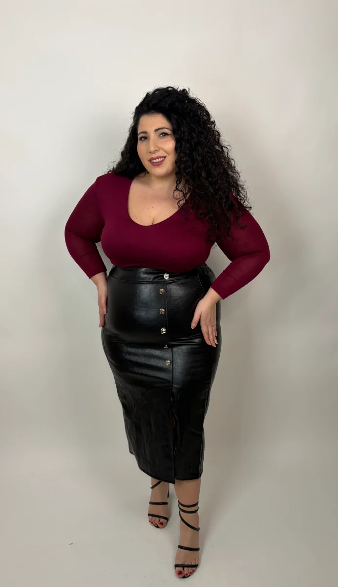 Gonna in ecopelle in taglia unica Curvy, veste dalla taglia 48 alla taglia 54. La ragazza in foto รจ taglia 52-54. I centimetri del suo corpo sono: Altezza 1.69 cm/ Giro vita 123 cm /Giro fianchi 143cm