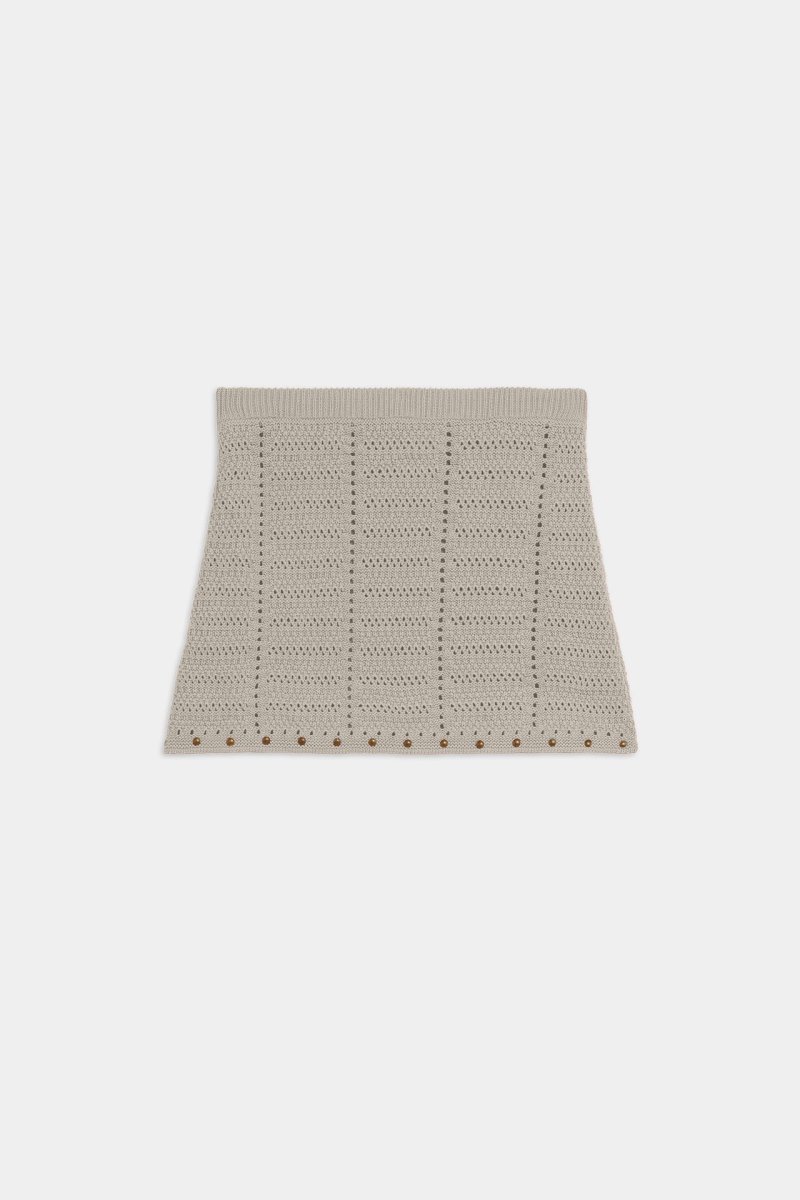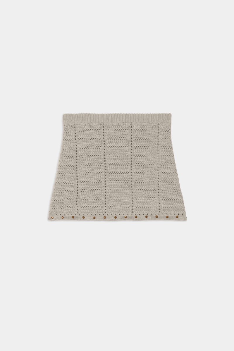 Gonna corta da donna in maglia lavorata con vita elasticizzata e linea aderente. Modello con lavorazione traforata e dettagli decorativi. COTONE 100% MADE IN ITALY