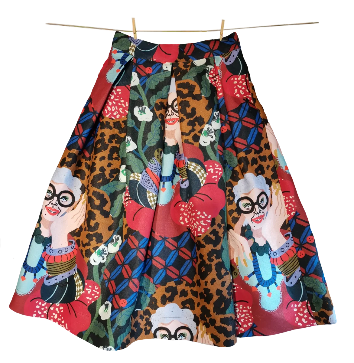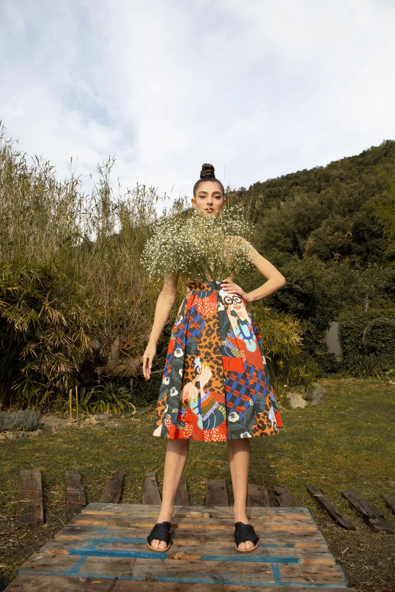 Gonna midi a vita alta stile anni ’50 con soffietti e pieghe bloccate in vita, modello a campana perfetto per evidenziare il punto vita. 100% cotone Gots Stampa ispirata a IRIS APFEL: Iris Apfel nasce nel 1921 ad Astoria, New York da Samuel e Sadye entrambi ebrei. Studia allโuni- versitร di New York dove inizia […]