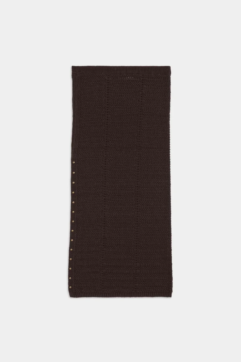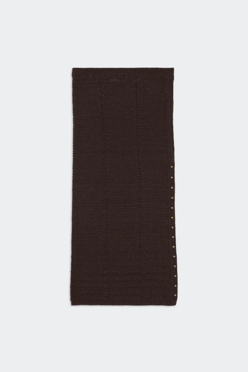 Gonna lunga da donna in maglia lavorata con vita elasticizzata e linea aderente. Modello con lavorazione traforata, spacco frontale e dettagli decorativi sul fondo. COTONE 100% MADE IN ITALY