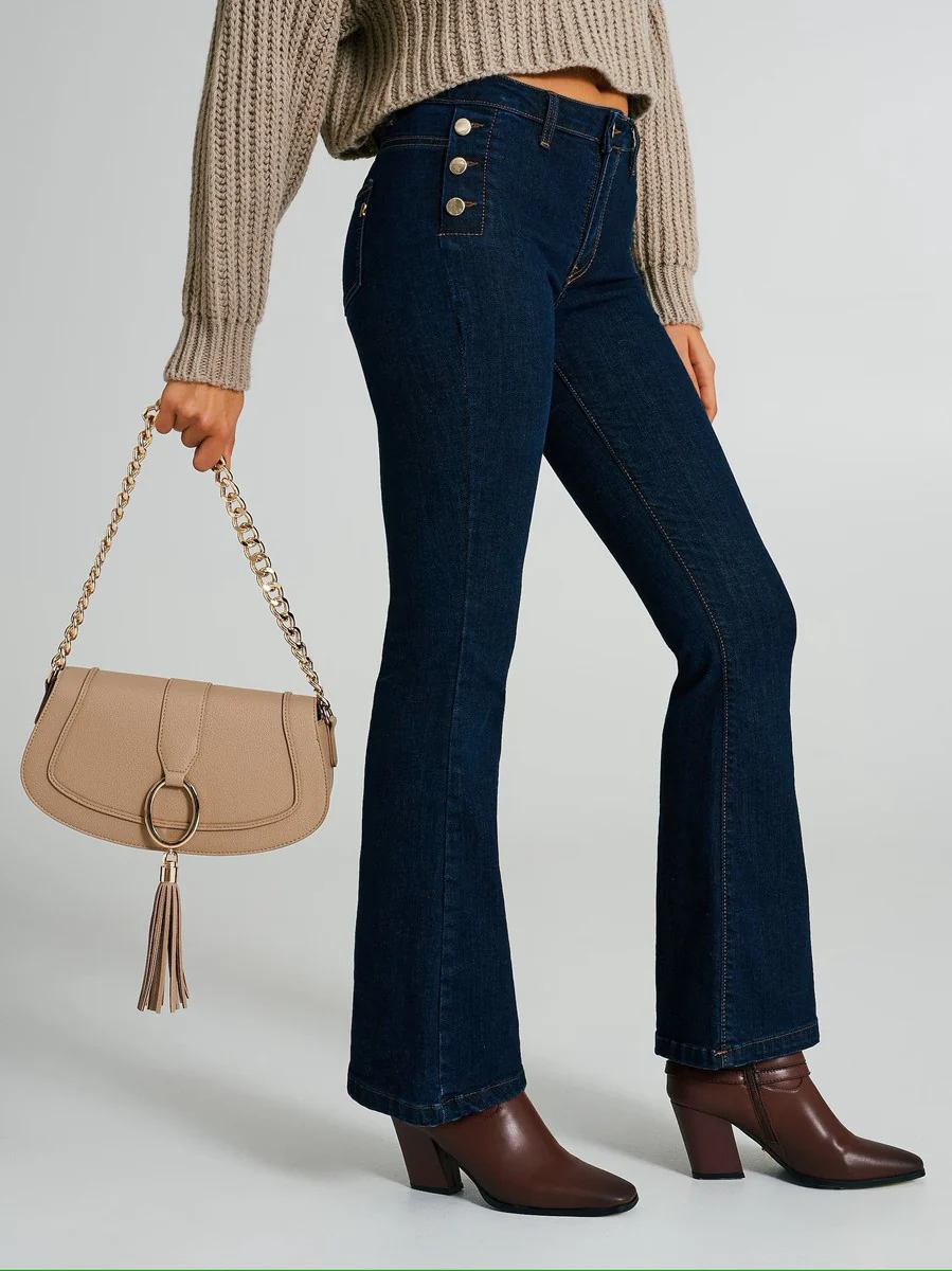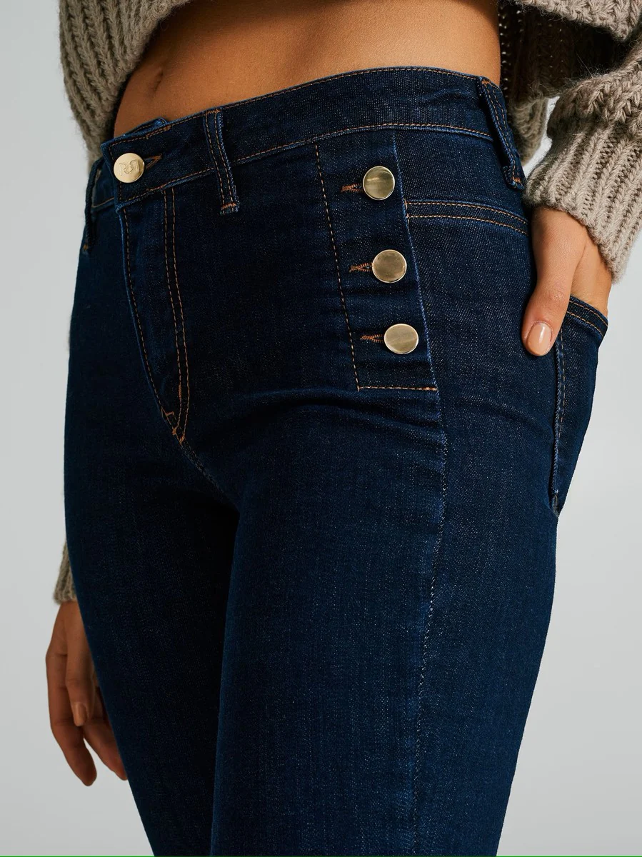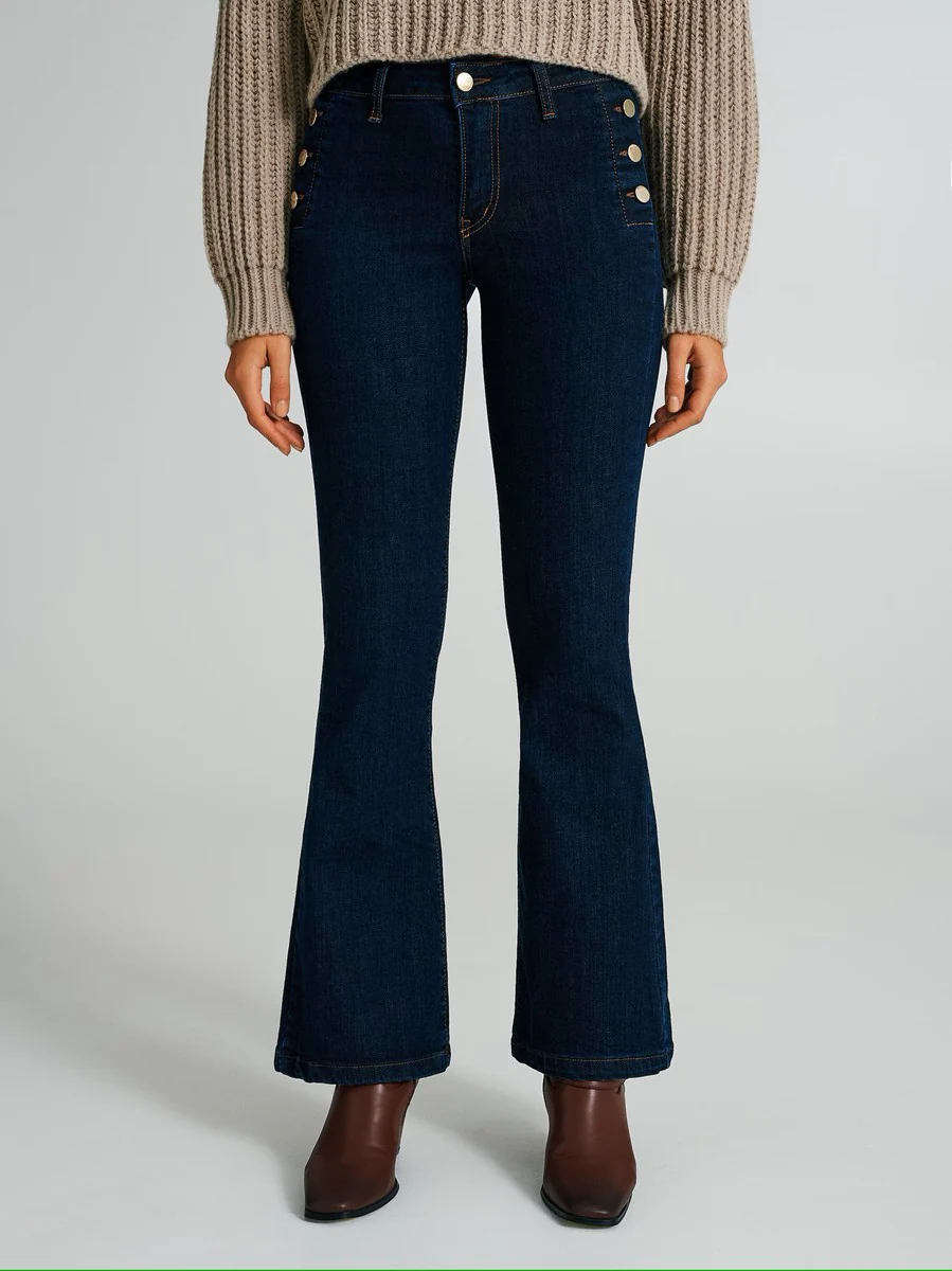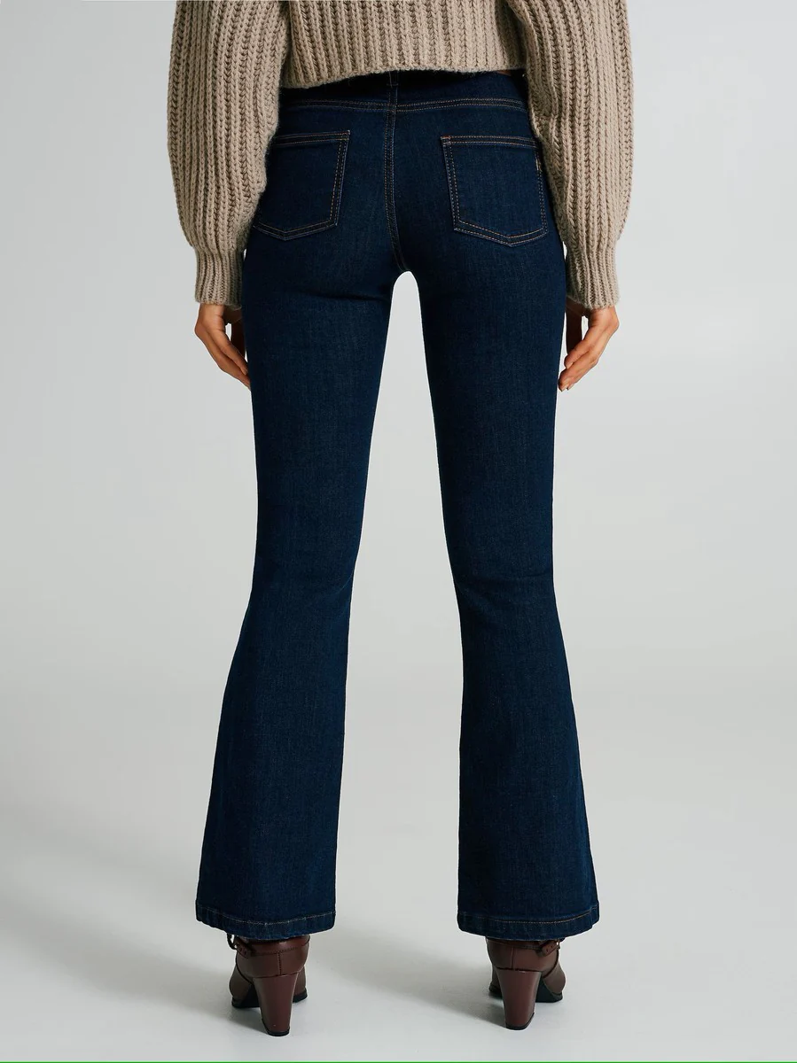 Jeans a zampa realizzati in tessuto denim elasticizzato, lavaggio scuro. Il capo ha le cuciture a vista con colore in contrasto ed รจ impreziosito da 6 bottoni applicati sulla parte superiore. Scegli il jeans preferito tra quelli disponibili. Il capo รจ interamente made in Italy. La modella รจ alta 1,74 m ed indossa la taglia S.