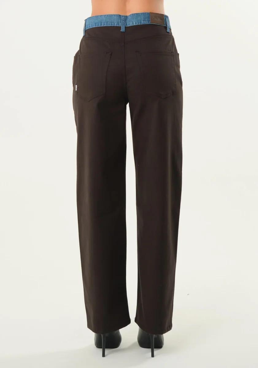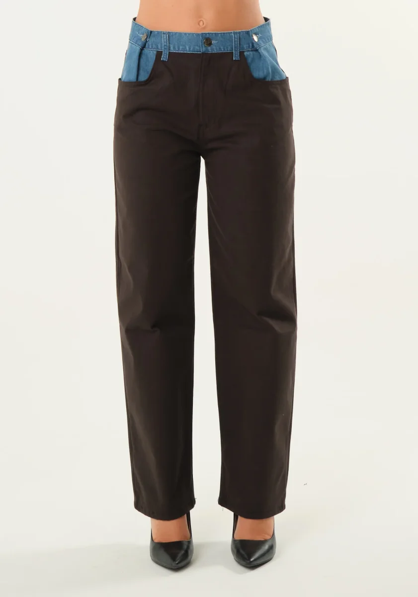 Jeans con bustino a contrasto, in cotone elasticizzato, tasche, gamba dritta, pence laterale regolabile, chiusura frontale con bottone e zip