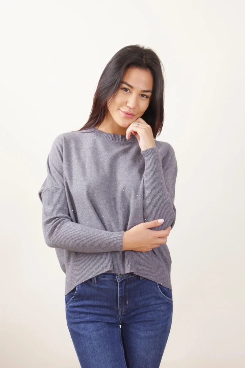 Maglia a maniche lunghe, con scollo rotondo impreziosita con micro paillettes. Collo, polsi e fondo a costine.