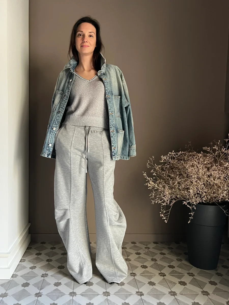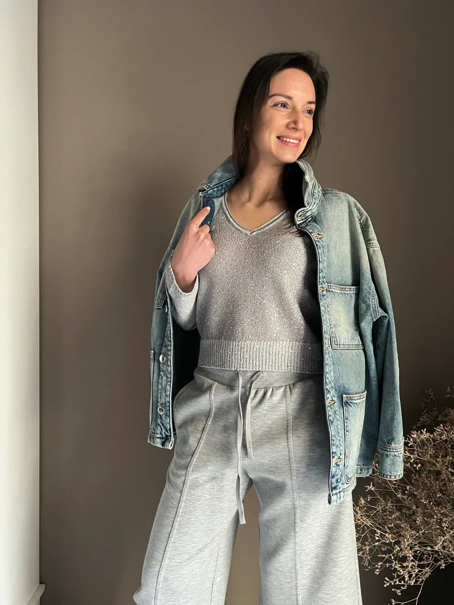 Il color grigio perla agisce come una base luminosa e versatile, rendendo il capo perfetto sia per un look da giorno sofisticato che per un’occasione serale piรน glamour.
