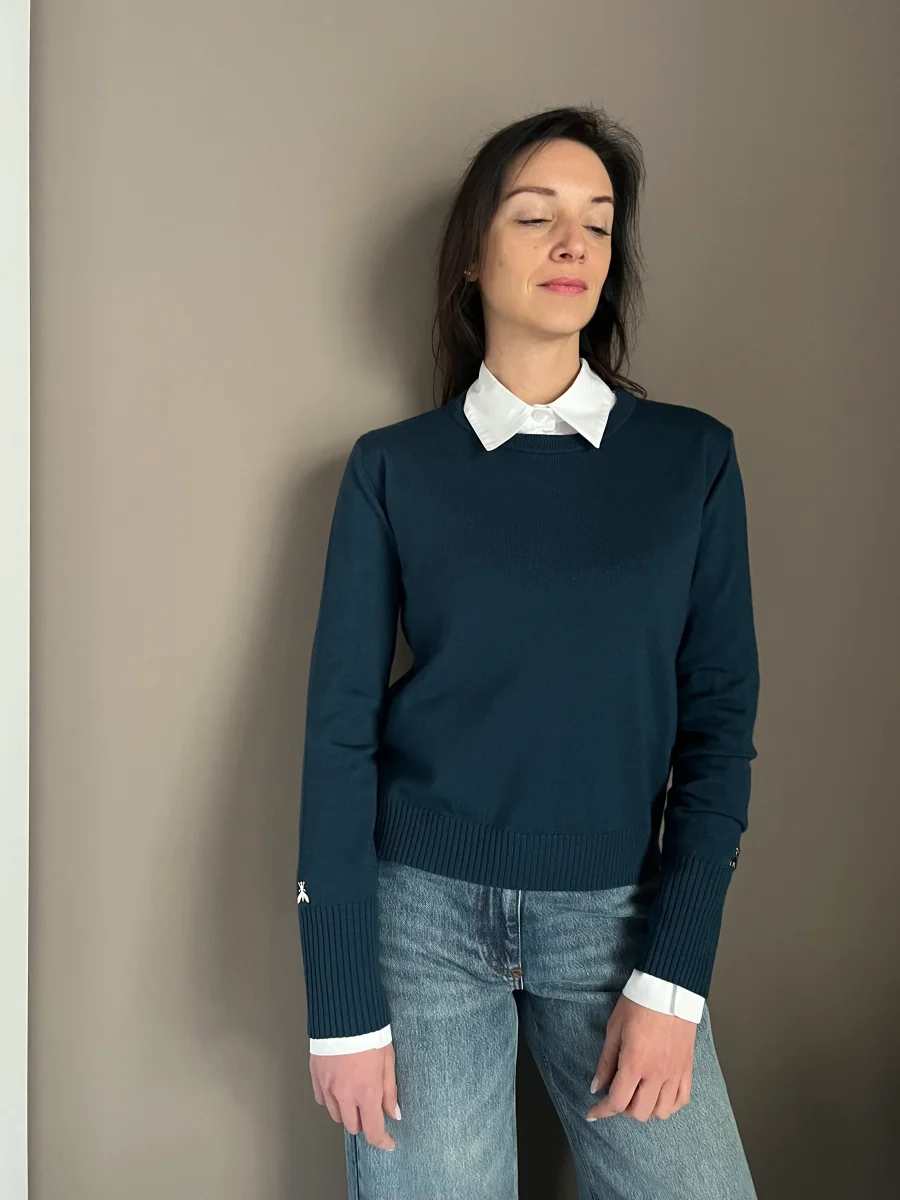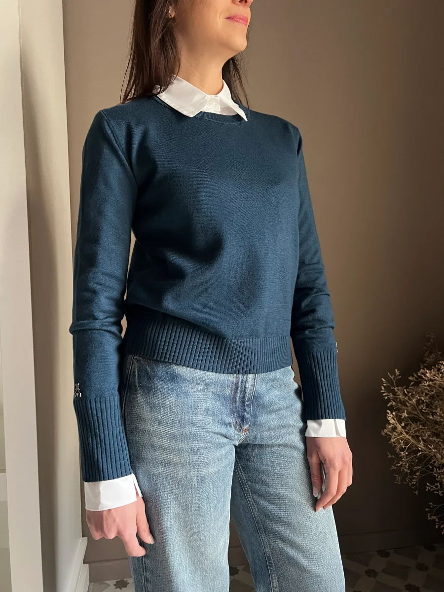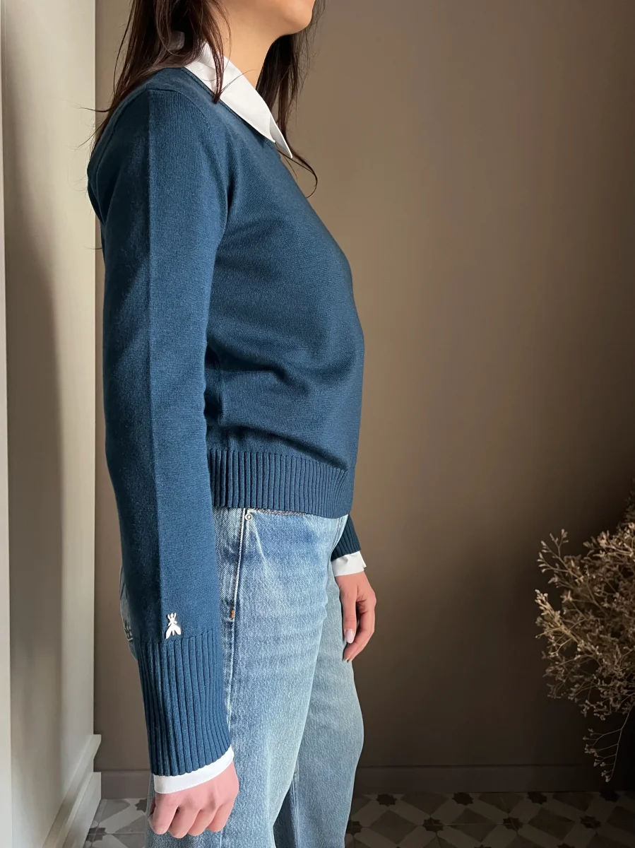 Come vedi nelle foto, รจ perfetta portata sopra una camicia bianca per un look preppy-chic da ufficio, oppure indossata da sola con un denim chiaro per un weekend casual ma curato.