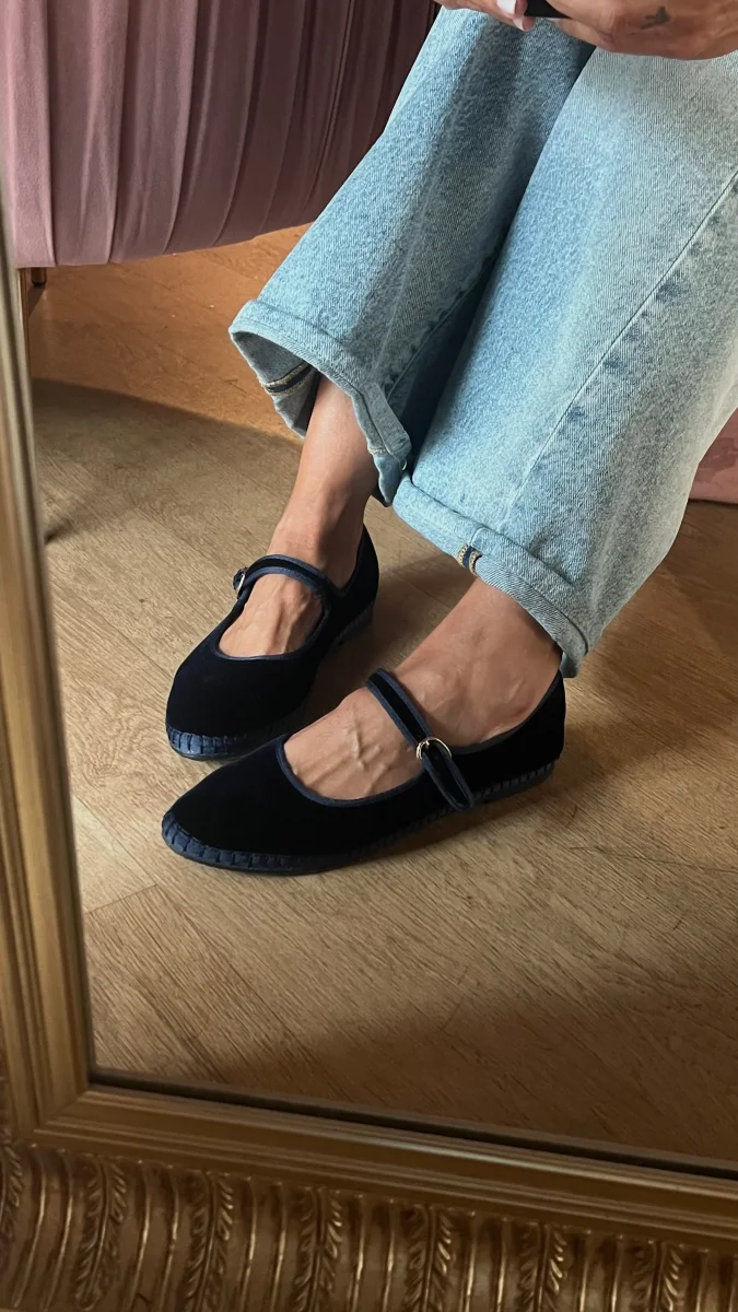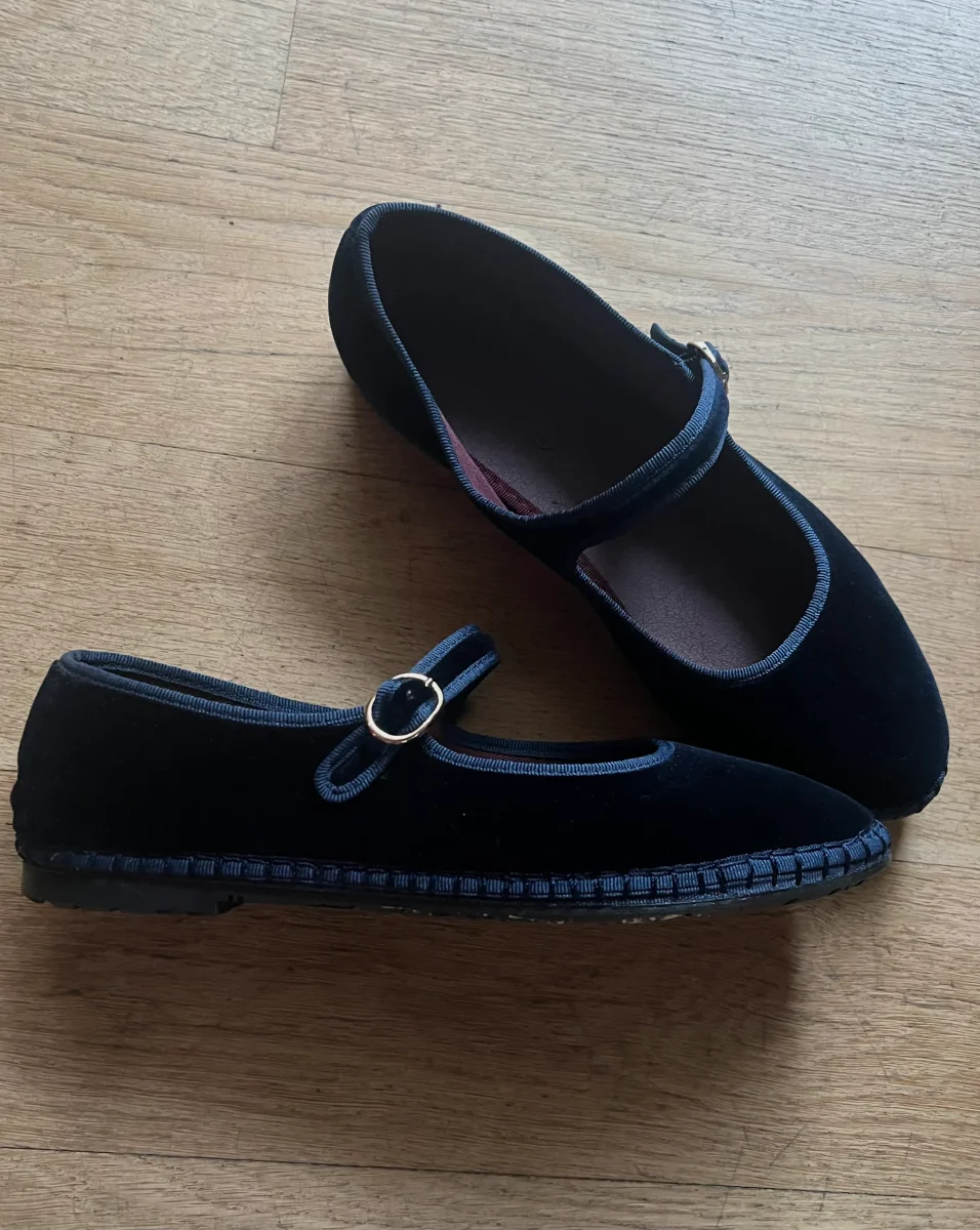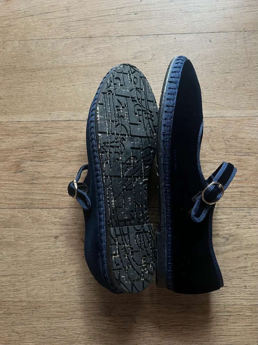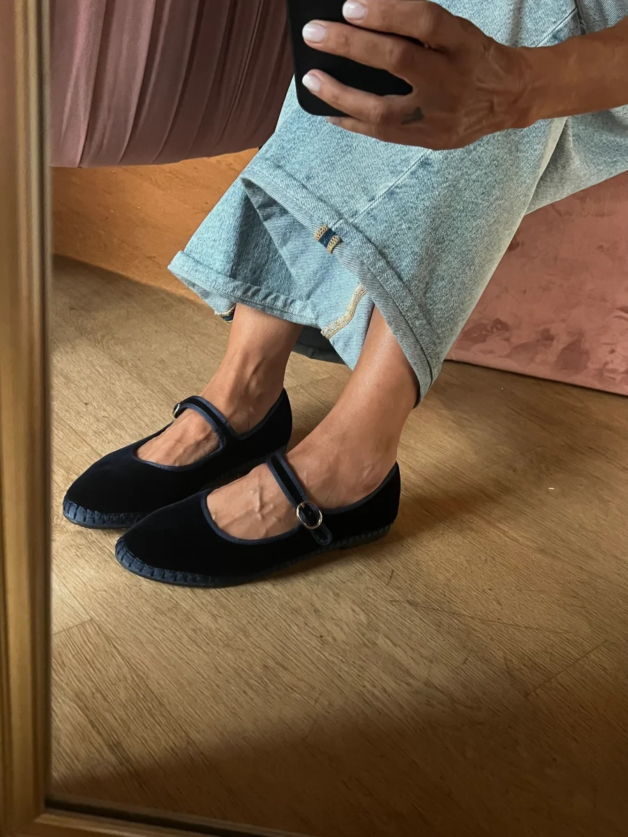 - Mary Jane in velluto color blu con profili color blu e chiusura con fibbia.