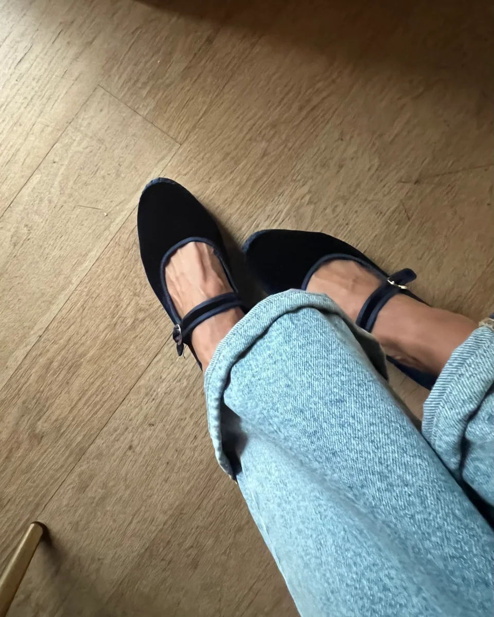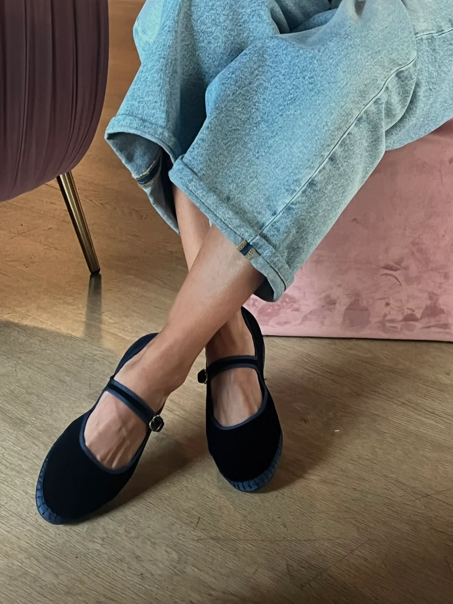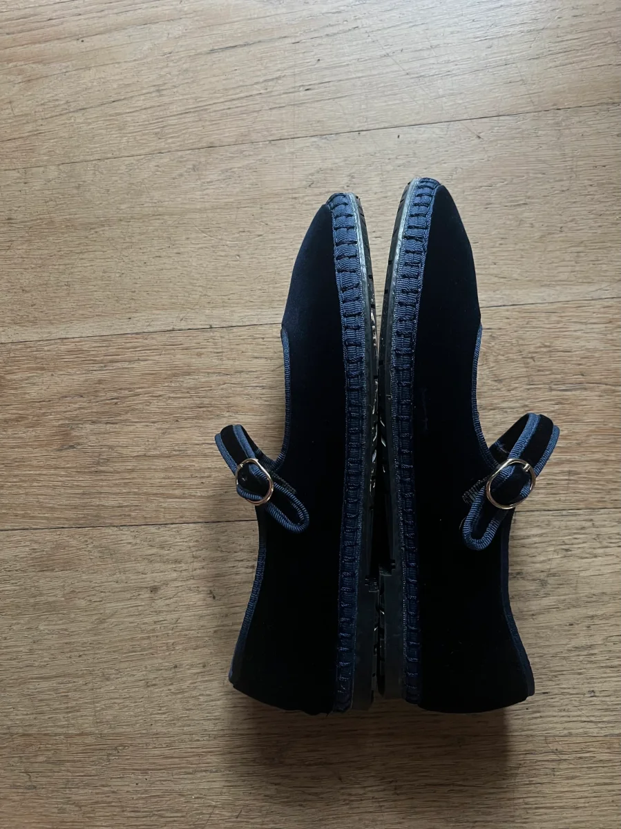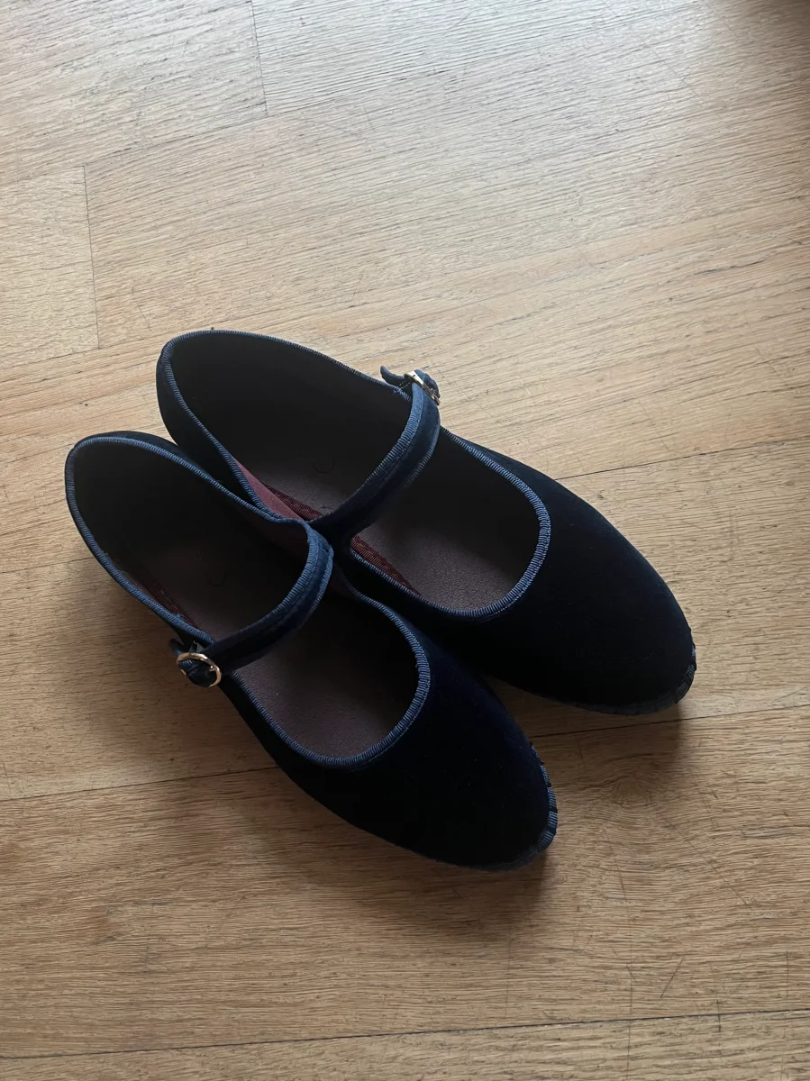 - Mary Jane in velluto color blu con profili color blu e chiusura con fibbia.