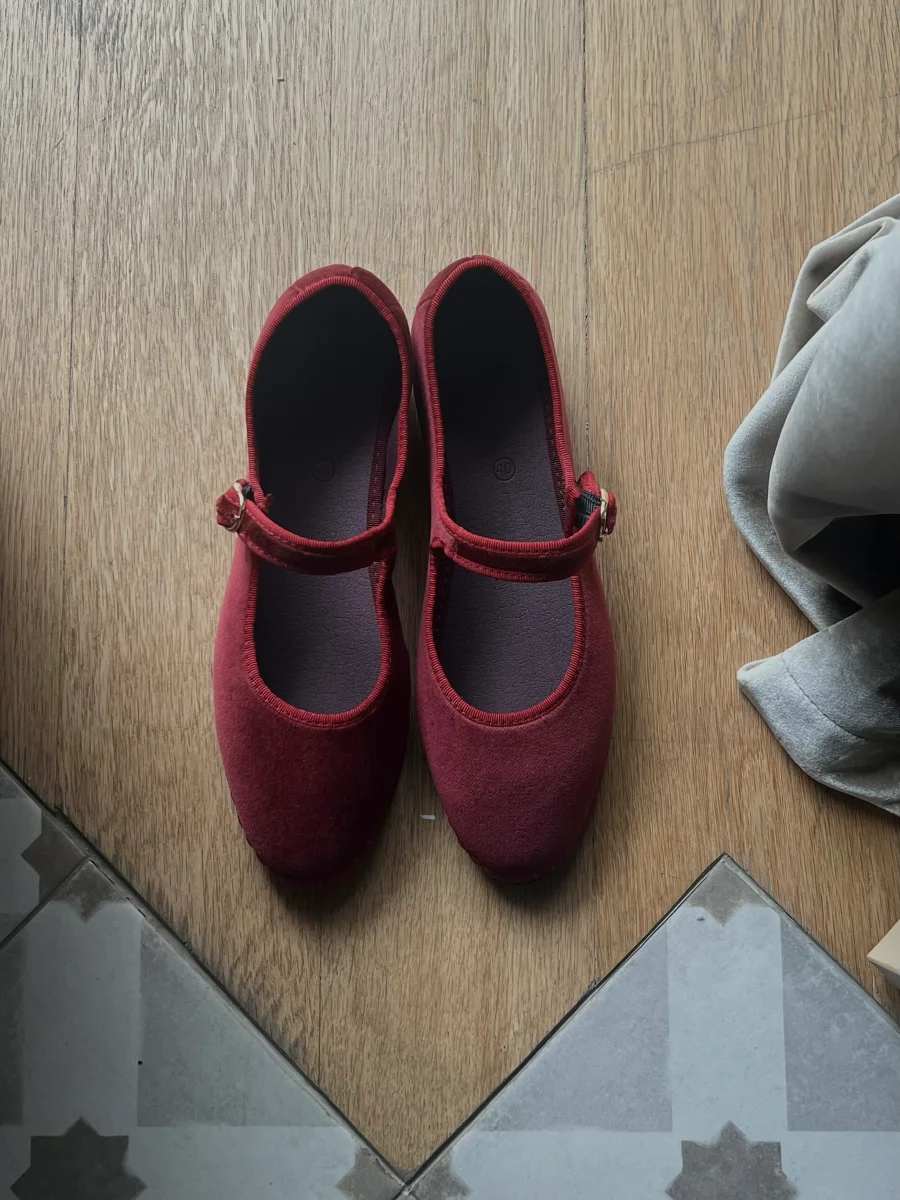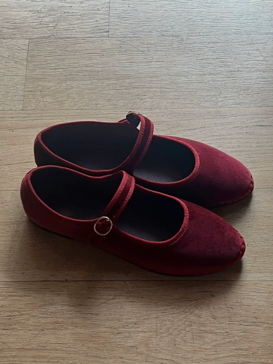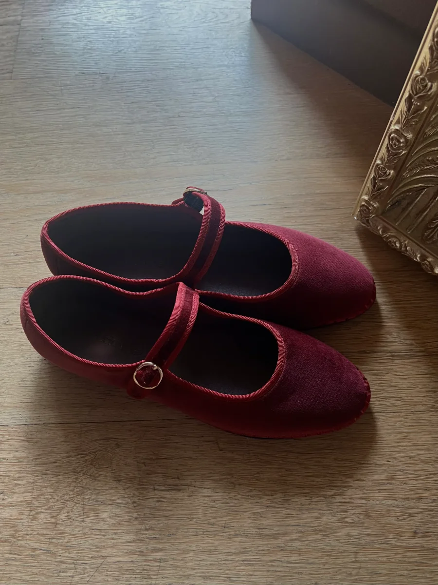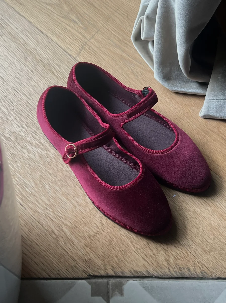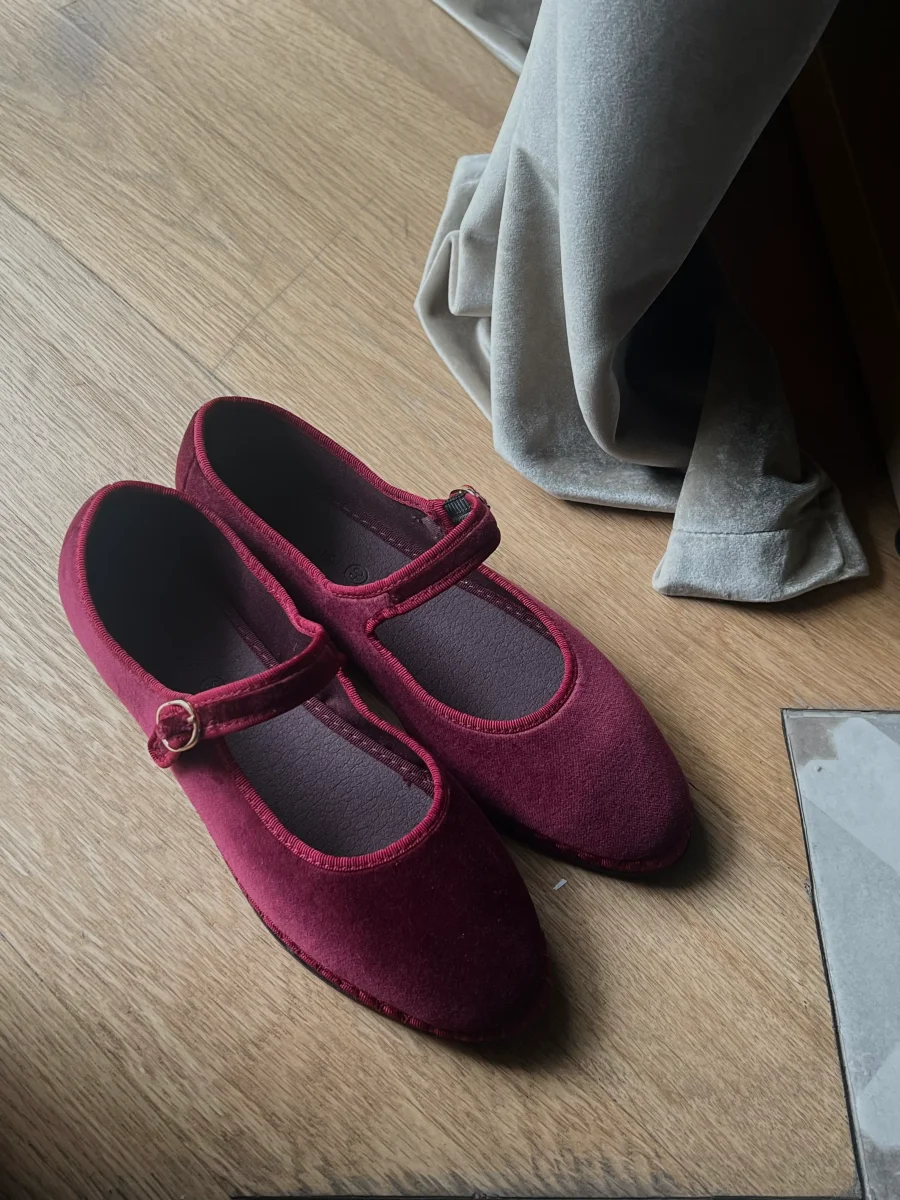 - Mary Jane in velluto color bordeaux con profili color bordeaux e chiusura con fibbia.