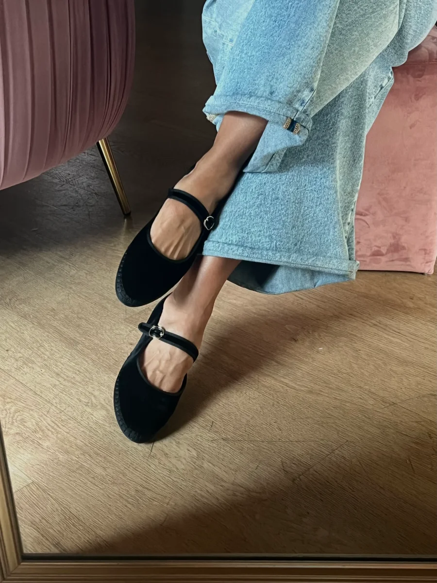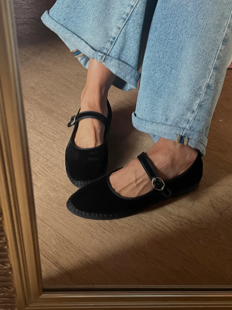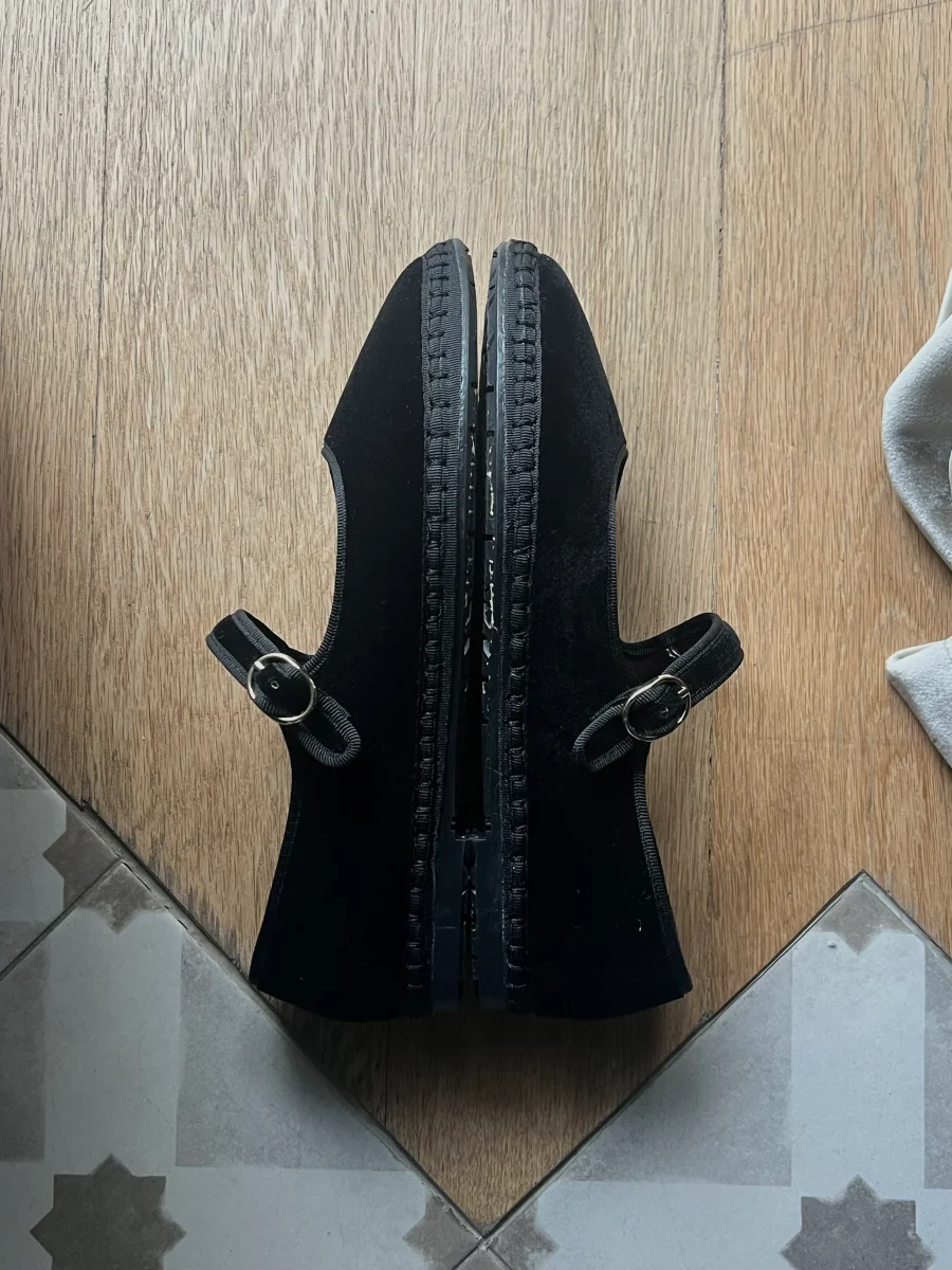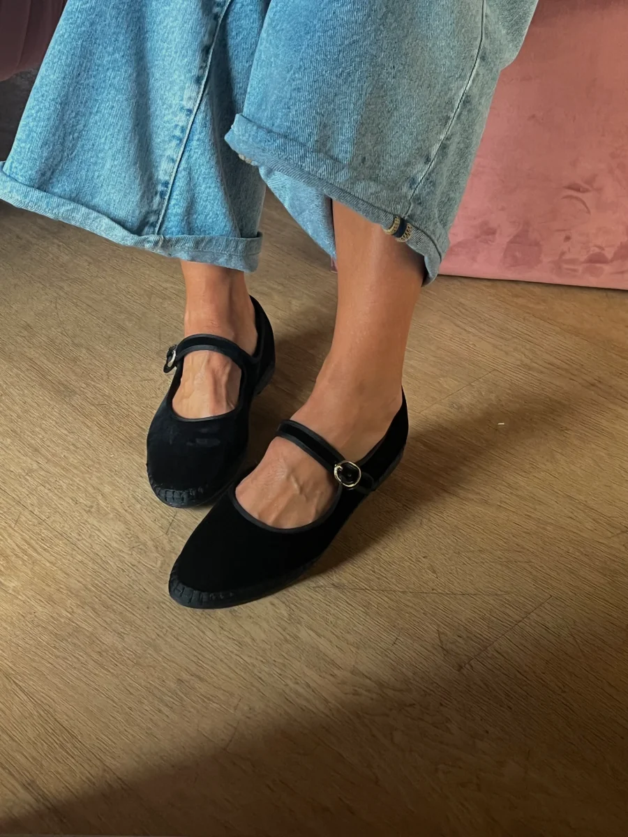 - Mary Jane in velluto color nero con profili color neri e chiusura con fibbia.