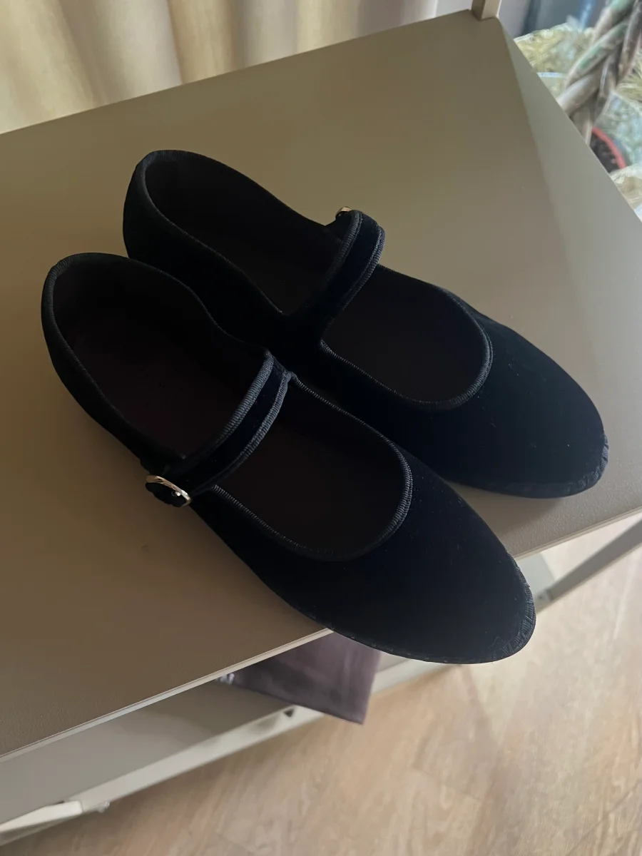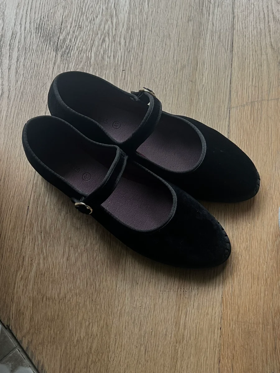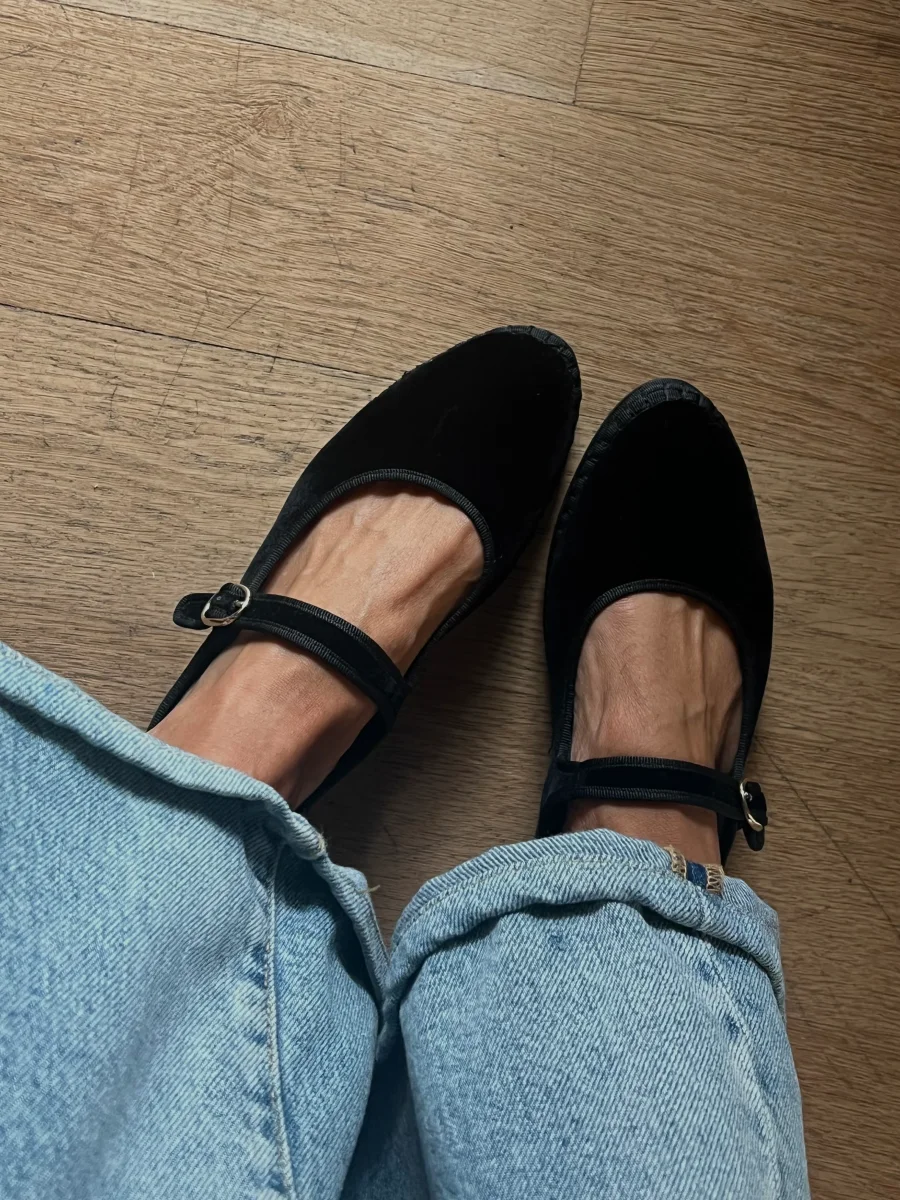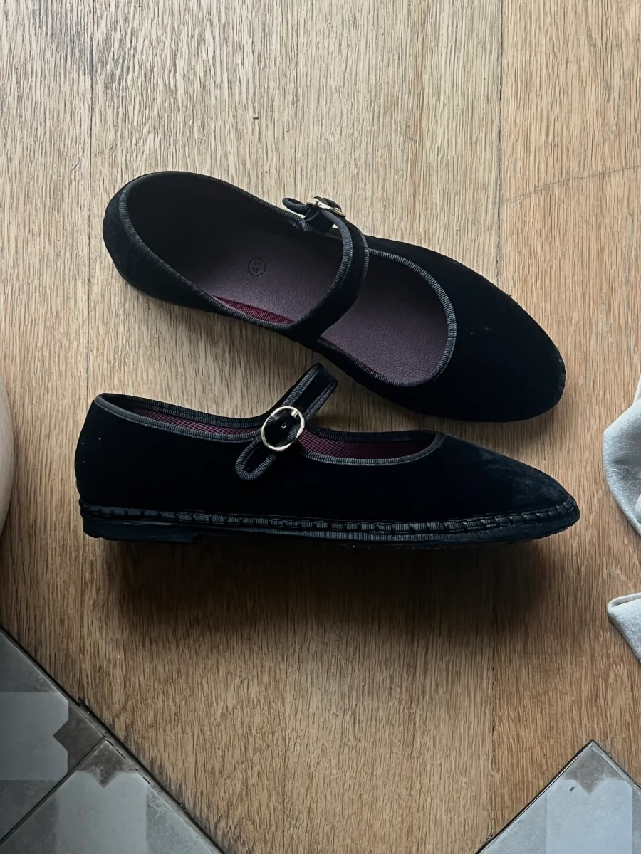 - Mary Jane in velluto color nero con profili color neri e chiusura con fibbia.