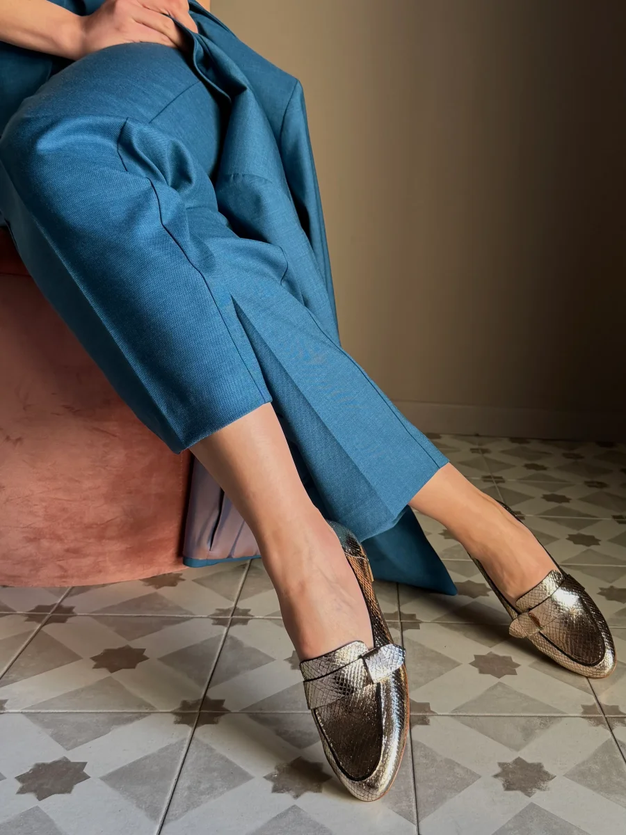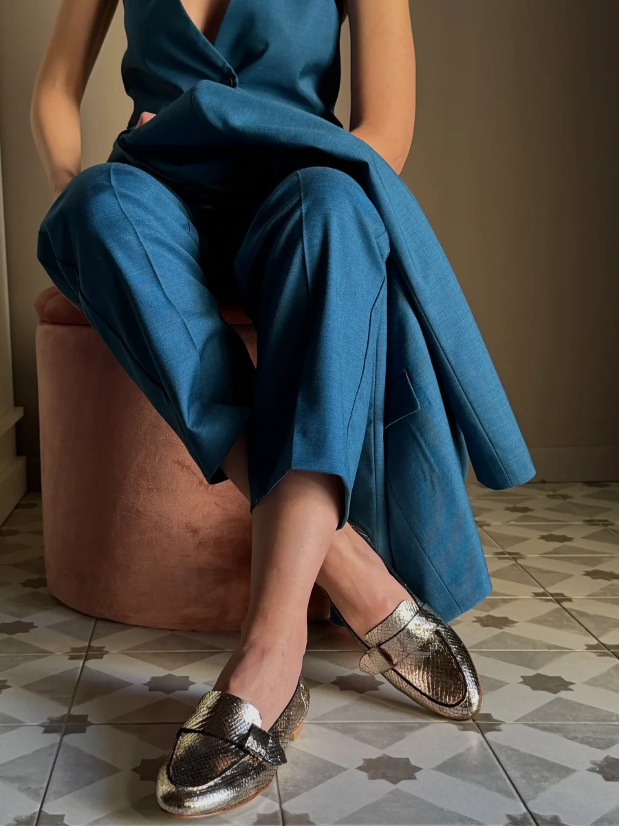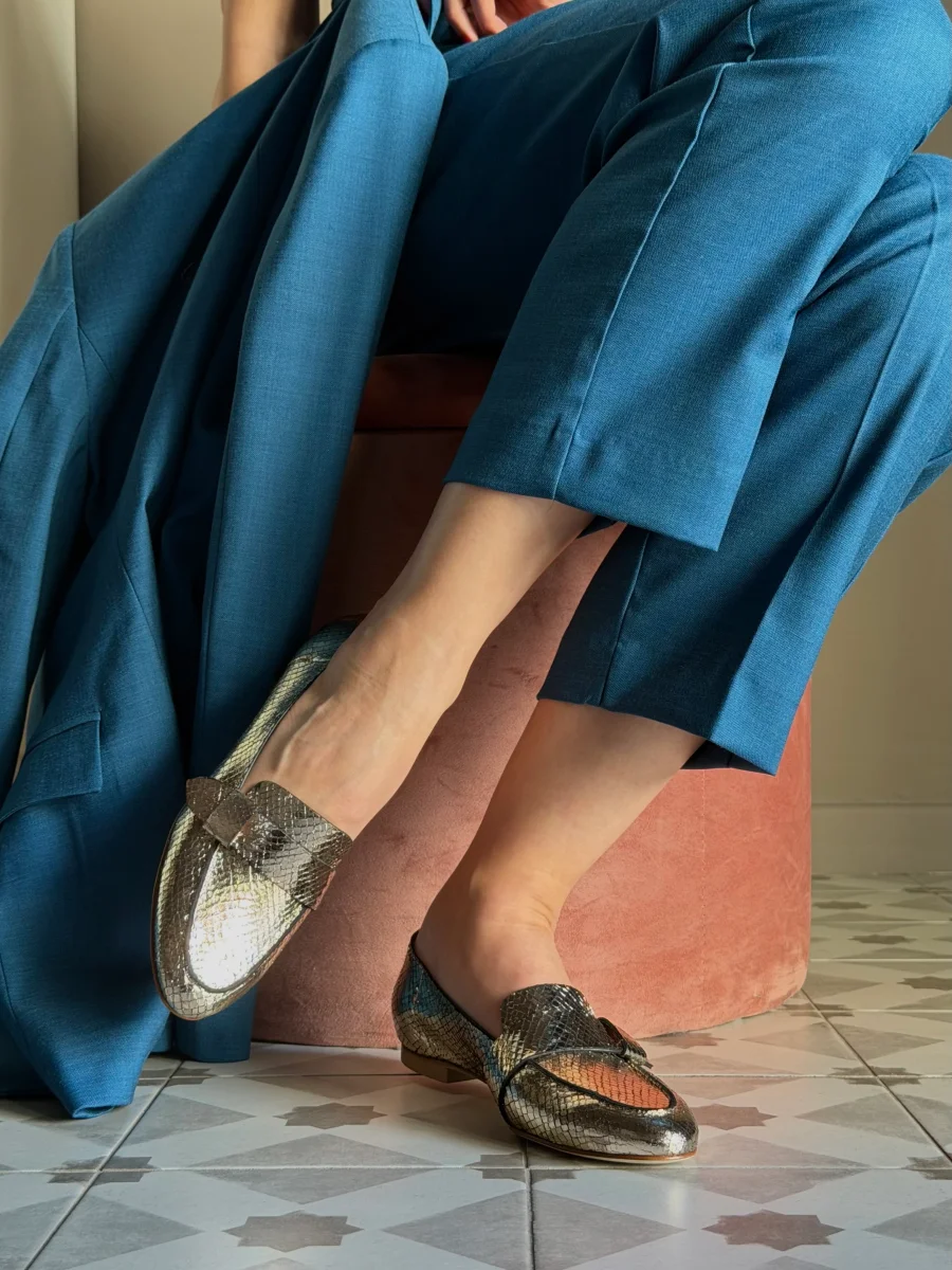 In store la chiamiamo la ‘scarpa trasformista’. Guardatela con il completo blu: rompe la serietร  del tailleur con un guizzo di luce magnetico. Ma provatela anche con un jeans alla caviglia e una camicia oversize: trasforma un look quotidiano in qualcosa di straordinario. รˆ l’investimento perfetto per chi vuole brillare senza rinunciare alla comoditร  del tacco flat.