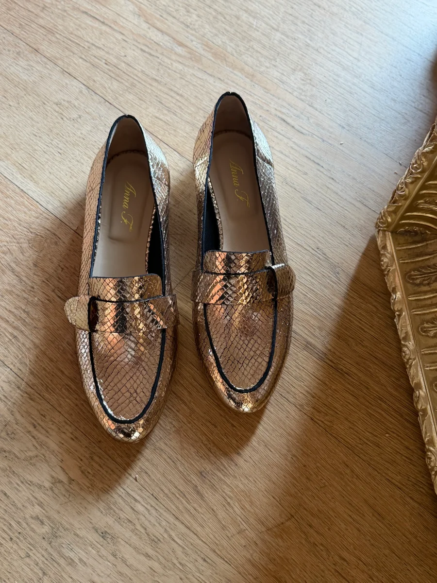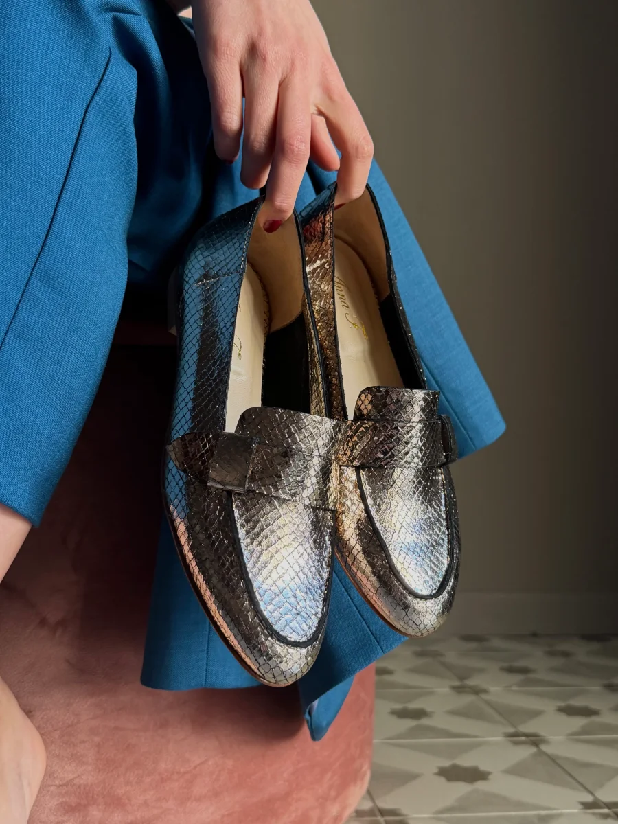 La luce ai tuoi piedi. Questa loafer firmata Anna F. rappresenta la sintesi perfetta tra la struttura classica della scarpa maschile e una femminilitร  audace e luminosa. Realizzata interamente in pregiata pelle 100%, si distingue per l’esclusiva stampa whips che conferisce alla tomaia una texture tridimensionale e sofisticata. Il colore Platino non รจ solo una […]