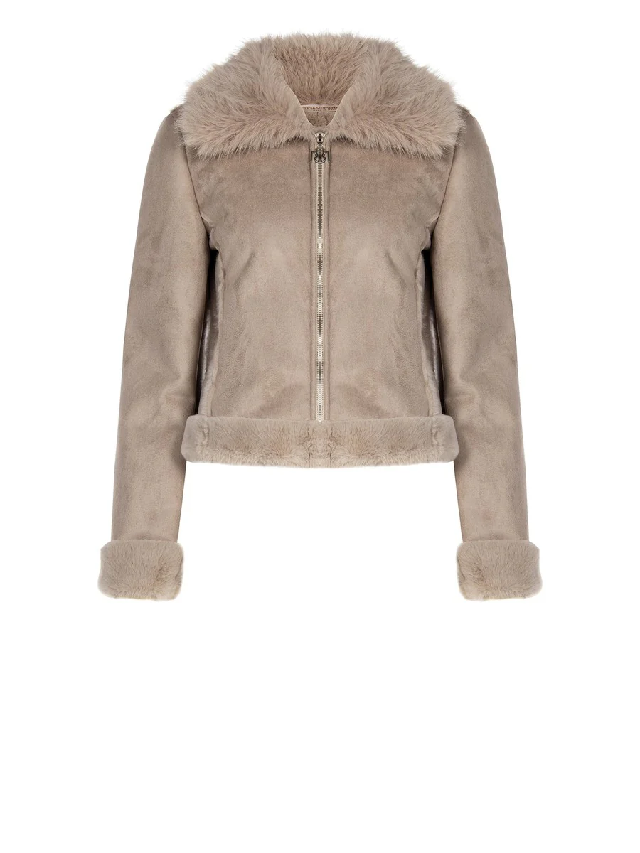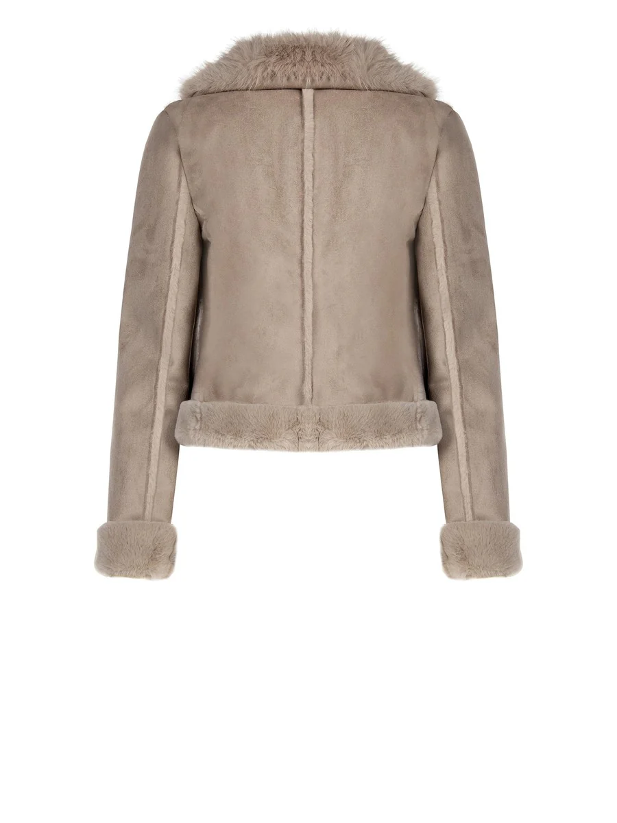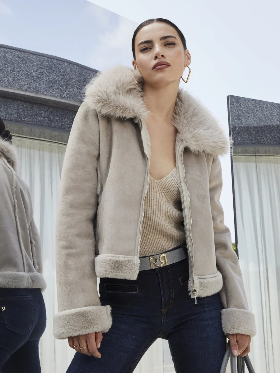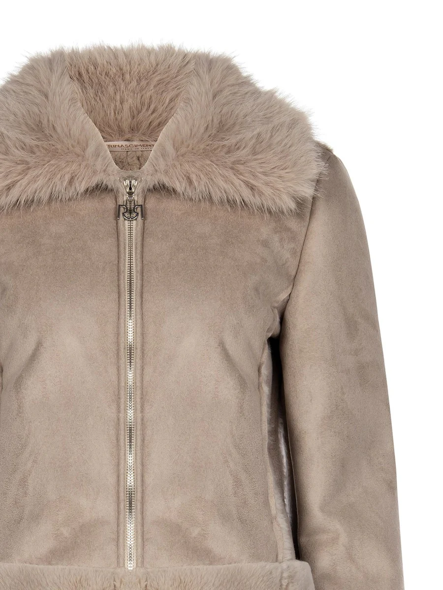 - Eco-pelliccia al collo e alle maniche – dettaglio luxury e cruelty-free