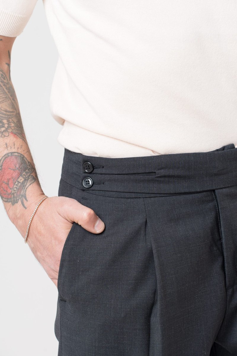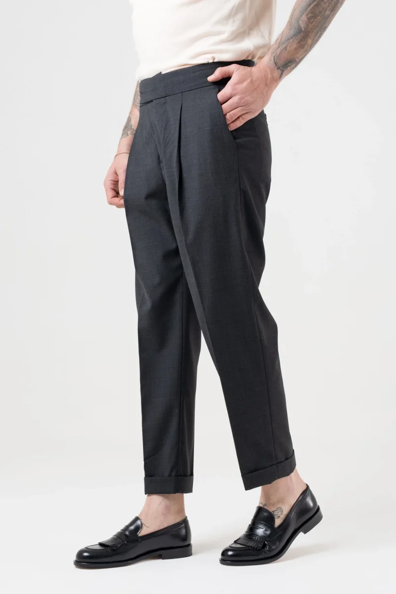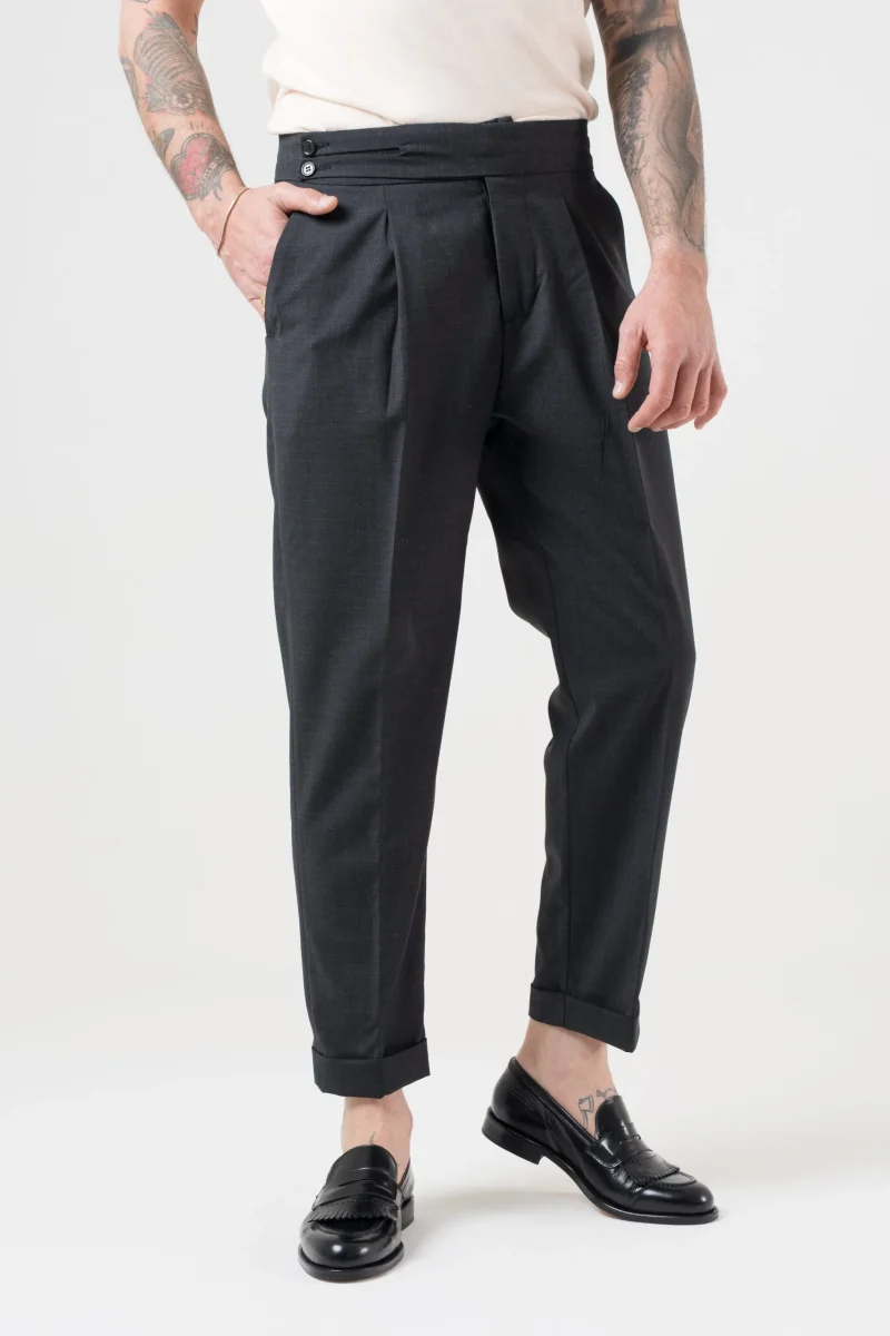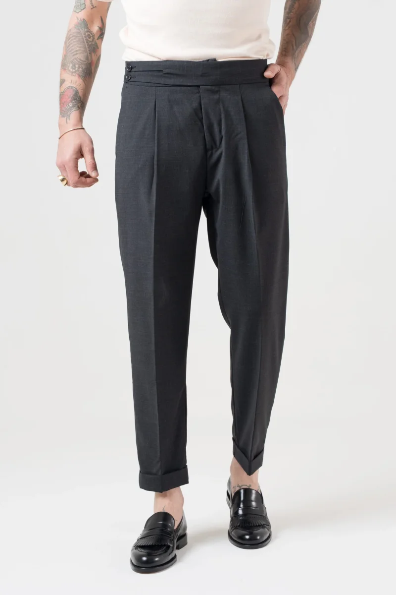 Questo pantalone sartoriale con pinces รจ lโemblema dellโeleganza contemporanea, perfetto per chi cerca un capo raffinato con una vestibilitร impeccabile. Caratterizzato da una vita alta e una cintura a doppia abbottonatura laterale, questi pantaloni offrono una silhouette pulita e slanciata. Le pinces frontali aggiungono volume e comfort, garantendo una caduta perfetta lungo la gamba. Lโorlo con risvolto dona un tocco moderno e sofisticato, ideale da abbinare sia con scarpe eleganti che con mocassini per uno stile piรน casual ma sempre curato.