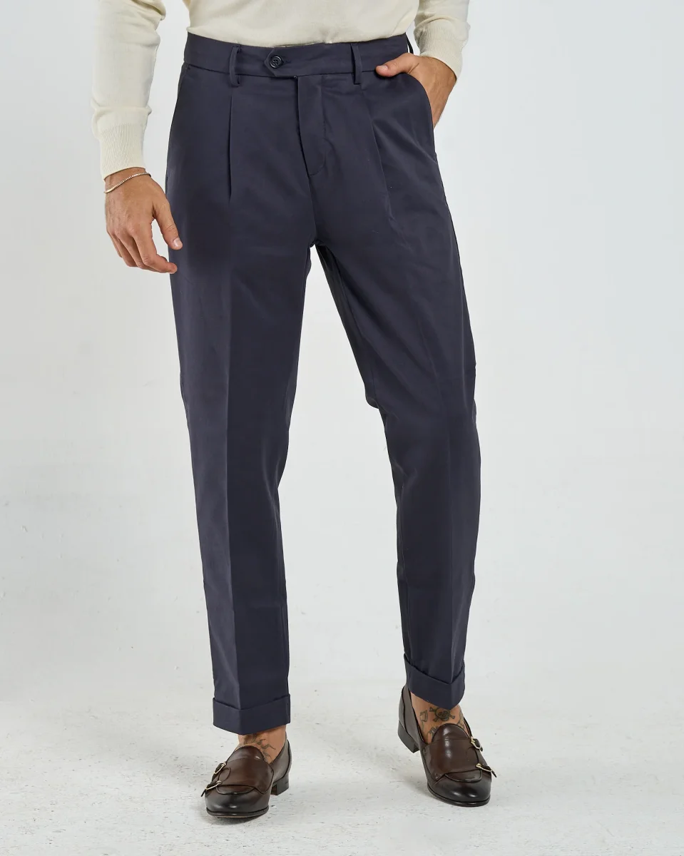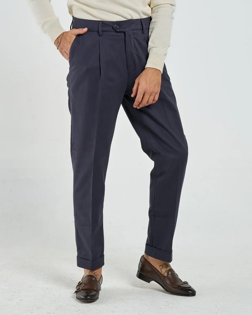 Un pantalone in cotone che unisce lo stile sartoriale alla freschezza quotidiana rendendolo ideale sia per look formali da ufficio che per outfit smart-casual nel tempo libero. Le pinces frontali richiamano lโeleganza classica, la vestibilitร รจ dritta e leggermente affusolata verso il fondo, con risvolto alla caviglia che aggiunge un dettaglio raffinato e contemporaneo.