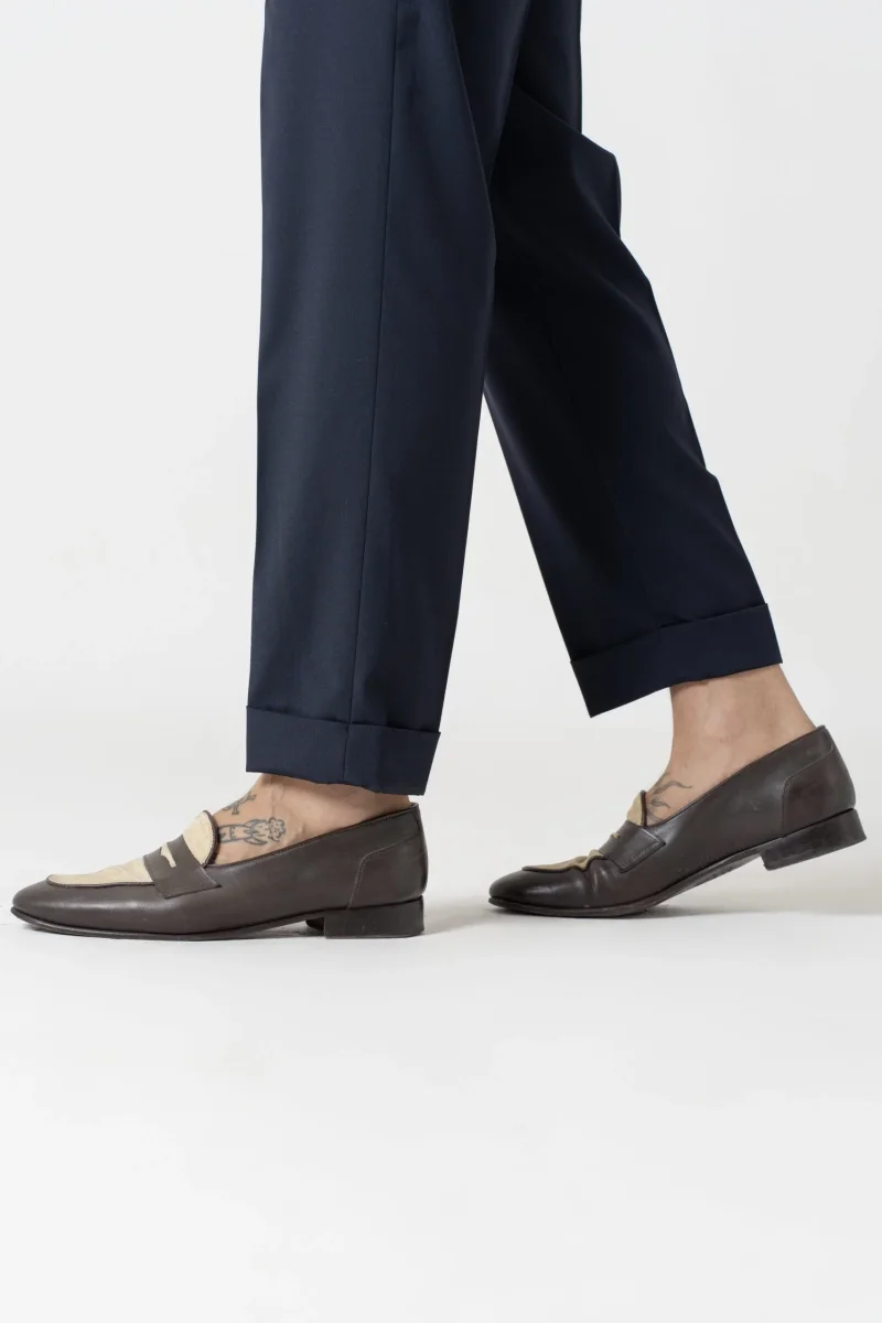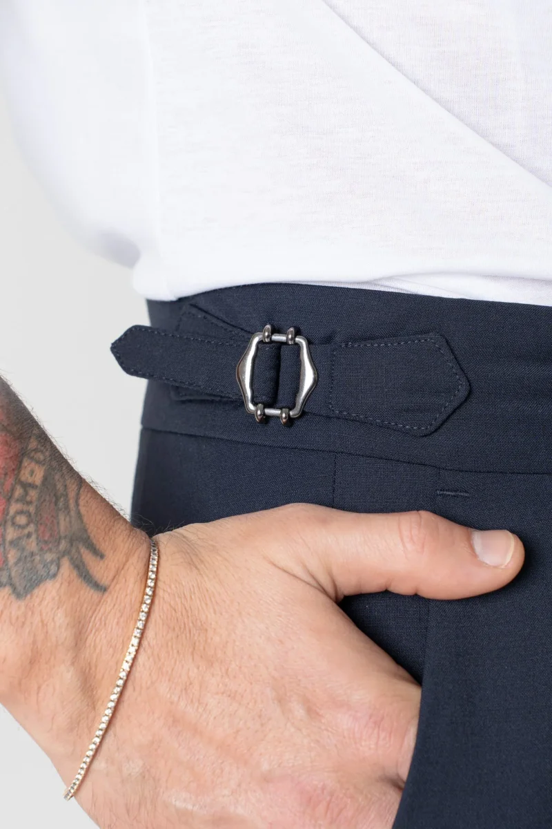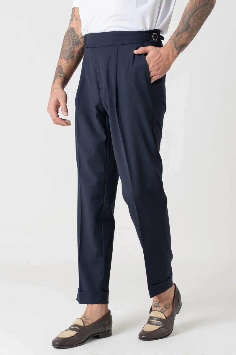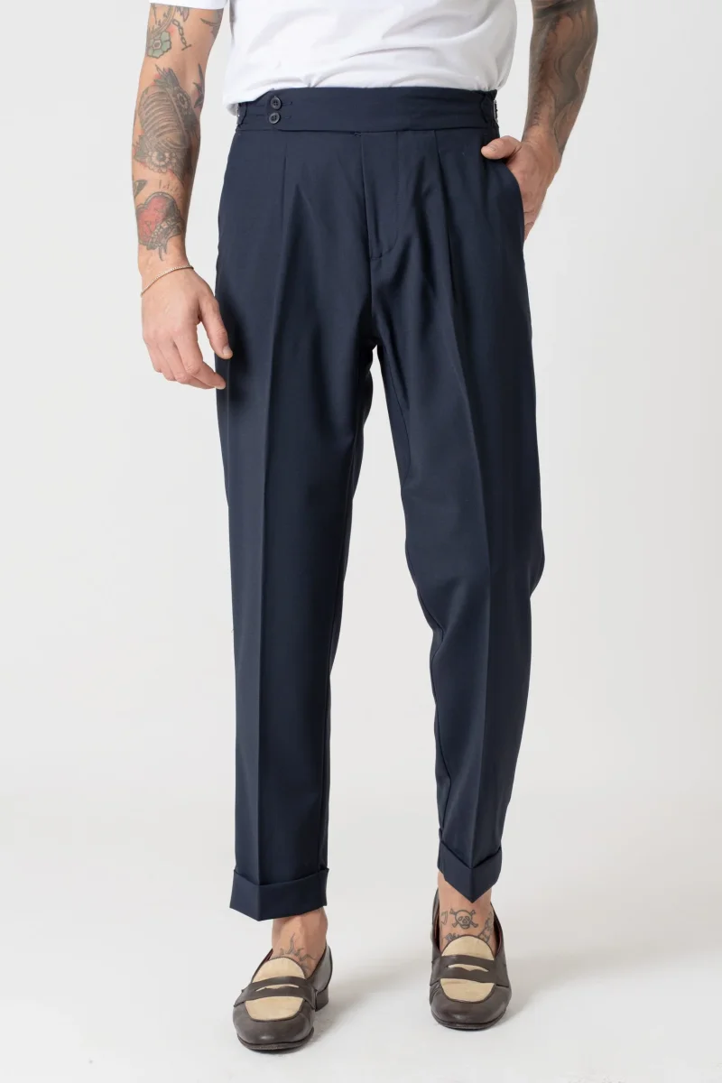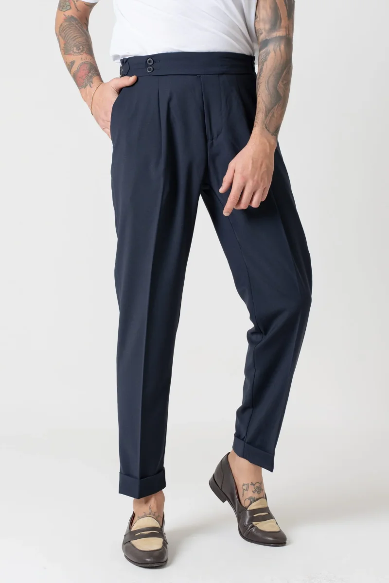Pantalone vita alta con bustino tondo dotato di doppia abbottonatura e fibbiette regolatori laterali per una vestibilitร perfetta, 1 pence frontale che aggiunge struttura e movimento al pantalone.