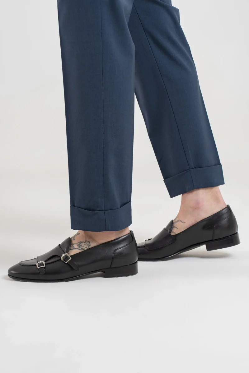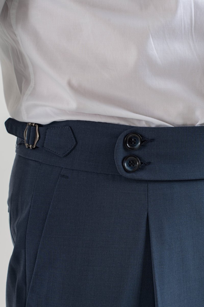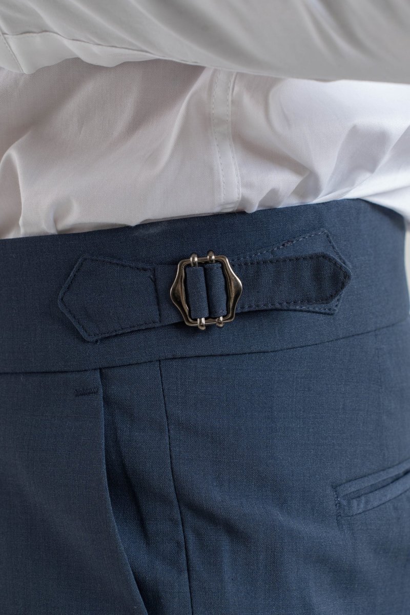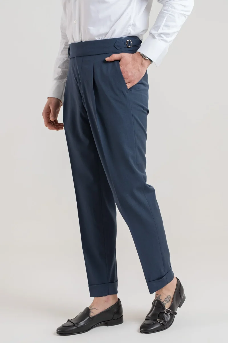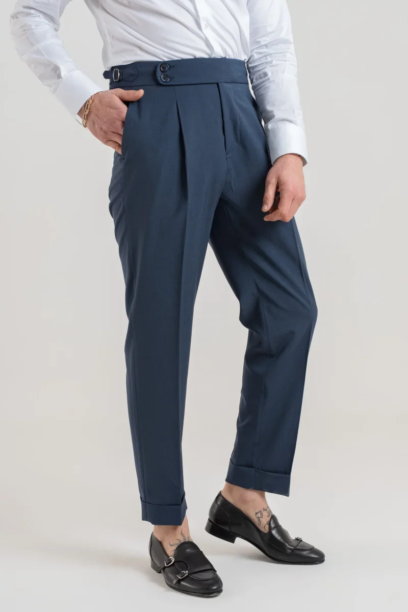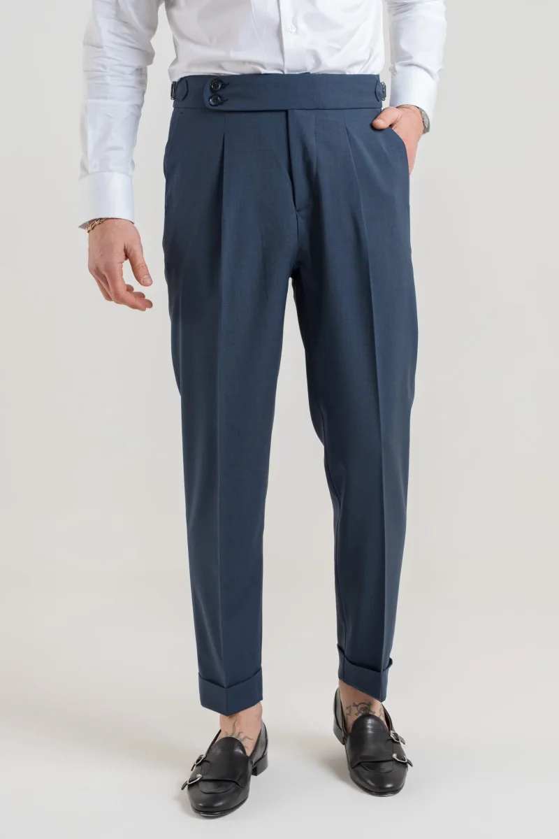 Pantalone vita alta con bustino tondo dotato di doppia abbottonatura e fibbiette regolatori laterali per una vestibilitร perfetta, 1 pence frontale che aggiunge struttura e movimento al pantalone.