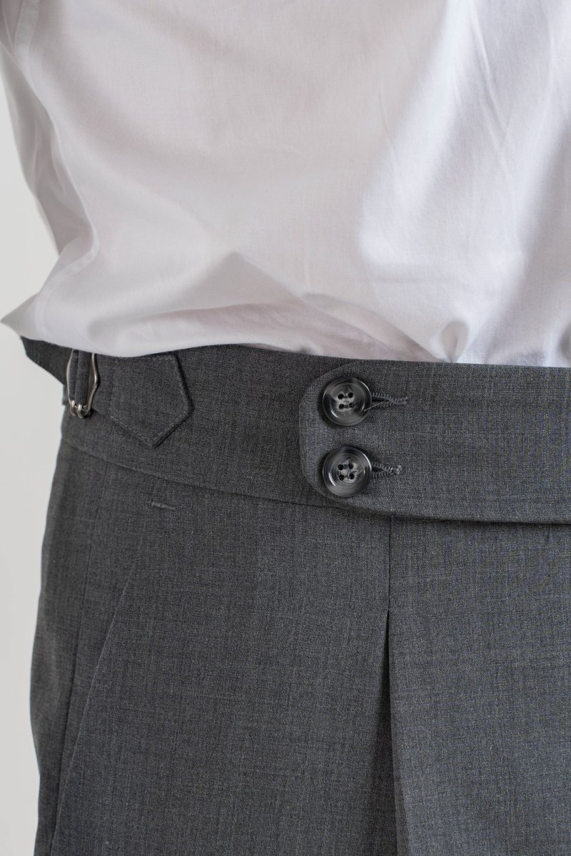 Pantalone vita alta con bustino tondo dotato di doppia abbottonatura e fibbiette regolatori laterali per una vestibilitร perfetta, 1 pence frontale che aggiunge struttura e movimento al pantalone.
