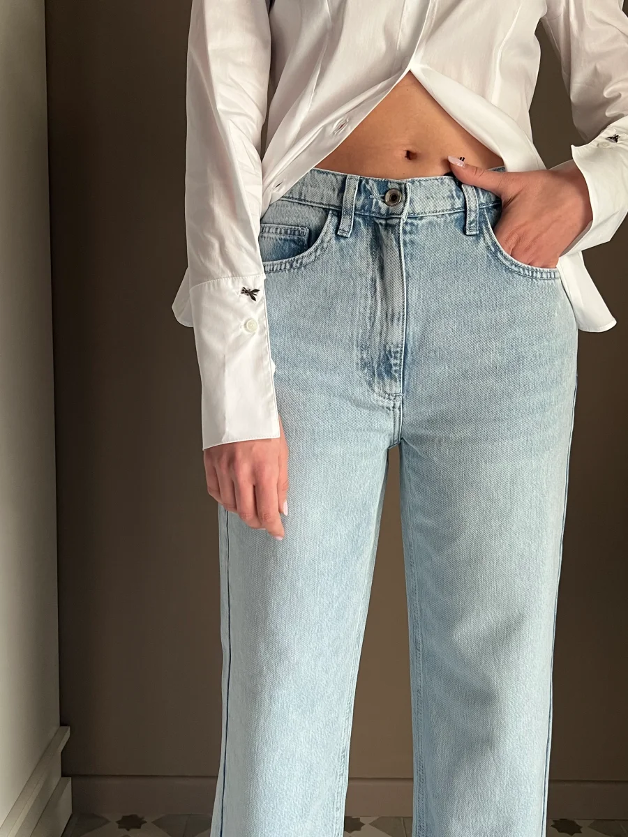 Questo jeans รจ una vera “tela bianca”: abbinalo alla nostra camicia sagomata Patrizia Pepe e a un tacco a punta per un look power casual da urlo, proprio come vedi in foto. Per il tempo libero, scambia i tacchi con una sneaker platform e aggiungi un maglione over color burro.