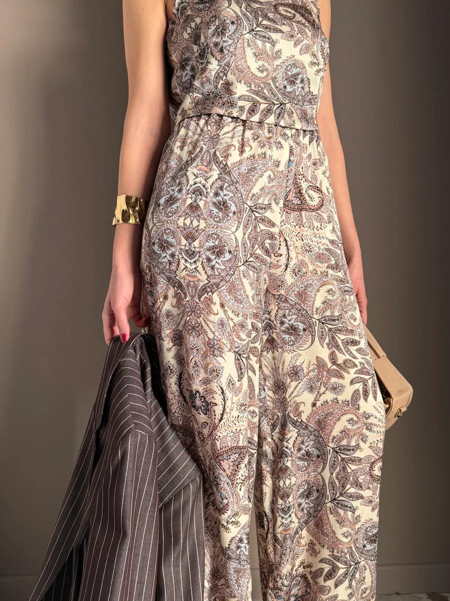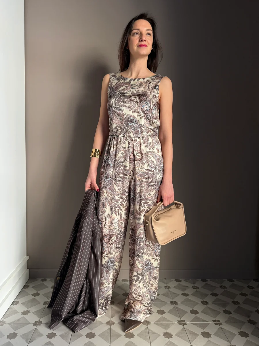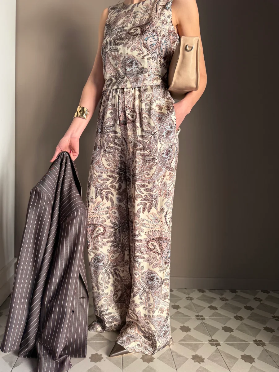 โร il pantalone perfetto da mettere in valigia: non occupa spazio, non pesa e ti risolve il look dalla mattina in ufficio con una camicia over, alla sera con il suo top coordinato e una scarpa a punta.”