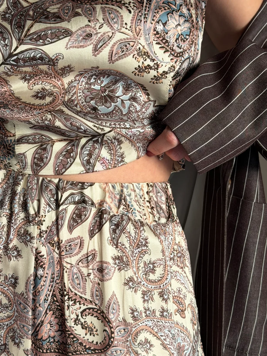 โข La Stampa: Una raffinata trama Paisley (cachemire) nei toni caldi della terra e del corda, perfetta per aggiungere carattere a un look monocromatico o per creare un set coordinato di grande impatto.