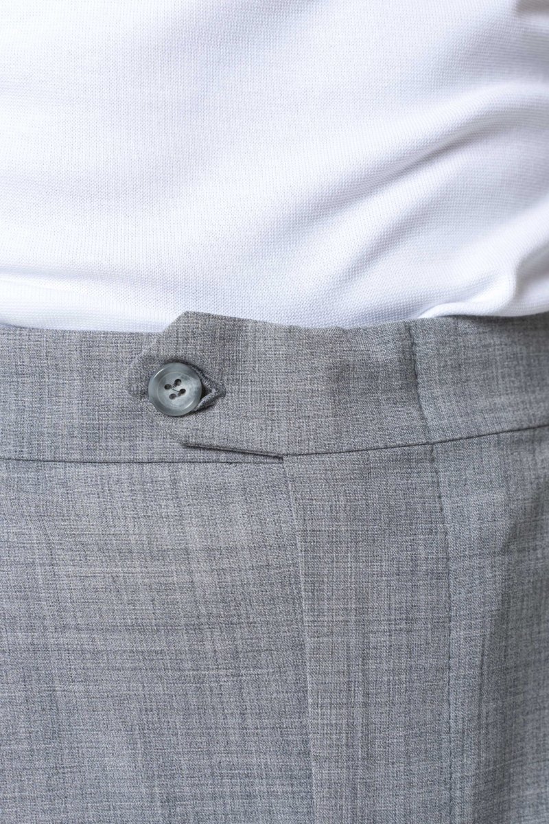 Bustino vita alta con abbottonatura mono-bottone, doppia pence, gamba dritta, fondo largo con piega inglese di 2,5cm.