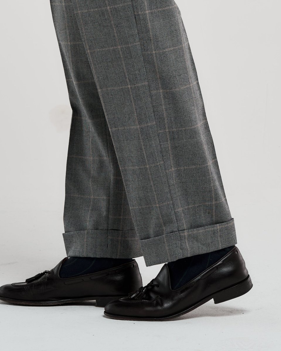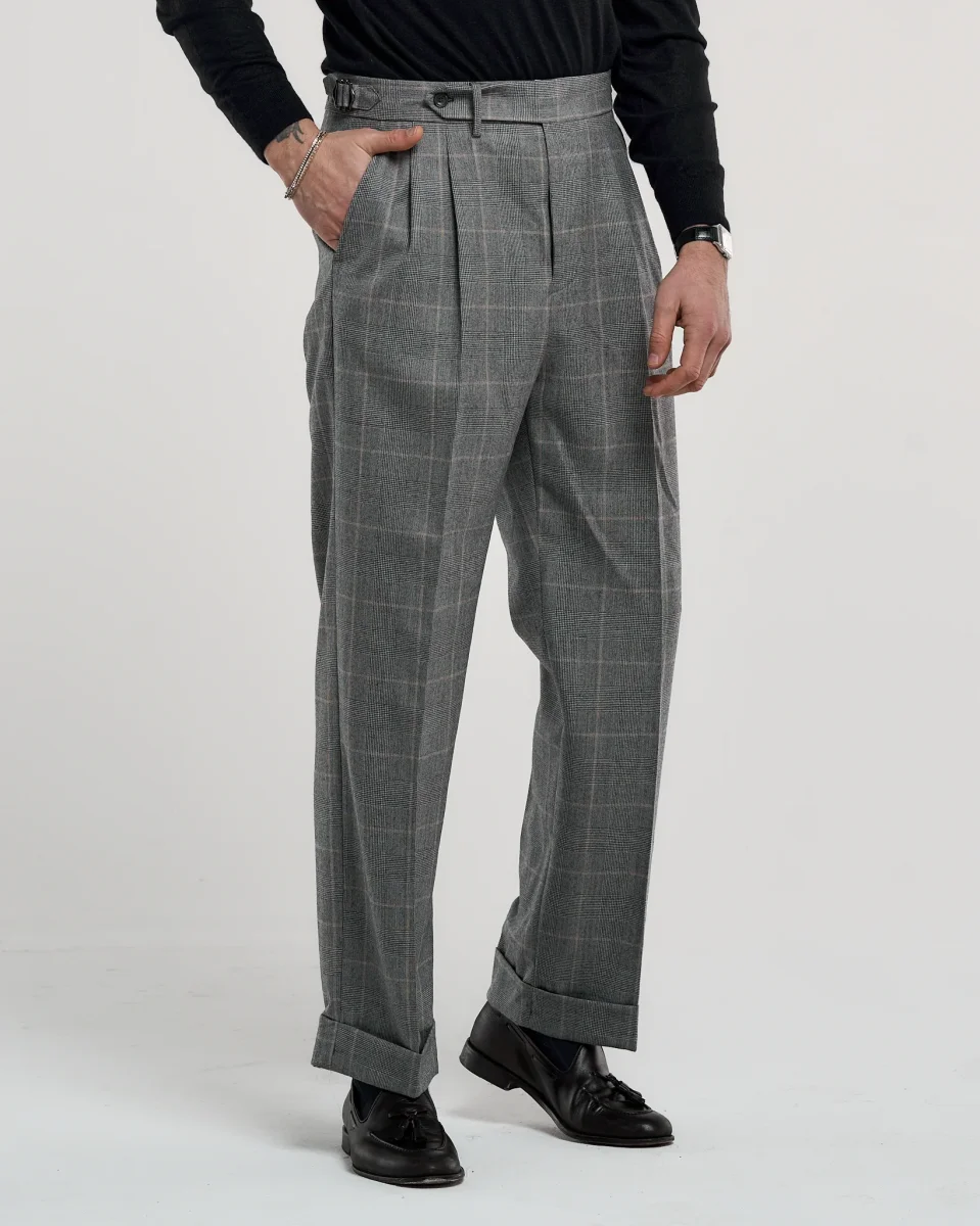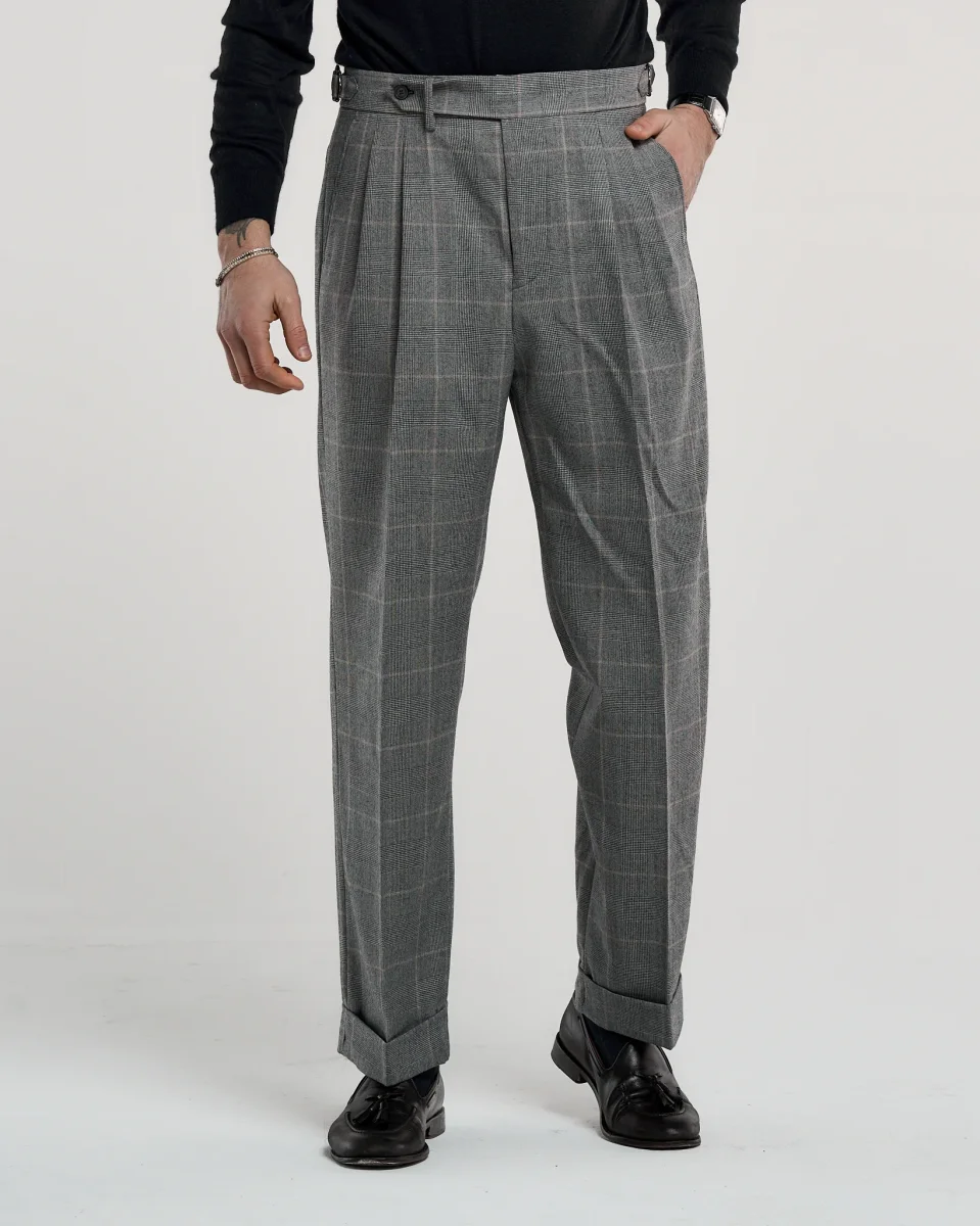 Pantalone Fondo Ampio e Fibbie Laterali in Lana Principe di Galles Grigio Chiaro