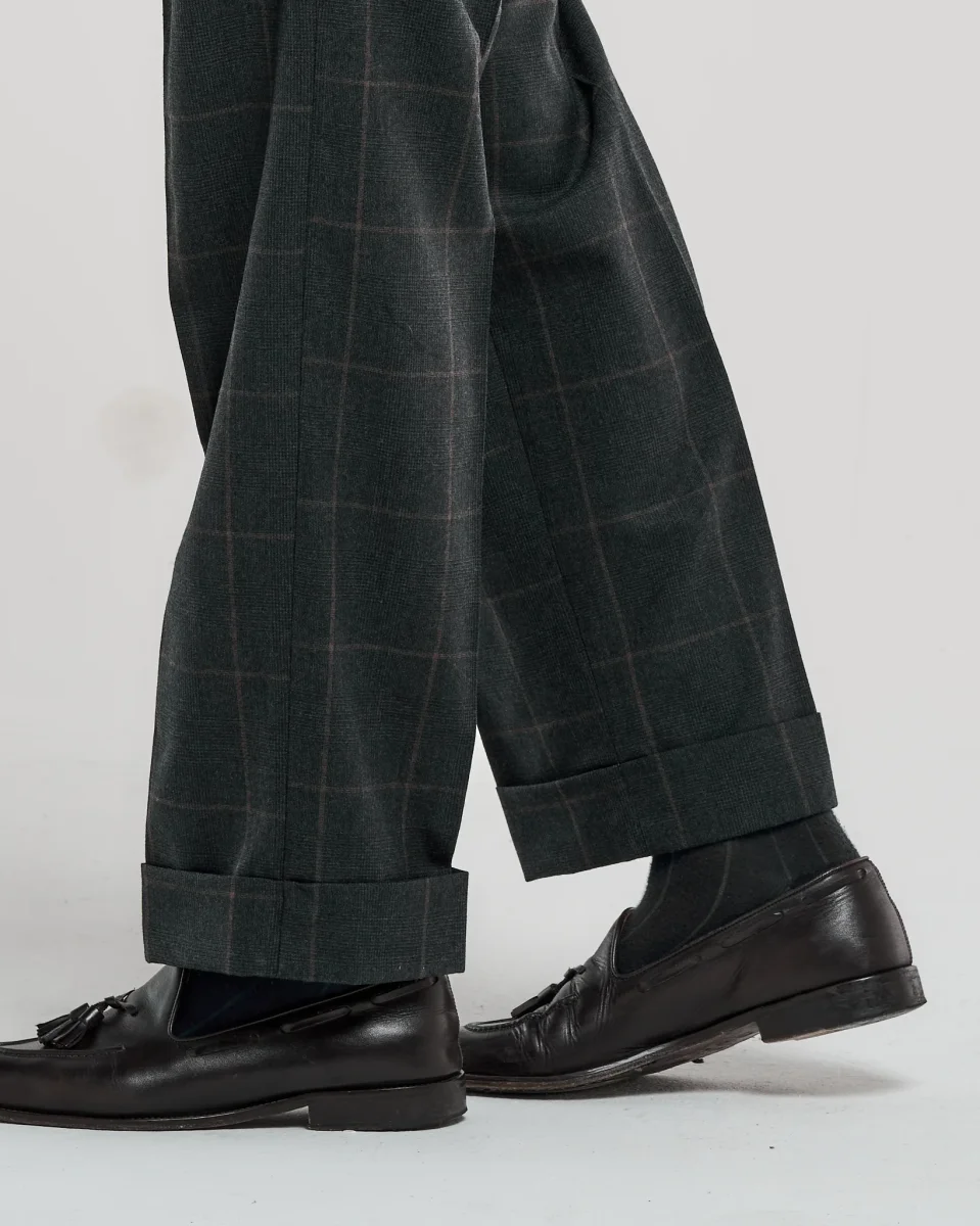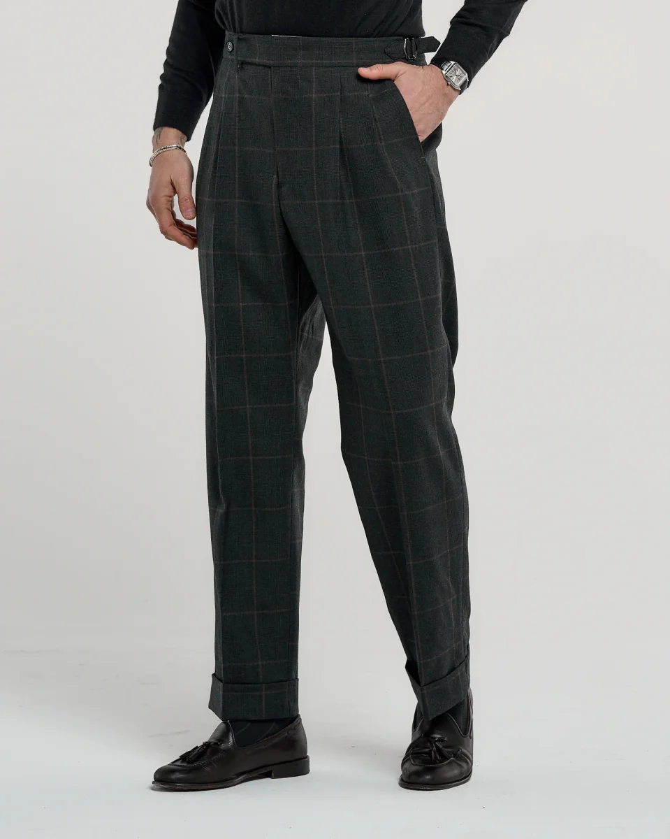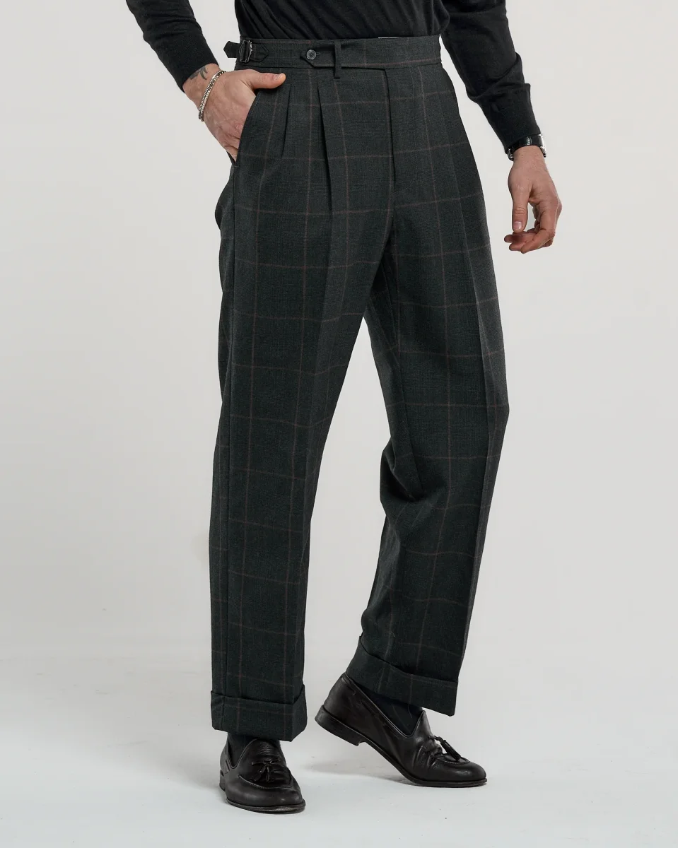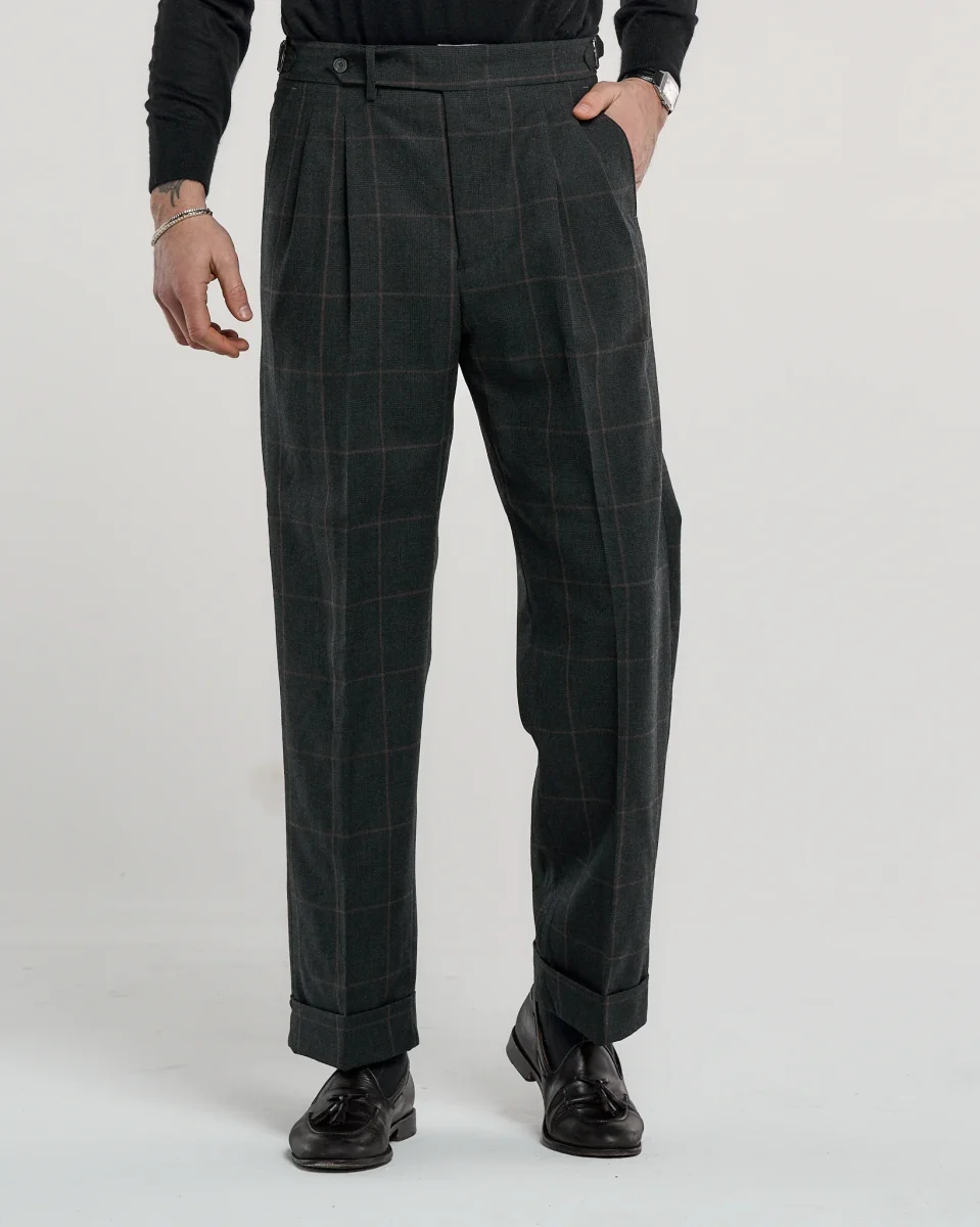 Pantalone Fondo Ampio e Fibbie Laterali in Lana Principe di Galles Grigio Scuro