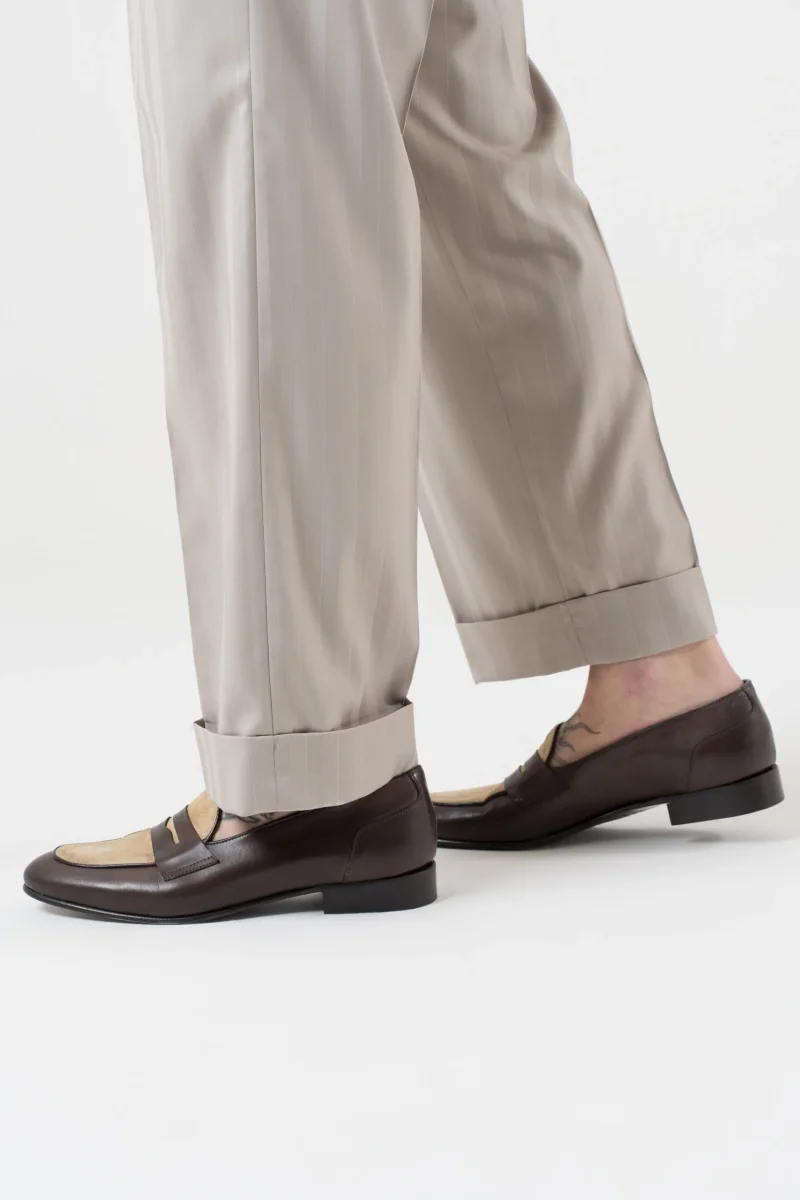 โข Dettagli: Fibbie laterali regolabili, pinces frontali, risvolto da 5 cm