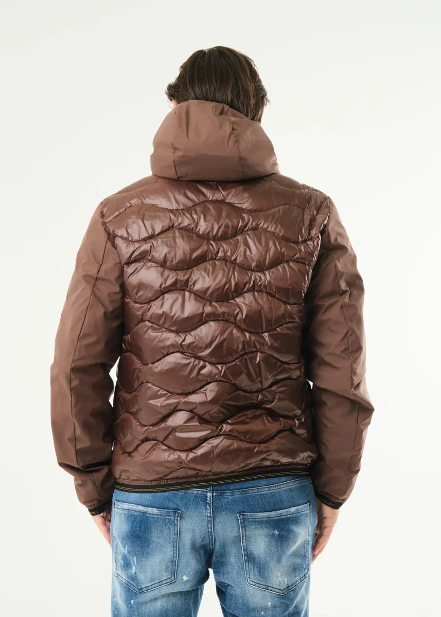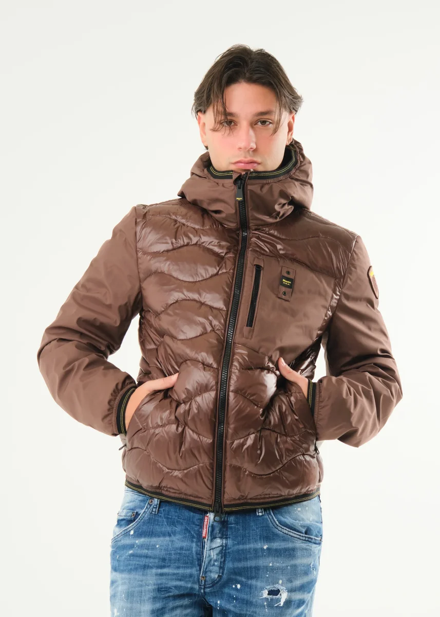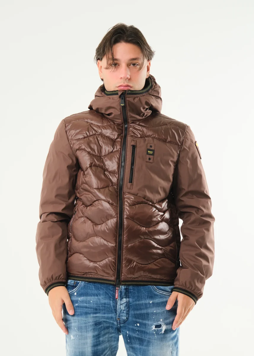 Piumino imbottitura mista Albert idrorepellente con neoprene leggero e liscio su maniche e corpo; e con nylon lucido impunturato ad onde. Cappuccio fisso, tasca applicata su petto sinistro, chiusura frontale con zip a doppio cursore, tasche laterali, patch e passante con logo