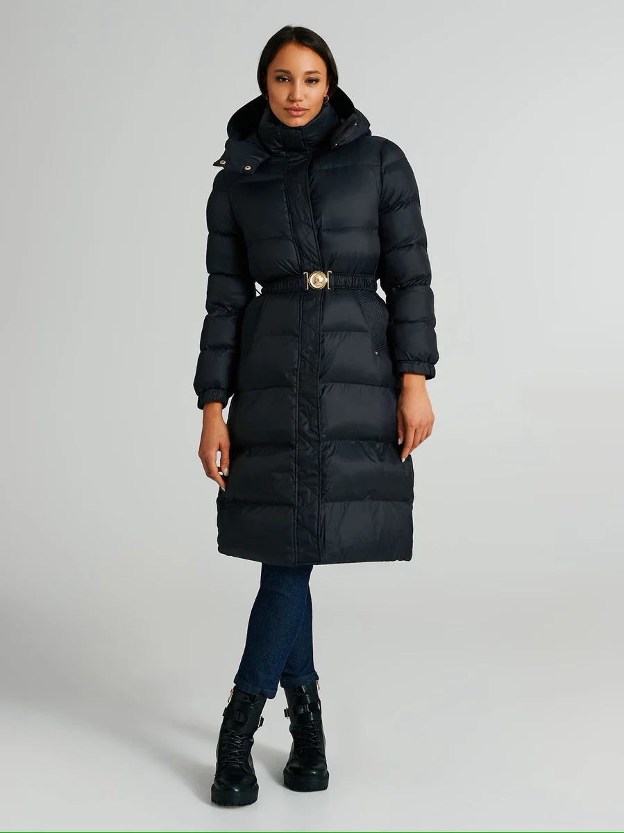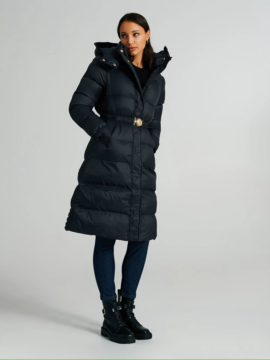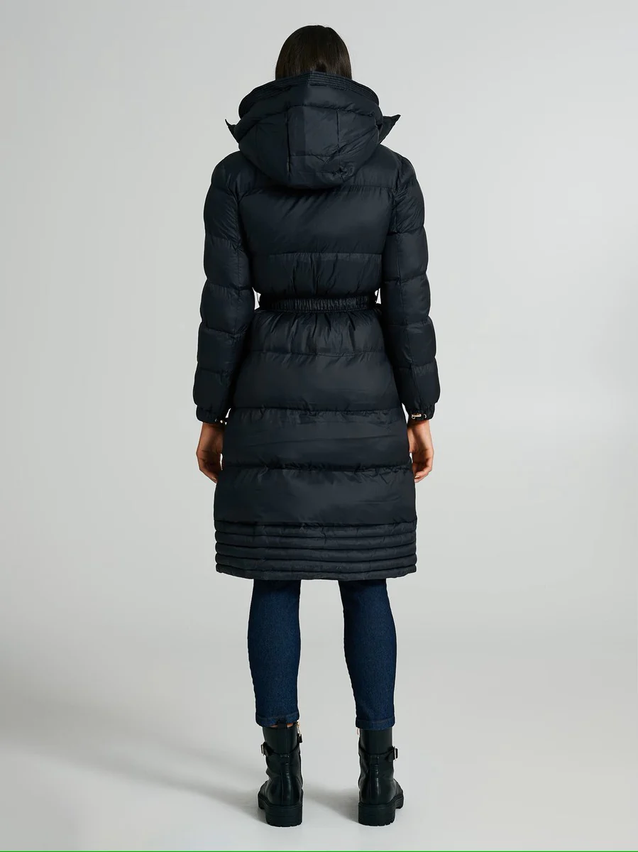 Piumino Lungo con Cappuccio e Cintura Elastica
