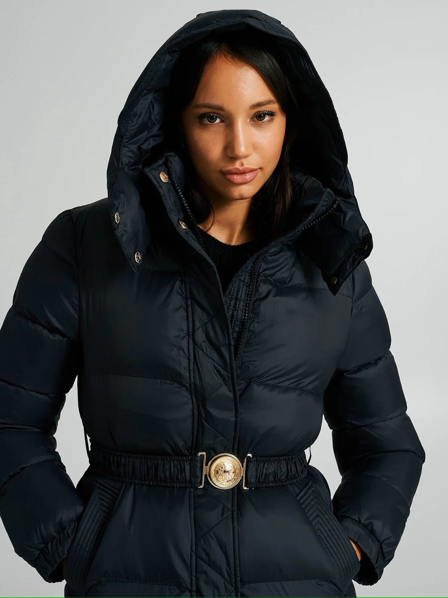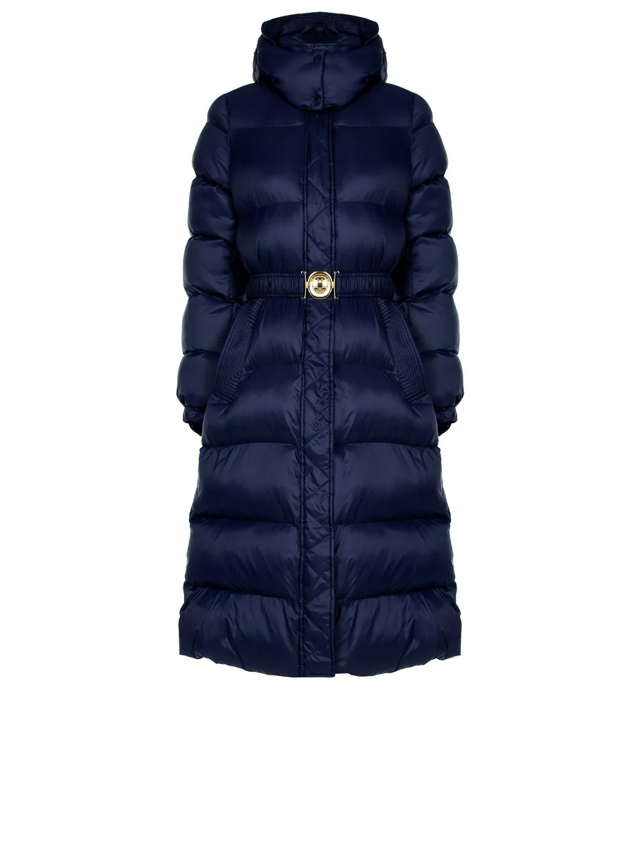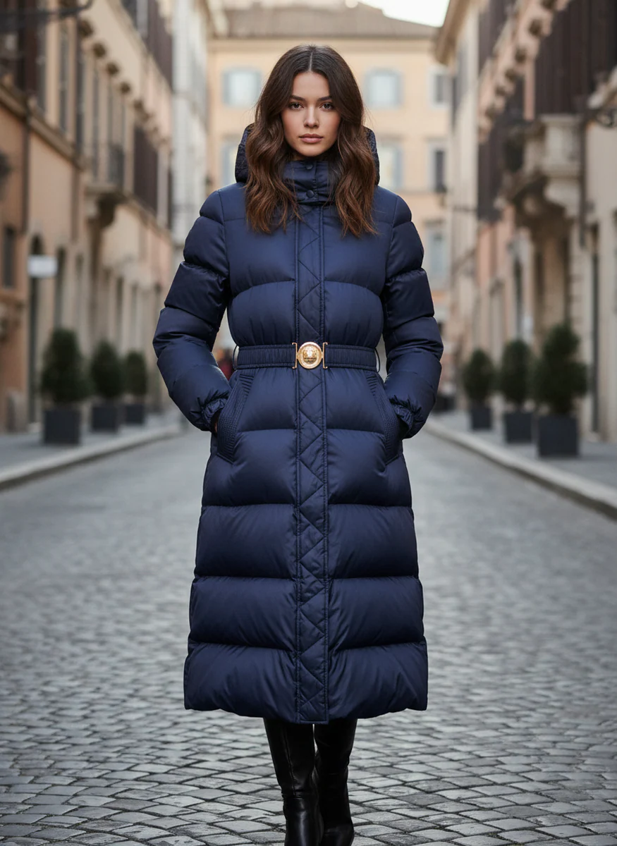 Piumino Lungo con Cappuccio e Cintura Elastica
