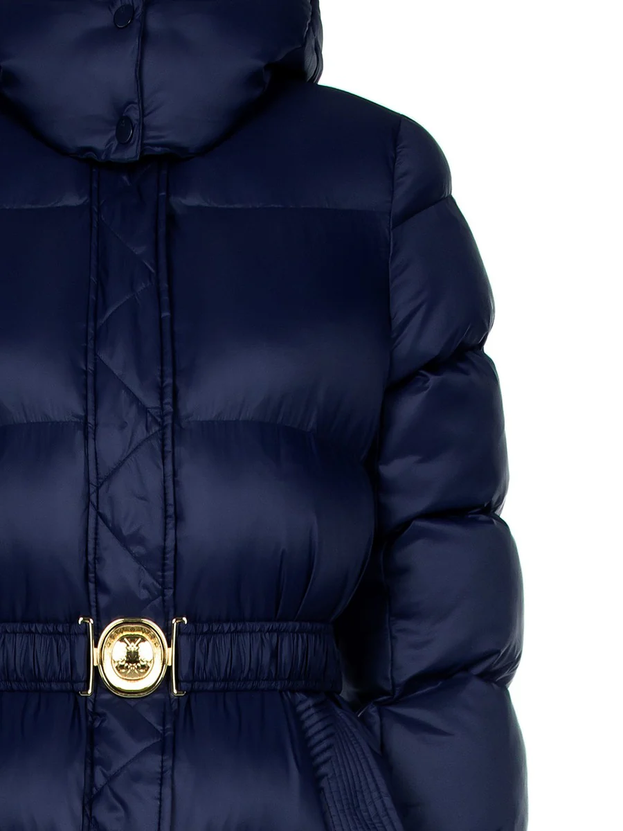 Piumino lunghezza al ginocchio realizzato in nylon con imbottitura ecologica Repreveยฎ, una fibra di poliestere riciclato, ideale anche per le temperature piรน rigide. Modello sciancrato con collo alto e cappuccio, zip metallica con cursore logato posta al centro per chiusura e comode tasche laterali. E’ presente una cintura elastica arricciata con fibbia tonda ad incastro all’interno dei passanti, per evidenziare il punto vita. Piumino caldo ed avvolgente da indossare di giorno per completare gli outfit casual e sportivi. La modella รจ alta 1,77 ed indossa la taglia S. Vestibilitร  abbondante.