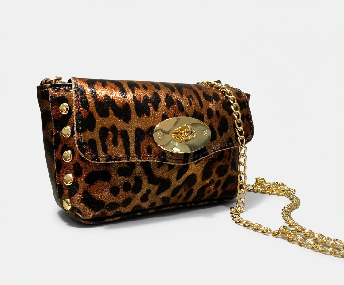 Pochette maculata animalier in vera pelle, accessorio grintoso e di carattere.