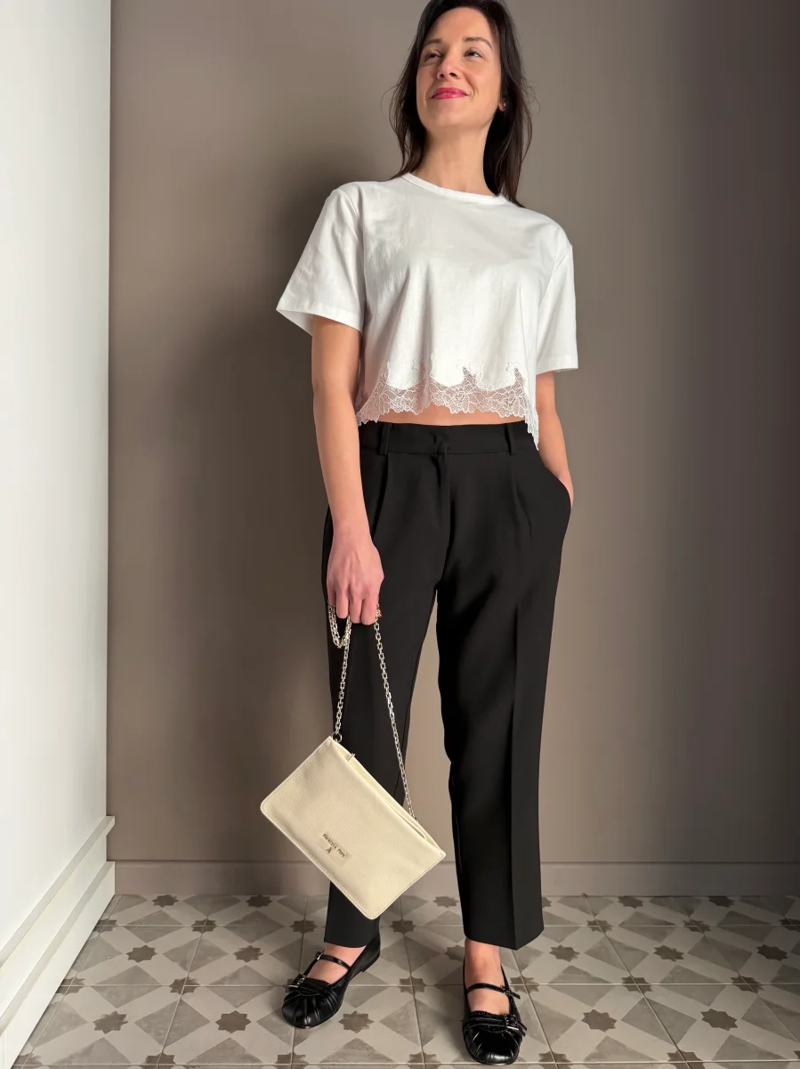 โข Dettagli Iconici: Il logo Patrizia Pepe con l’inconfondibile Fly in metallo aggiunge un punto luce discreto ma immediatamente riconoscibile.