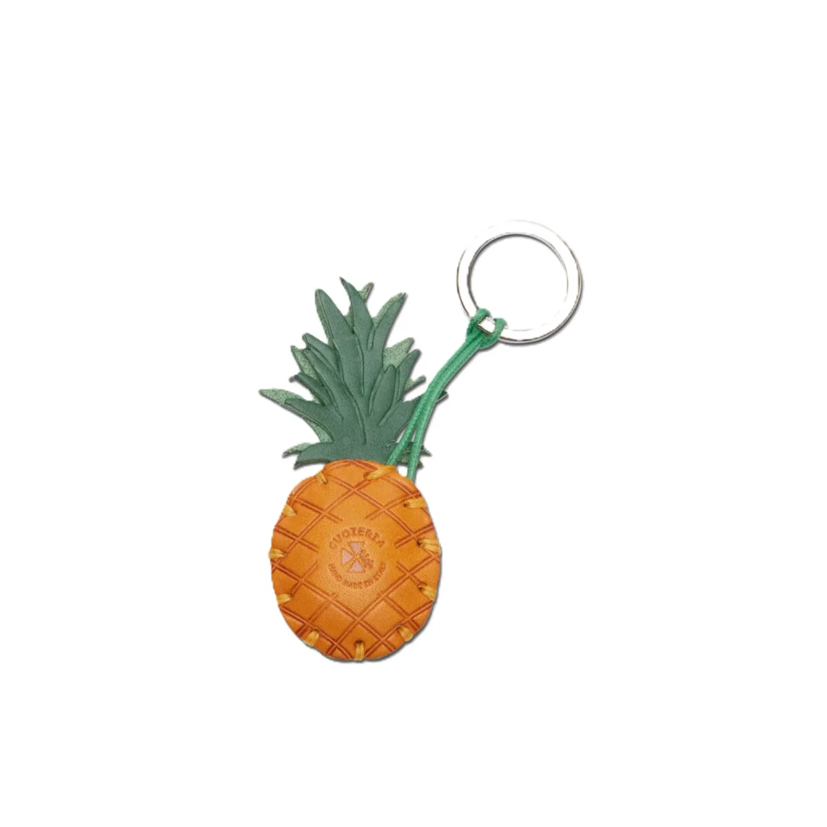 Grazioso portachiavi a anello in cuoio con soggetto Ananas ideale per uso quotidiano. Realizzato con pellame conciato al vegetale di primissima qualitร , unisce la morbidezza del pellame all’estrositร del disegno reso prezioso dalle cuciture applicate artigianalmente.