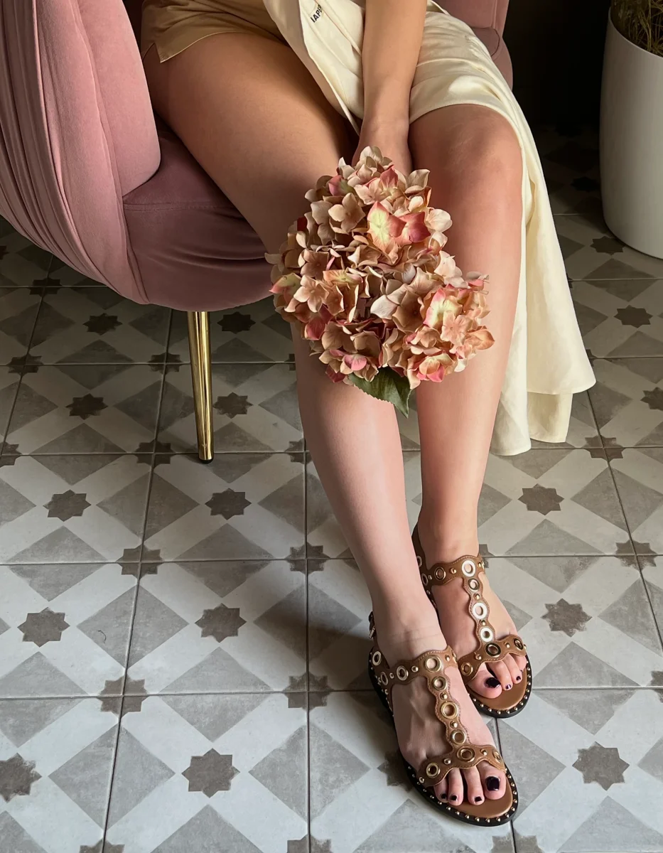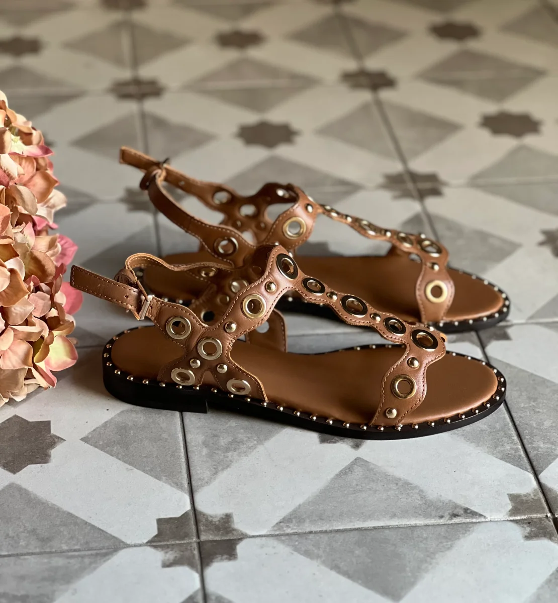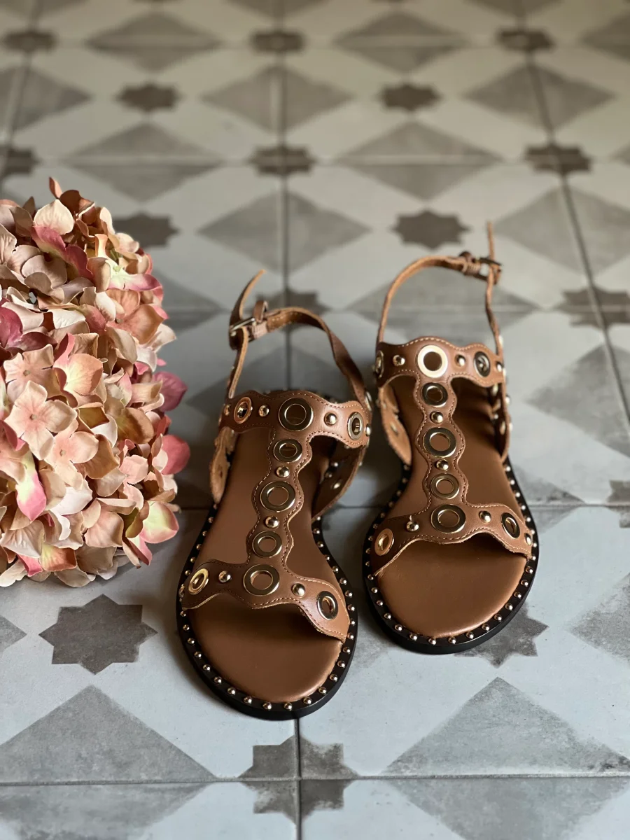 Sandalo in cuoio firmato Ash, dal design deciso e ricercato. Le fettucce in pelle sono impreziosite da anelli dorati decorativi,che donano un tocco glam e distintivo. La chiusura con fibbietta posteriore assicura una calzata stabile e confortevole.