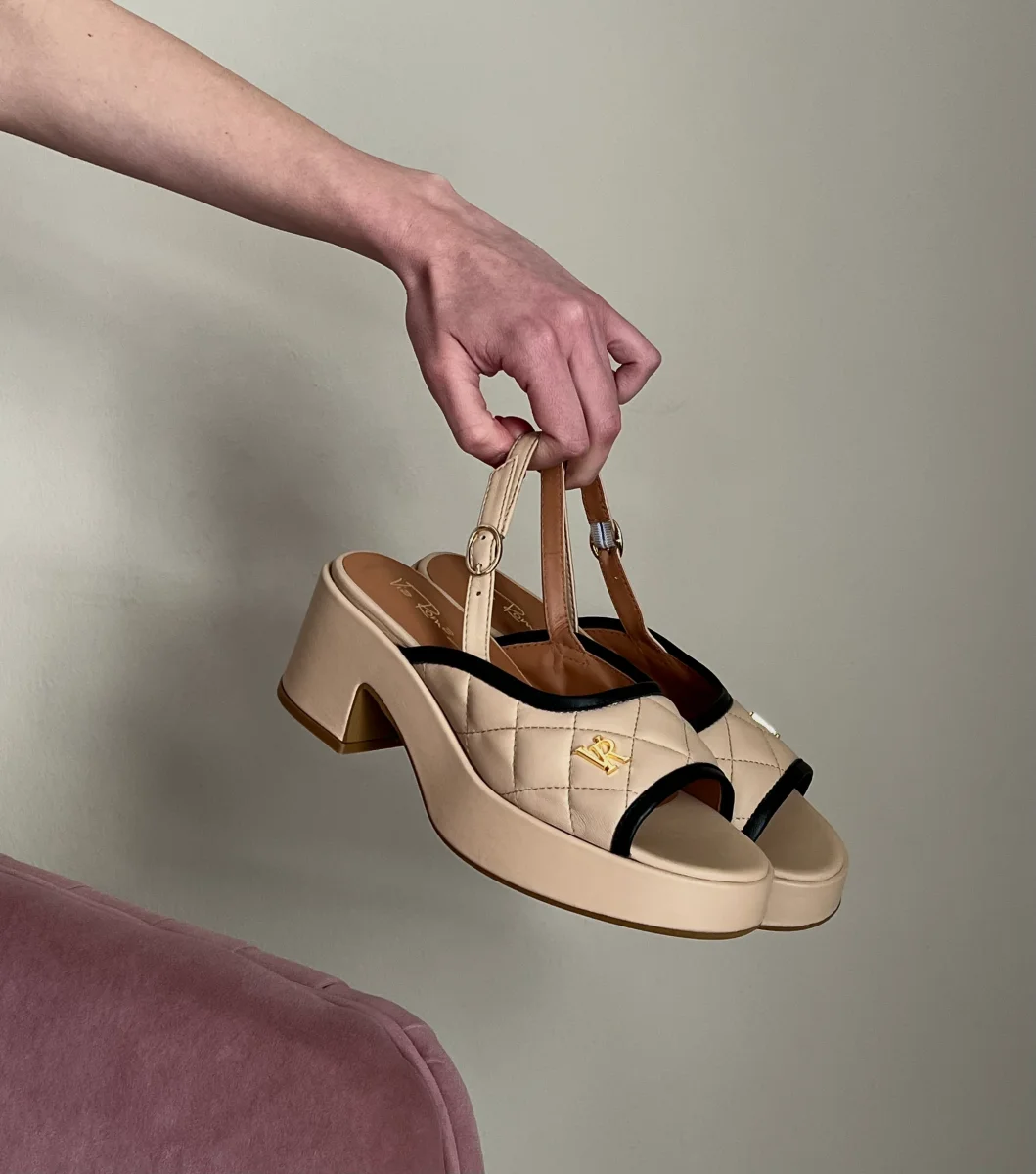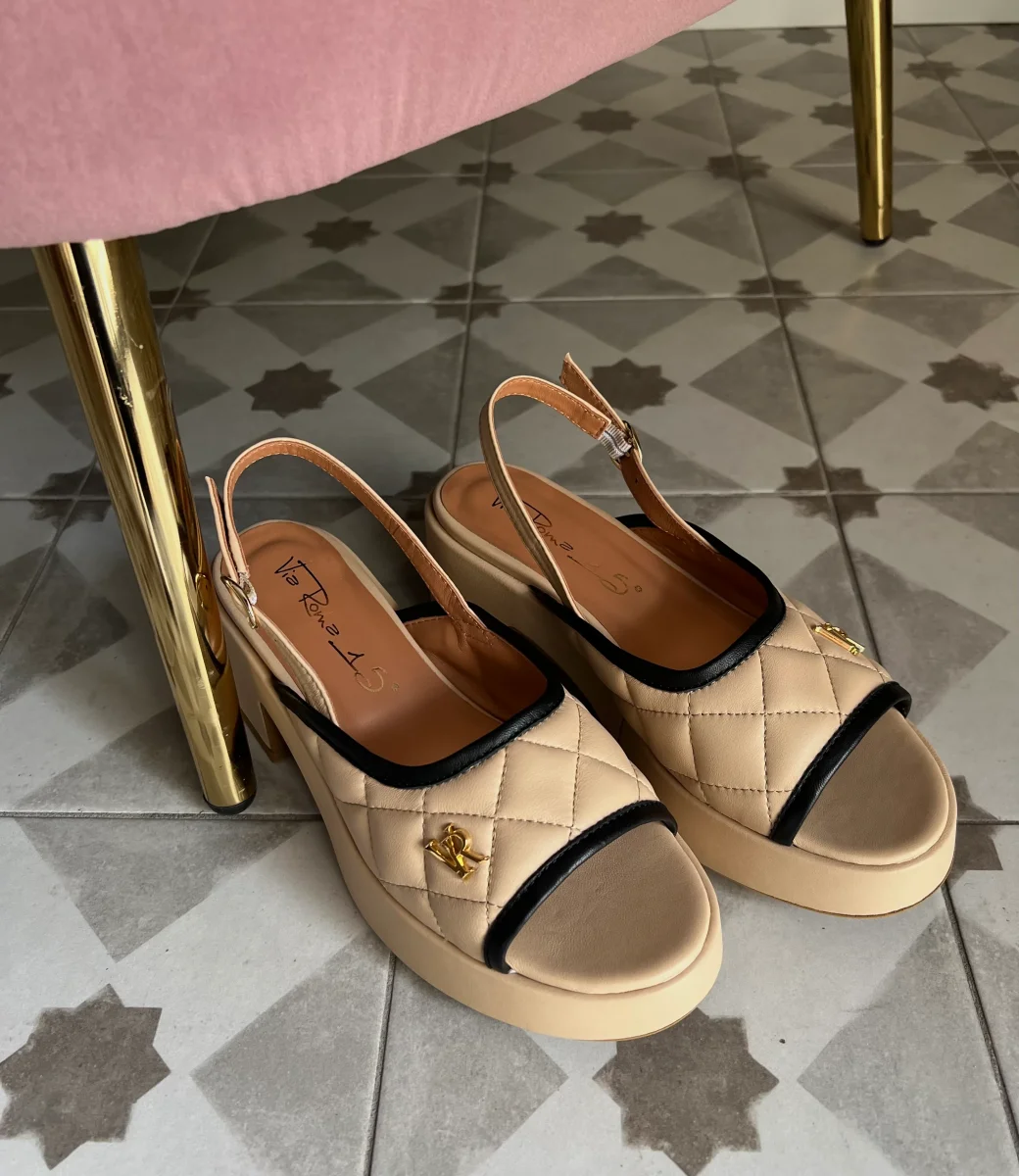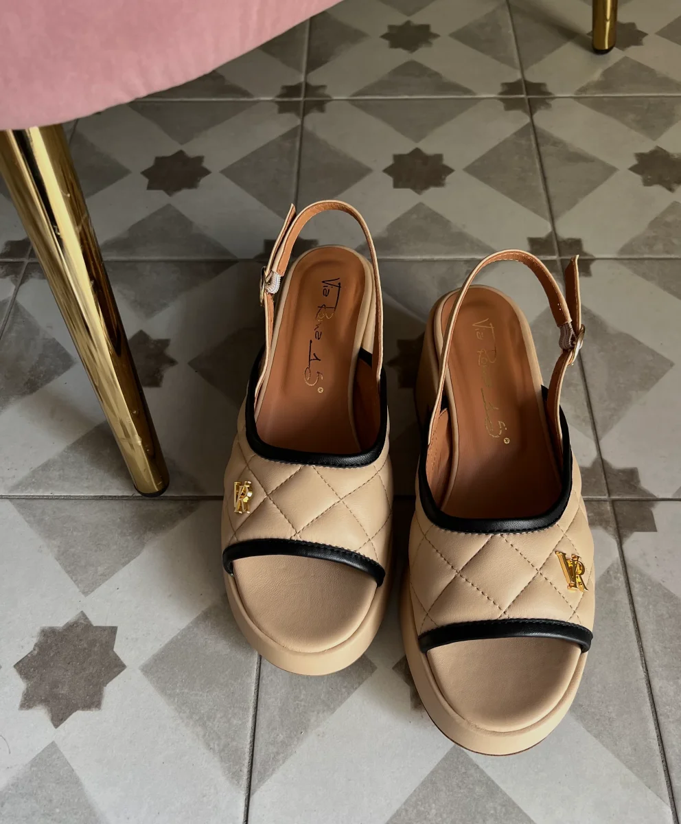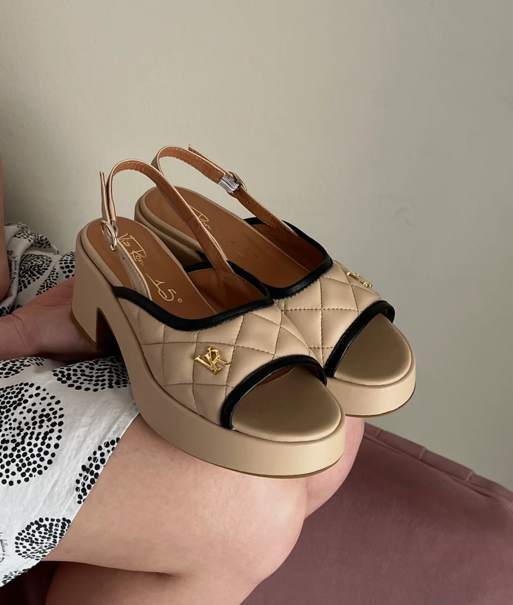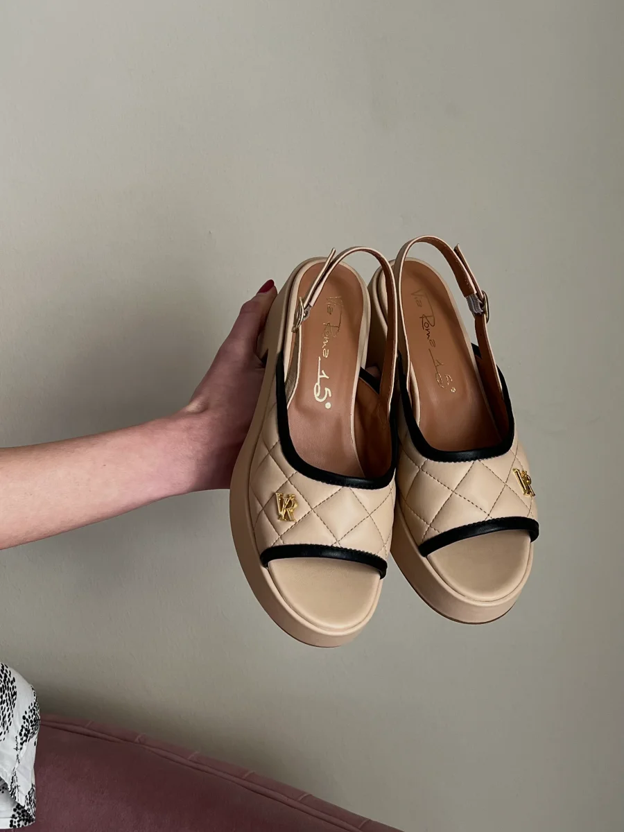 Il sandalo con plateau di Via roma 15 sono un’elegante aggiunta al tuo guardaroba estivo. Caratterizzato da una tomaia in pelle trapuntata e una fodera interna in pelle, offre comfort e un allure indiscutibile. Forma a decolletè, spuntato, con cinturino posteriore regolabile , questo sandalo ha un tacco zeppa alto6cm e un plateau alto 3cm, che conferisce stile e slancio alla silhouette.