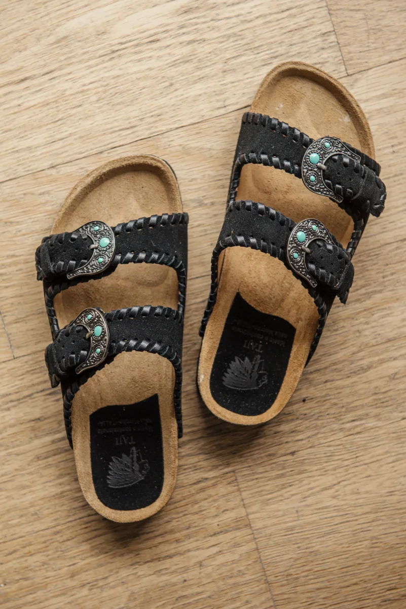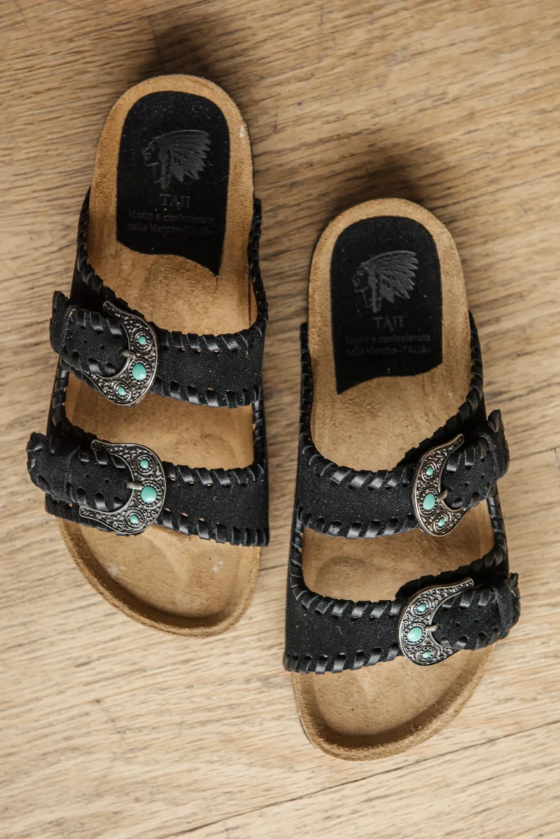 Questo sandalo doppia fascia si distingue per il suo stile unico e ricercato. Realizzato in suede morbidissimo, unisce comfort e originalitร , mentre le fibbie in stile boho in argento anticato sono impreziosite da pietre turchesi,per un tocco etnico e sofisticato. Un sandalo perfetto per look casual dal gusto libero, ma curato nei dettagli.