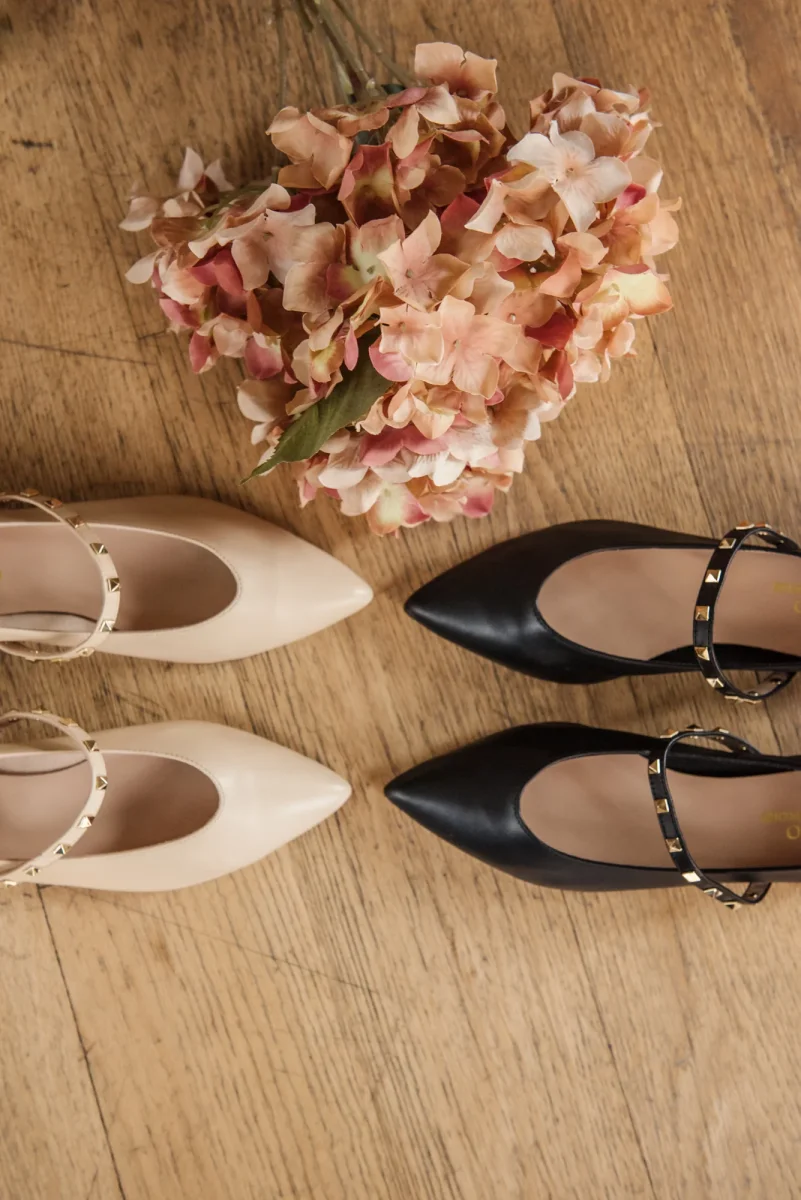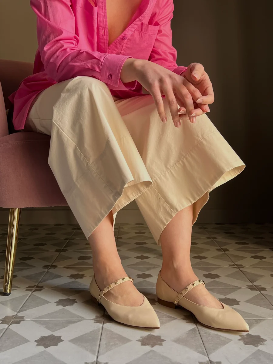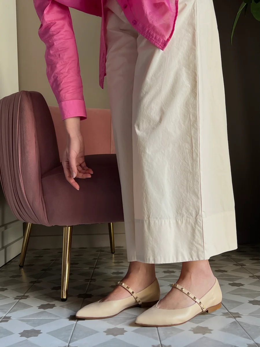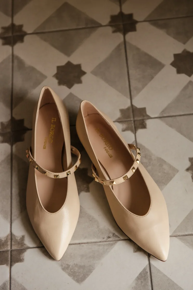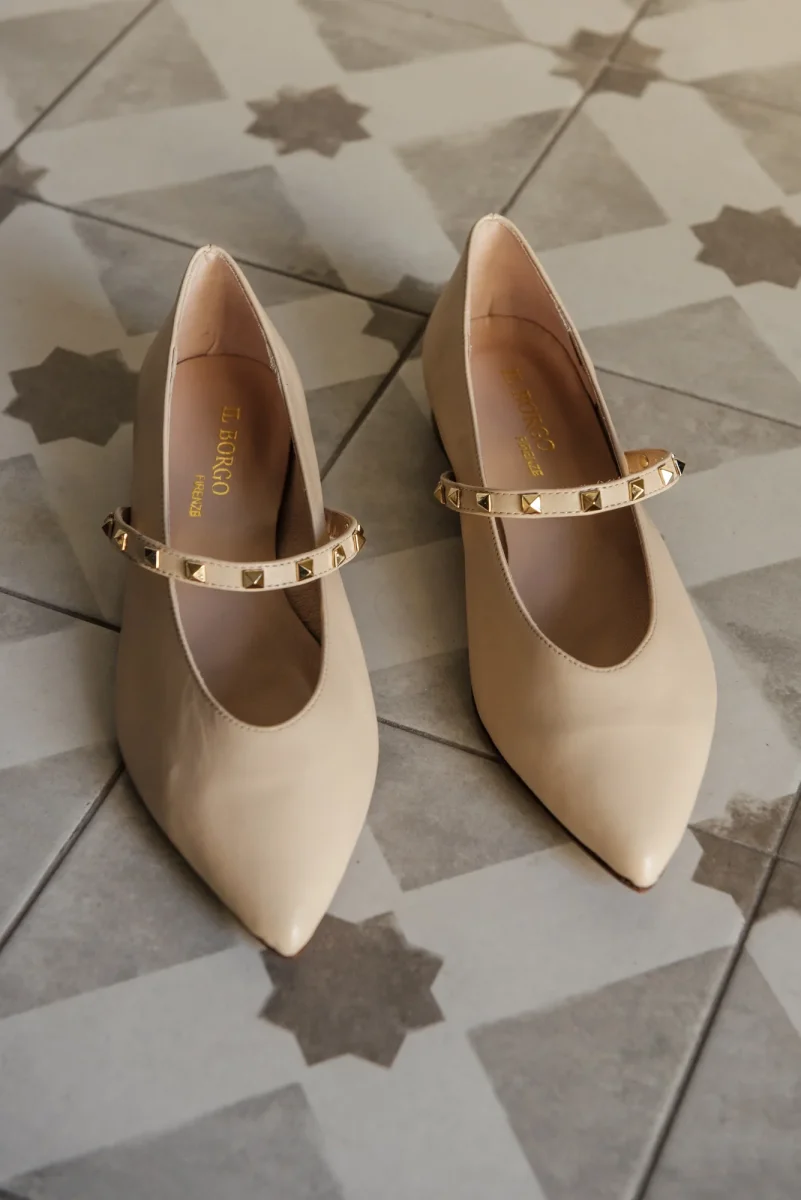 Questa scarpa in pelle morbidissima รจ un capolavoro di eleganza discreta e comfort . Il design affusolato della scollatura dona un tocco di femminilitร , mentre la fettuccia con borchiette dorate sul collo del piede aggiunge un dettaglio di classe e luminositร . Il colore beige la rende incredibilmente versatile, adattabile a qualsiasi outfit, dal piรน casual al piรน elegante.