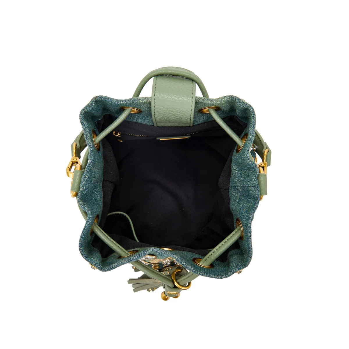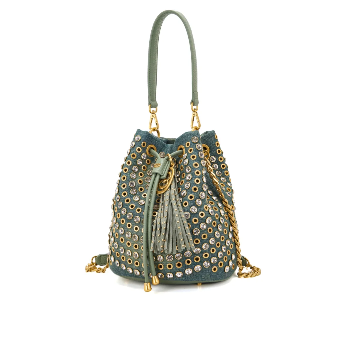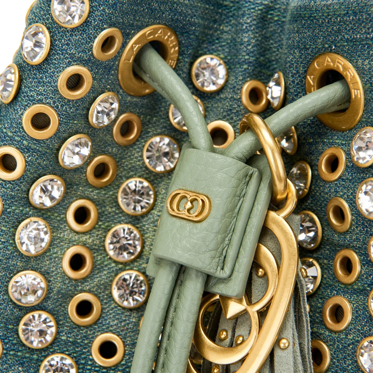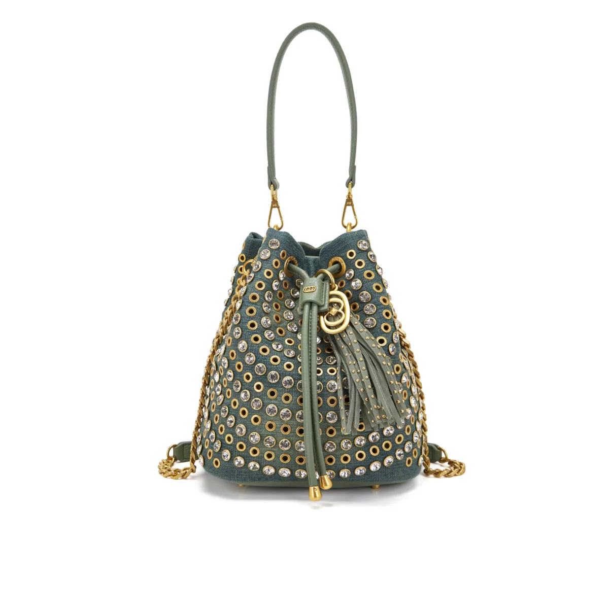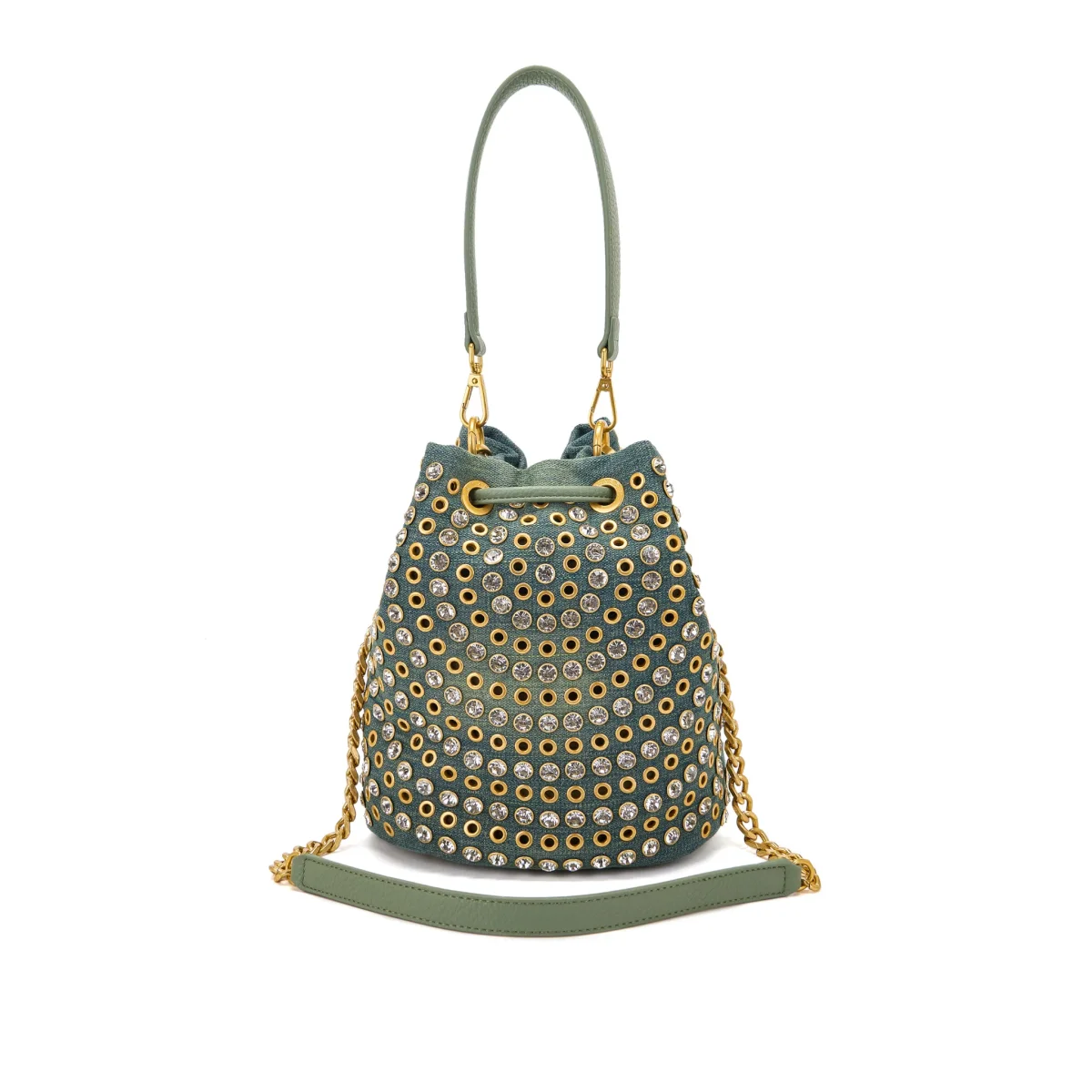 Secchiello in canvas e PU con borchie e strass applicati, manico e tracolla rimovibili