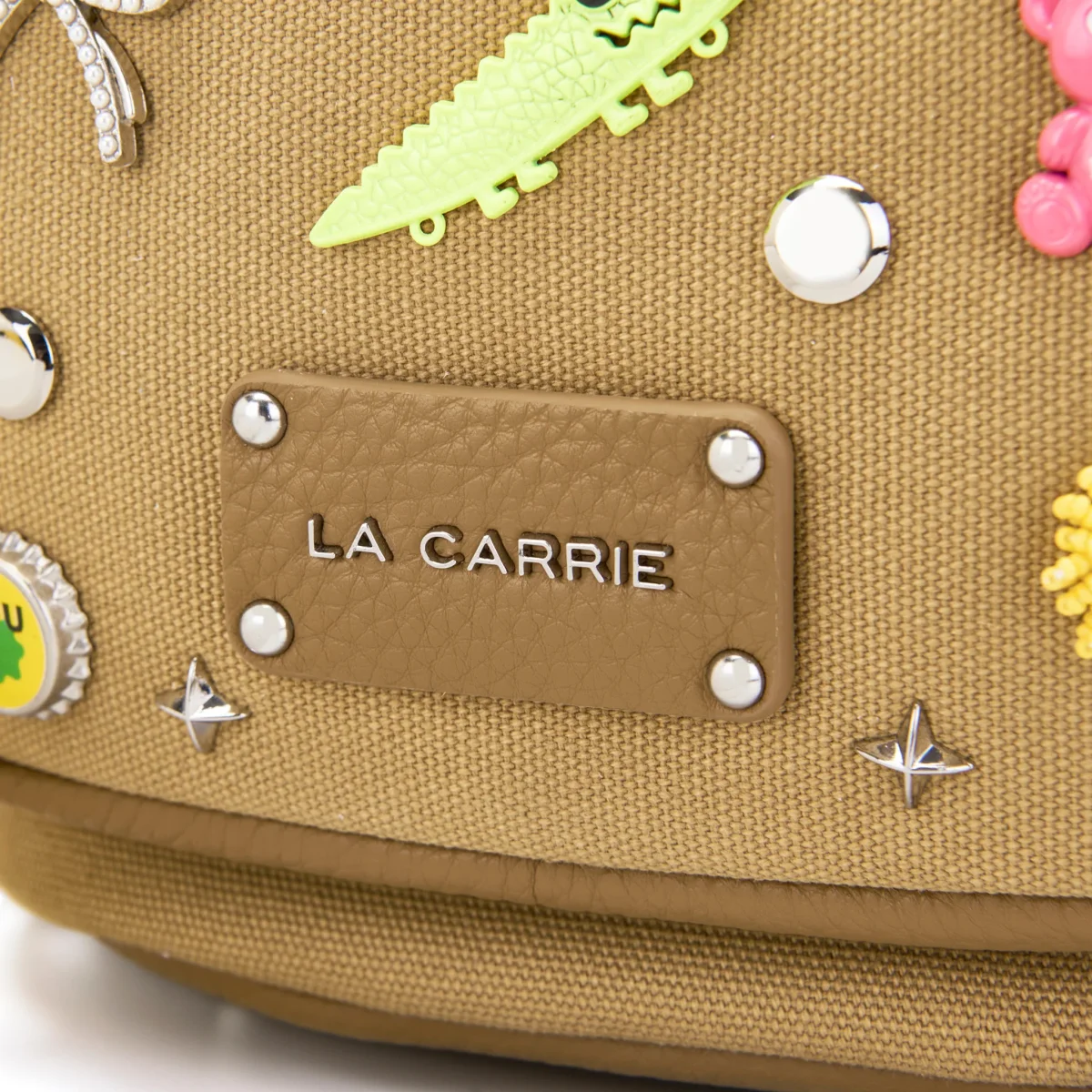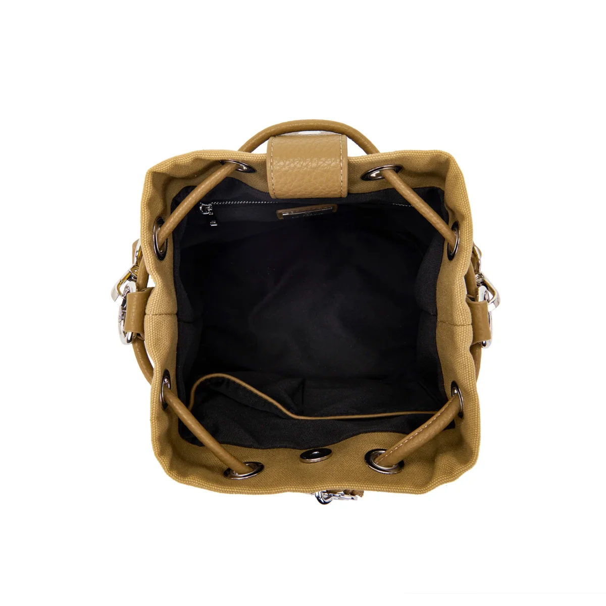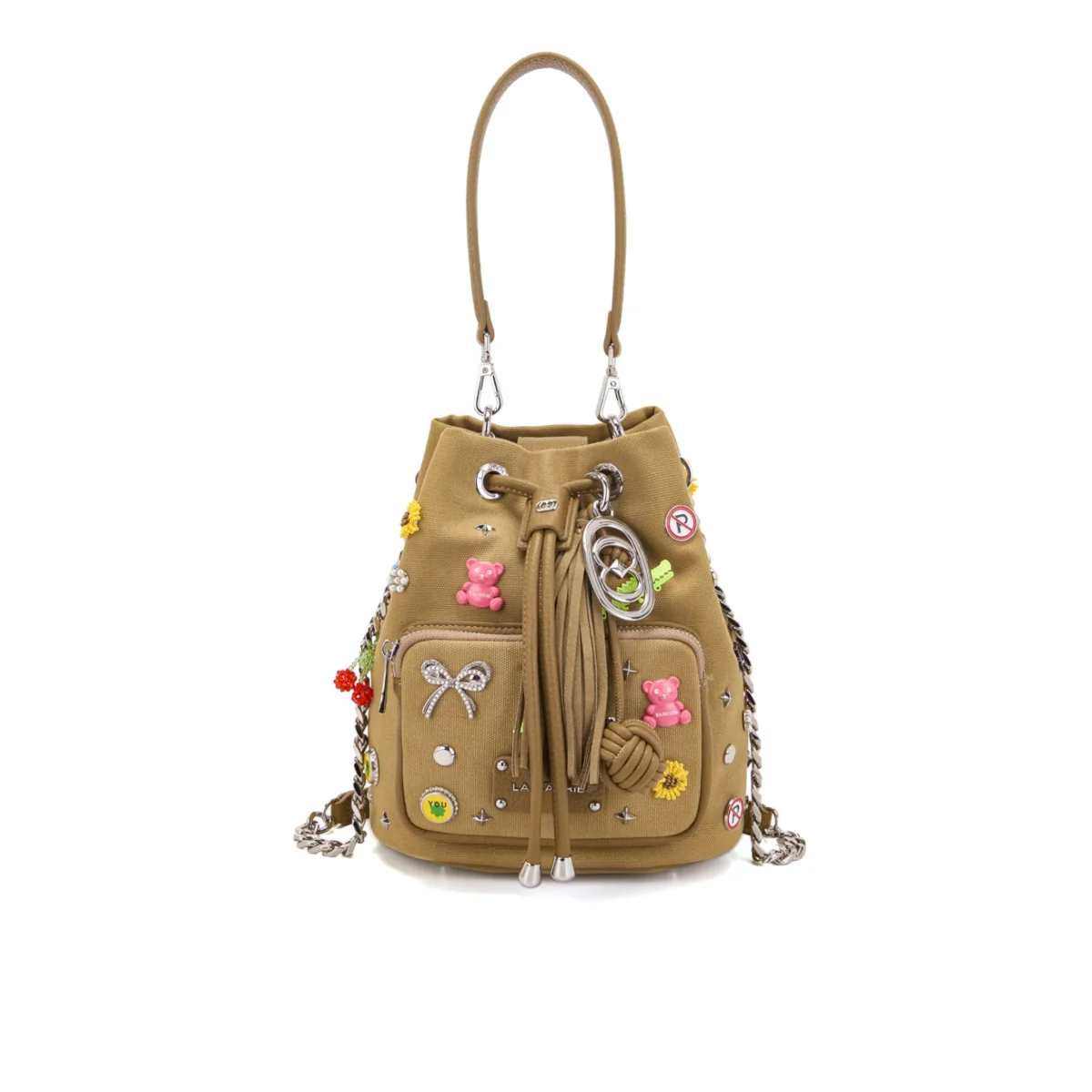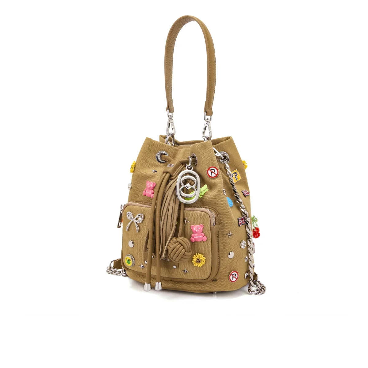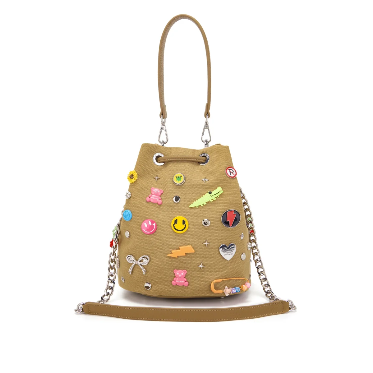 Secchiello in canvas con spille colorate applicate, manico e tracolla rimovibili