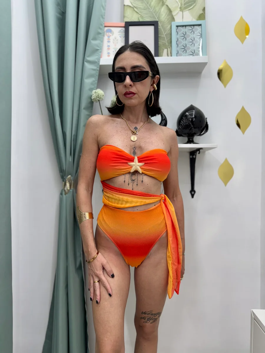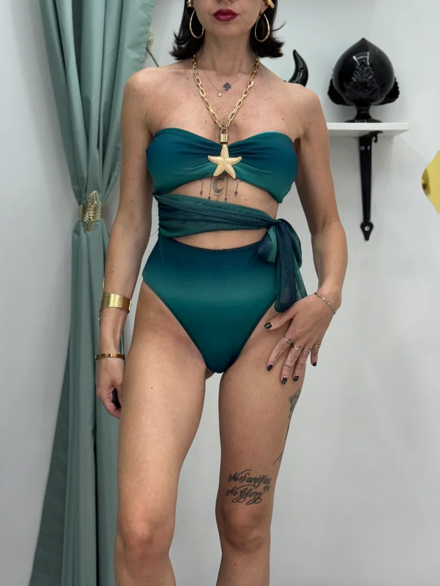 Scopri il fascino senza tempo del nostro set da mare da donna, perfetto per un’estate all’insegna dello stile e della femminilità. Il completo include un costume intero a fascia in tessuto leggero e velato, impreziosito da una raffinata stella marina dorata sullo scollo, che dona luce e carattere al décolleté.