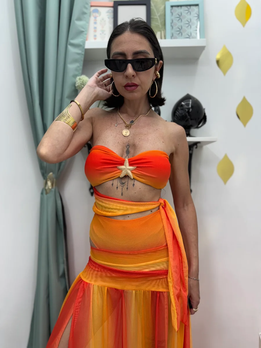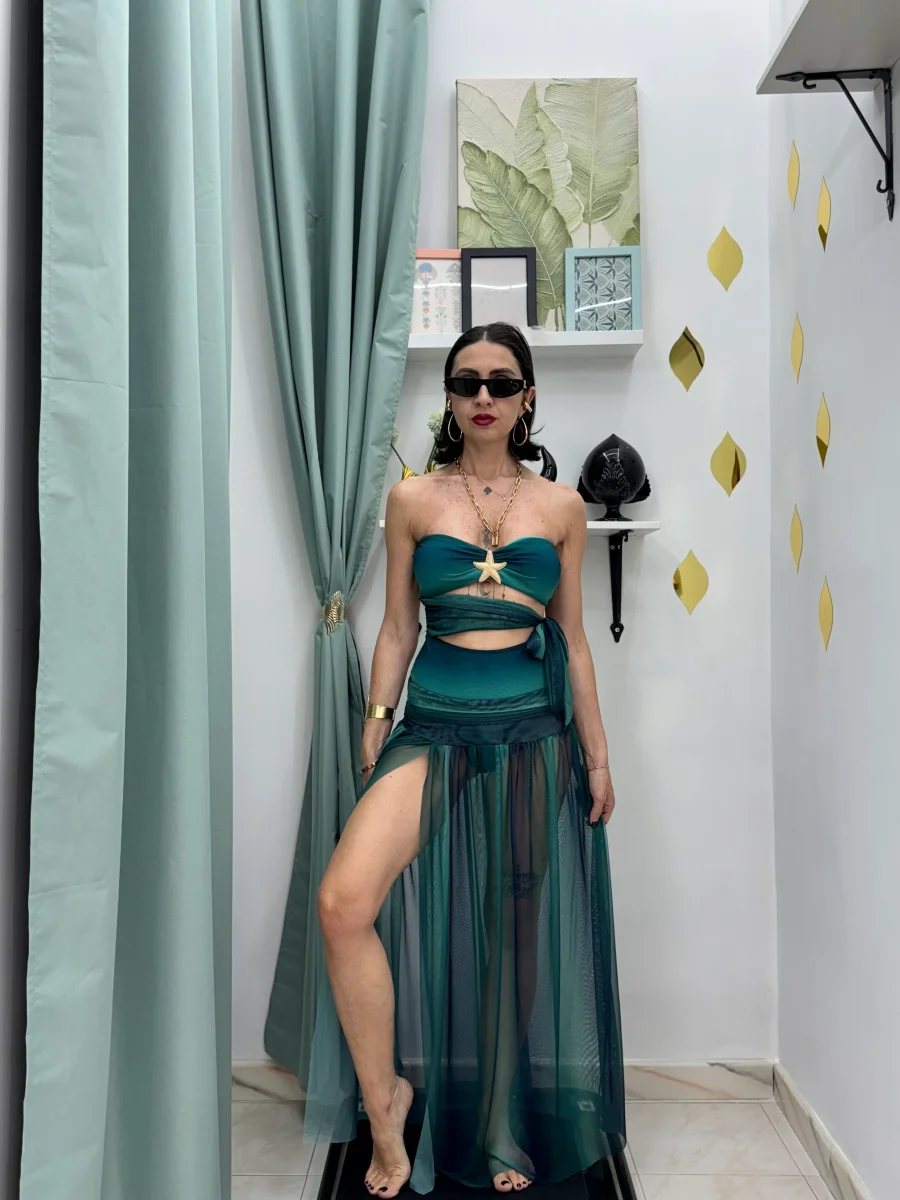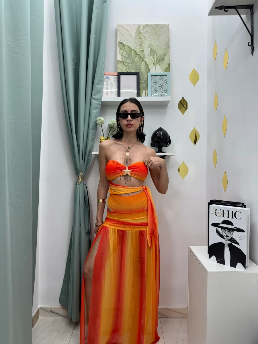 Il look è completato da una gonna lunga a pareo con spacco laterale, realizzata in tessuto trasparente e fluido, perfetta per esaltare le forme con eleganza e sensualità. Disponibile in due nuance di tendenza: