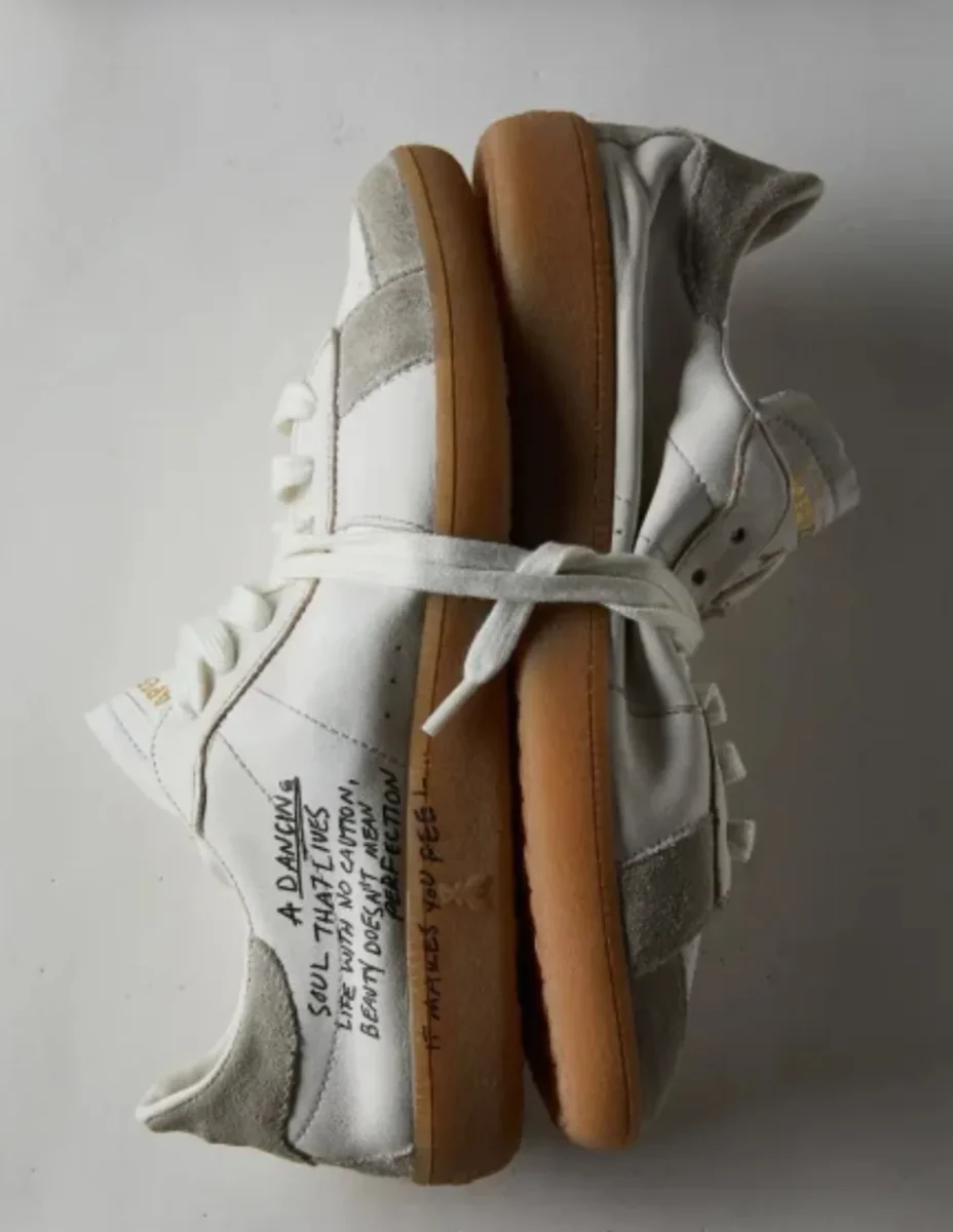 - Suola in gomma con claim effetto calligrafia su scarpa destra
