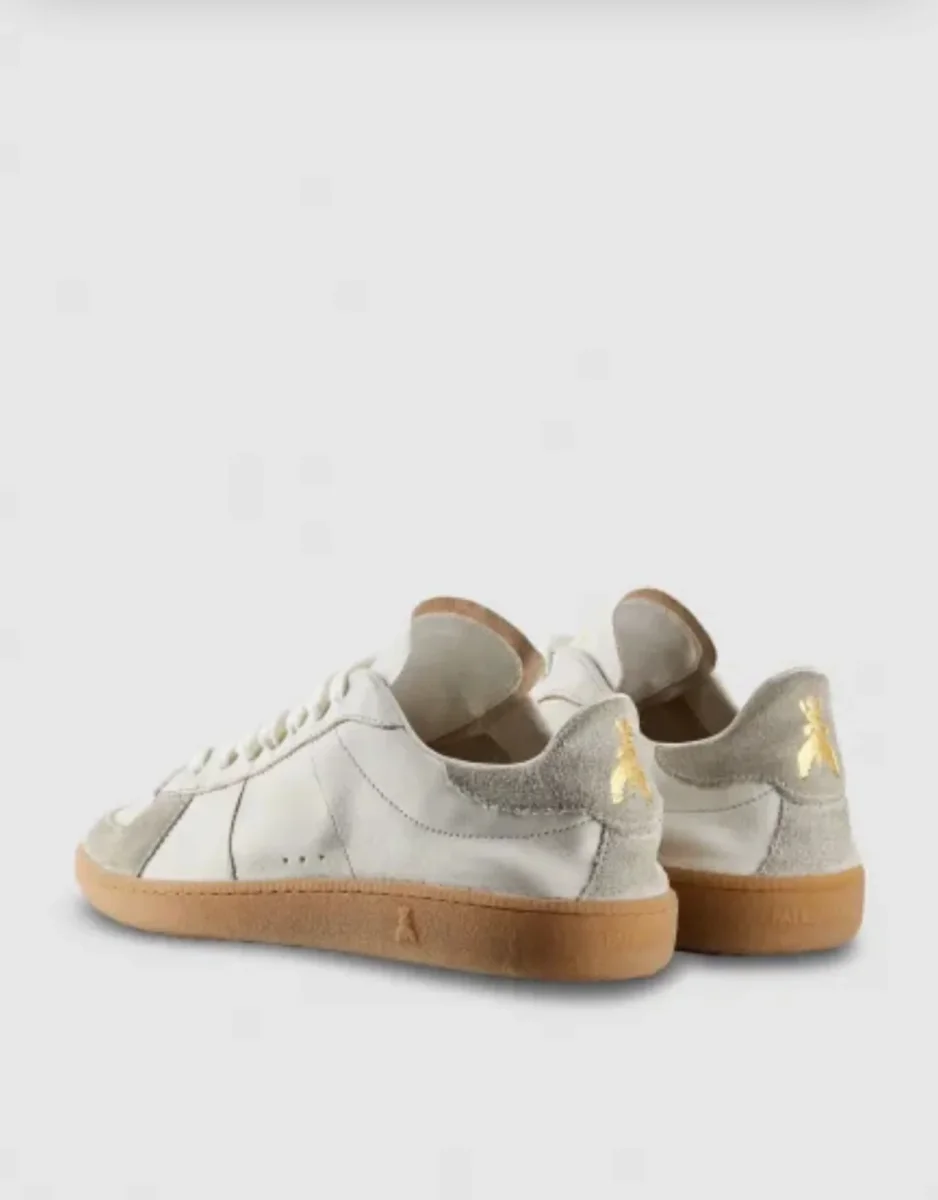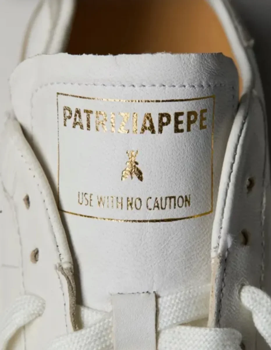- Logo stampato color oro sull’etichetta in pelle cucita sulla linguetta; Logo Fly dietro impresso color oro; Suola beige con scritta “Patrizia Pepe Skin” e logo Fly bianco