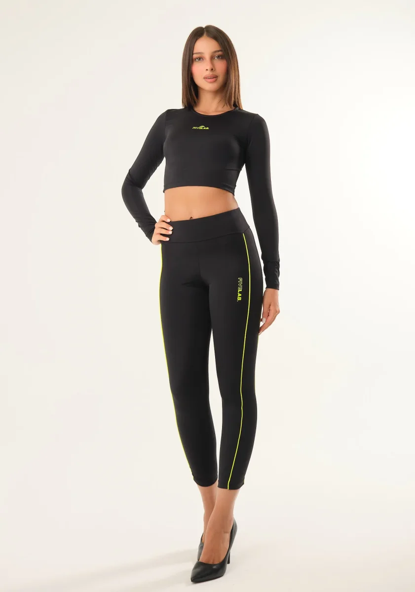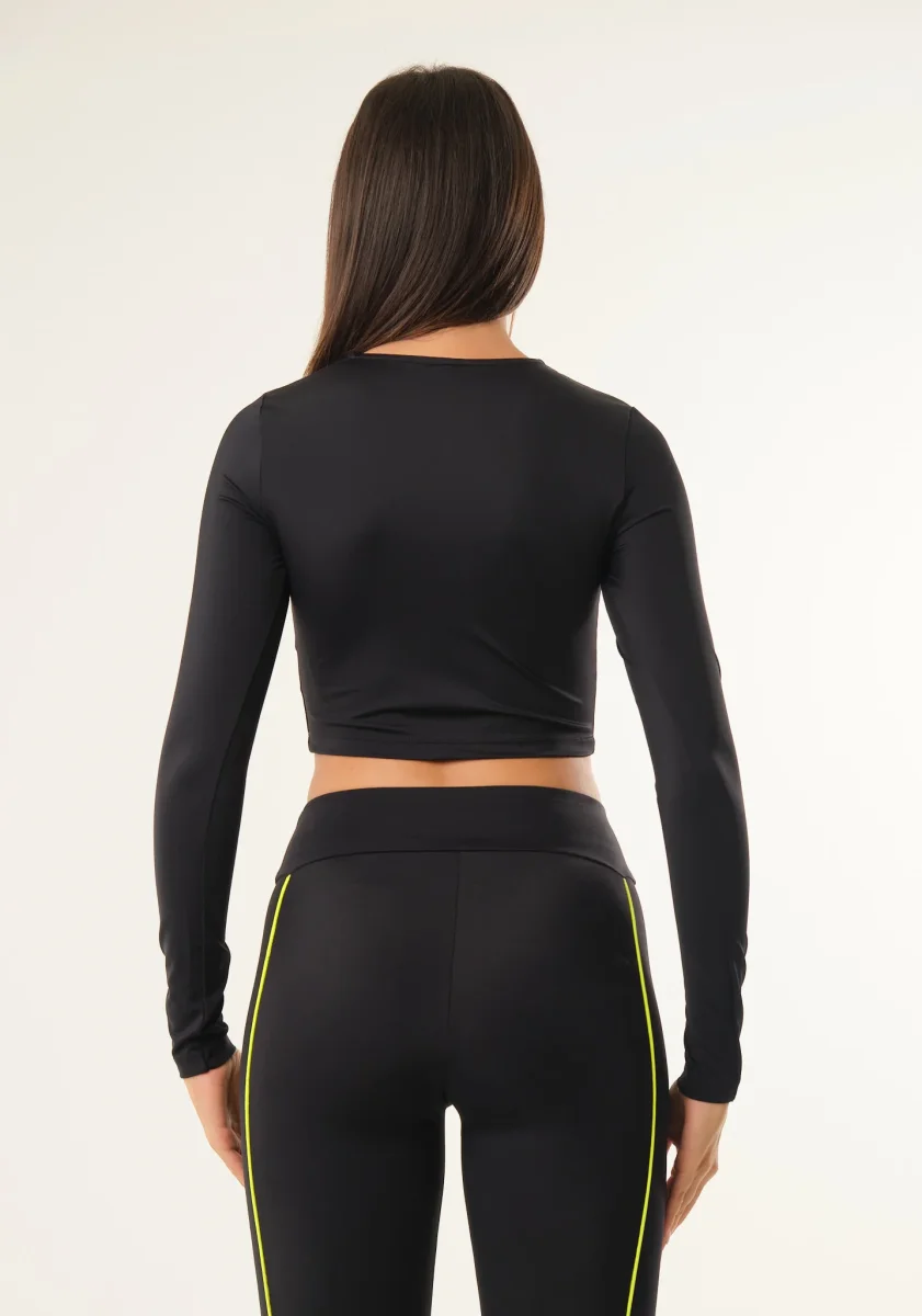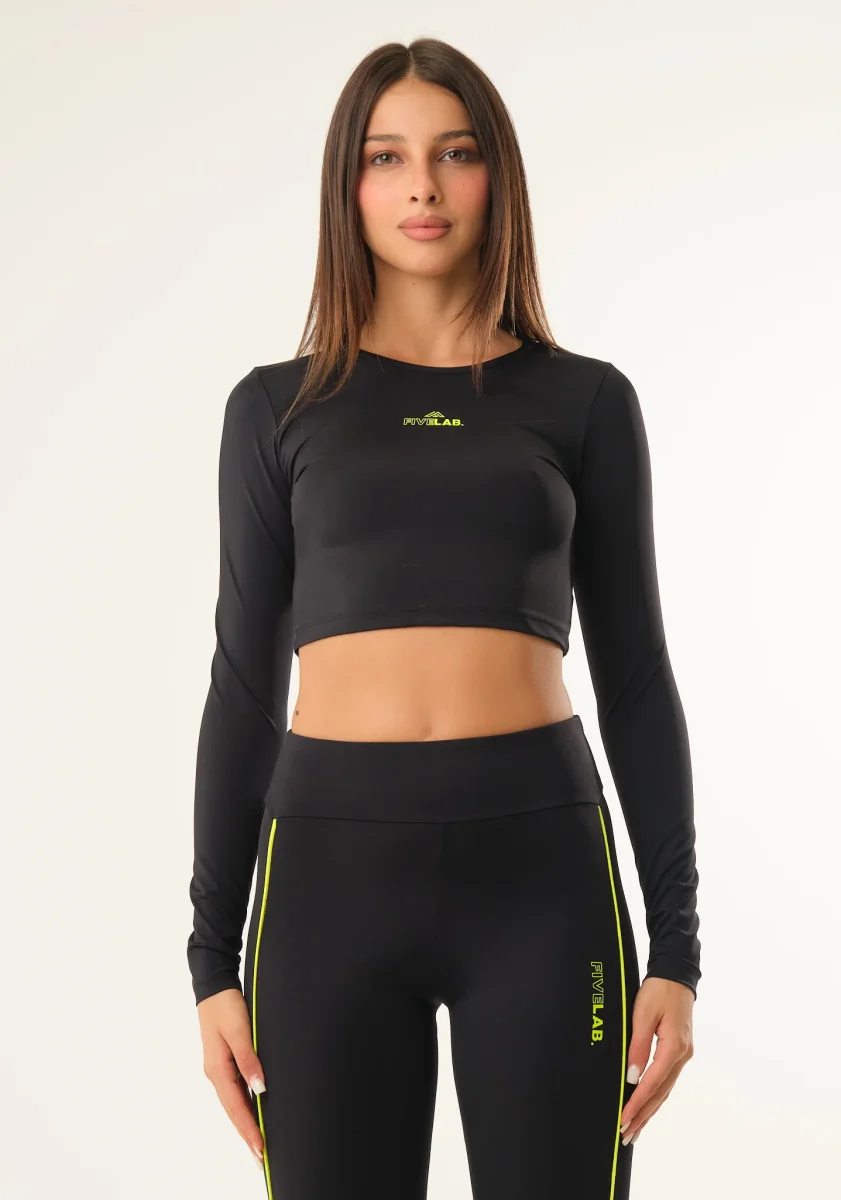 T-shirt crop in lycra aderente, scollo rotondo, maniche lunghe