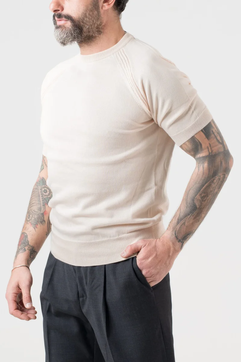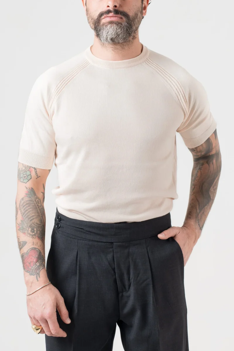 La T-shirt in filo manica raglan รจ un capo d’abbigliamento realizzato interamente in Italia, progettato per offrire un equilibrio tra comfort e stile raffinato. La sua lavorazione in filo di alta qualitร garantisce una texture morbida e traspirante, ideale per le giornate piรน calde. La vestibilitร regolare e il design con maniche raglan conferiscono un aspetto contemporaneo e versatile, adatto sia per look casual che per outfit piรน eleganti.
