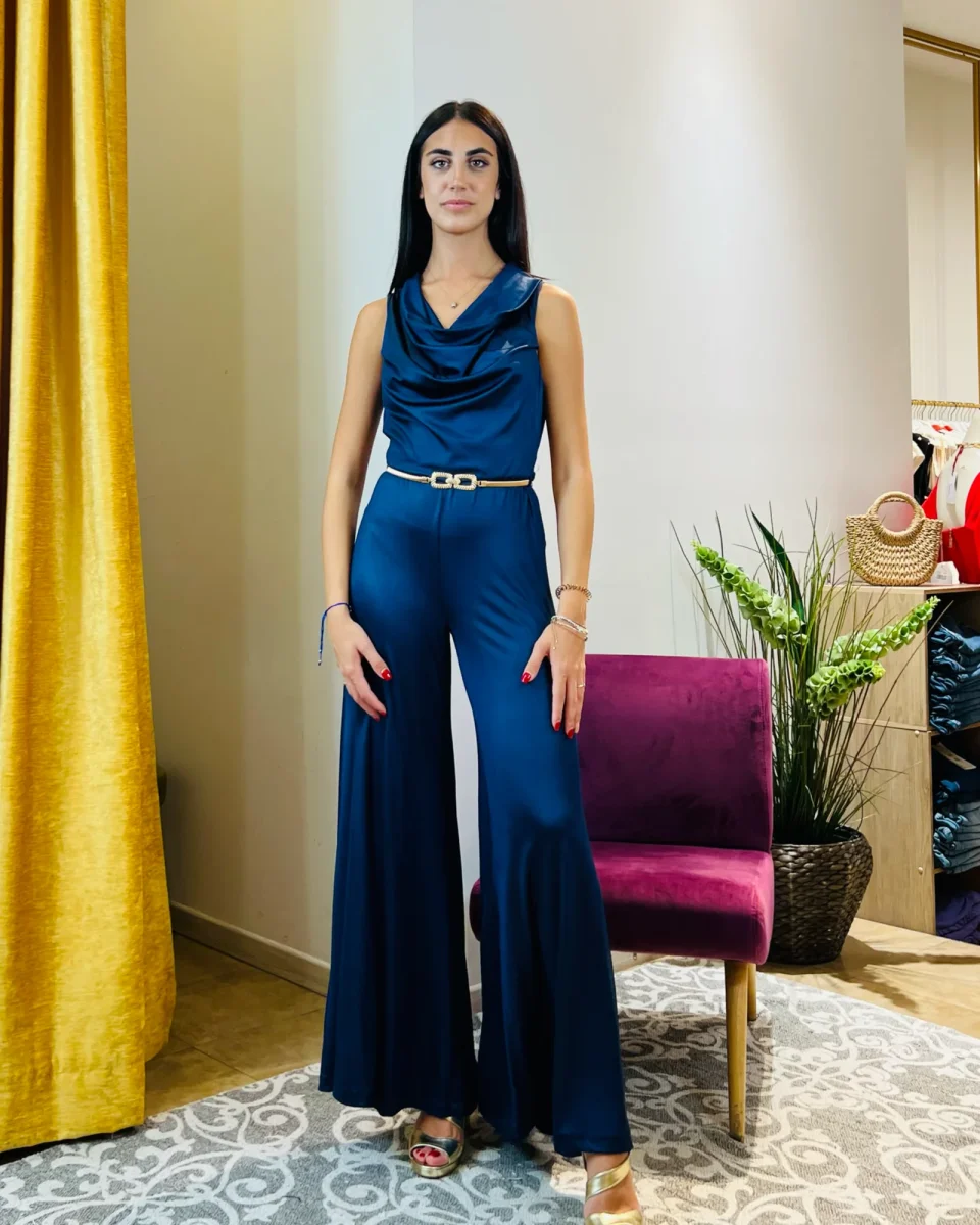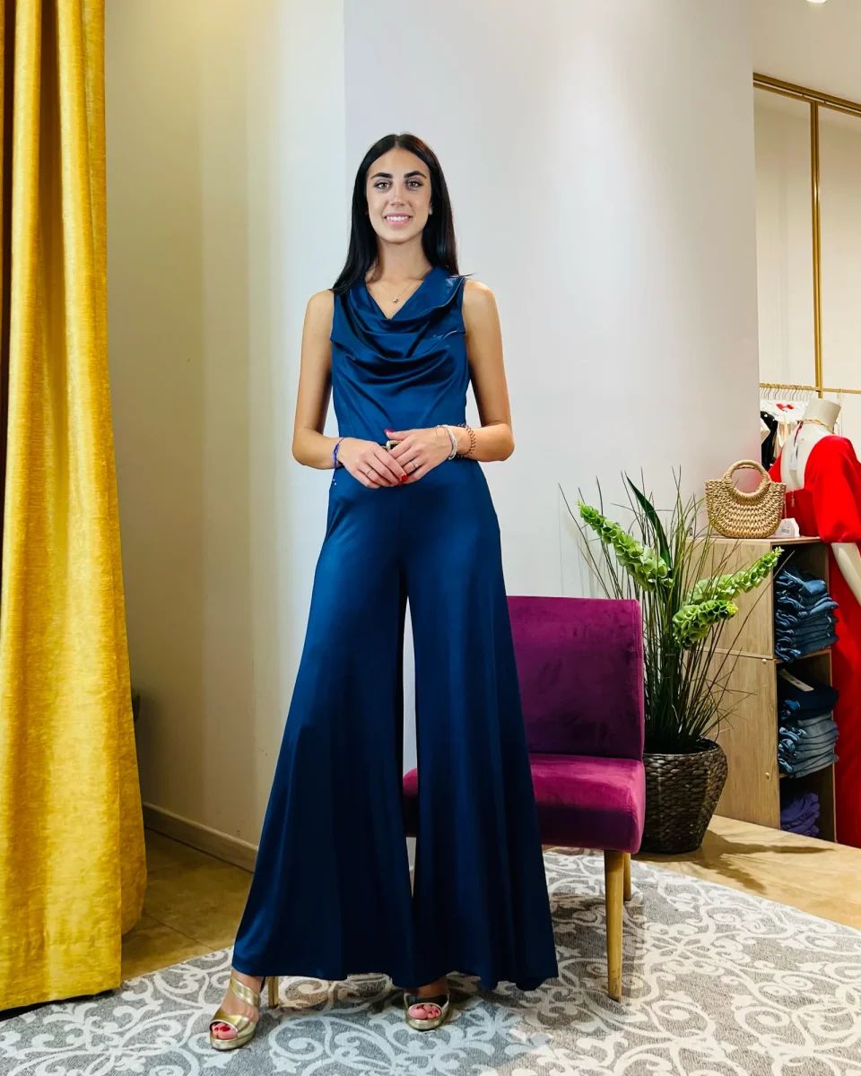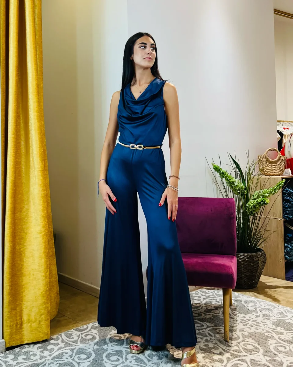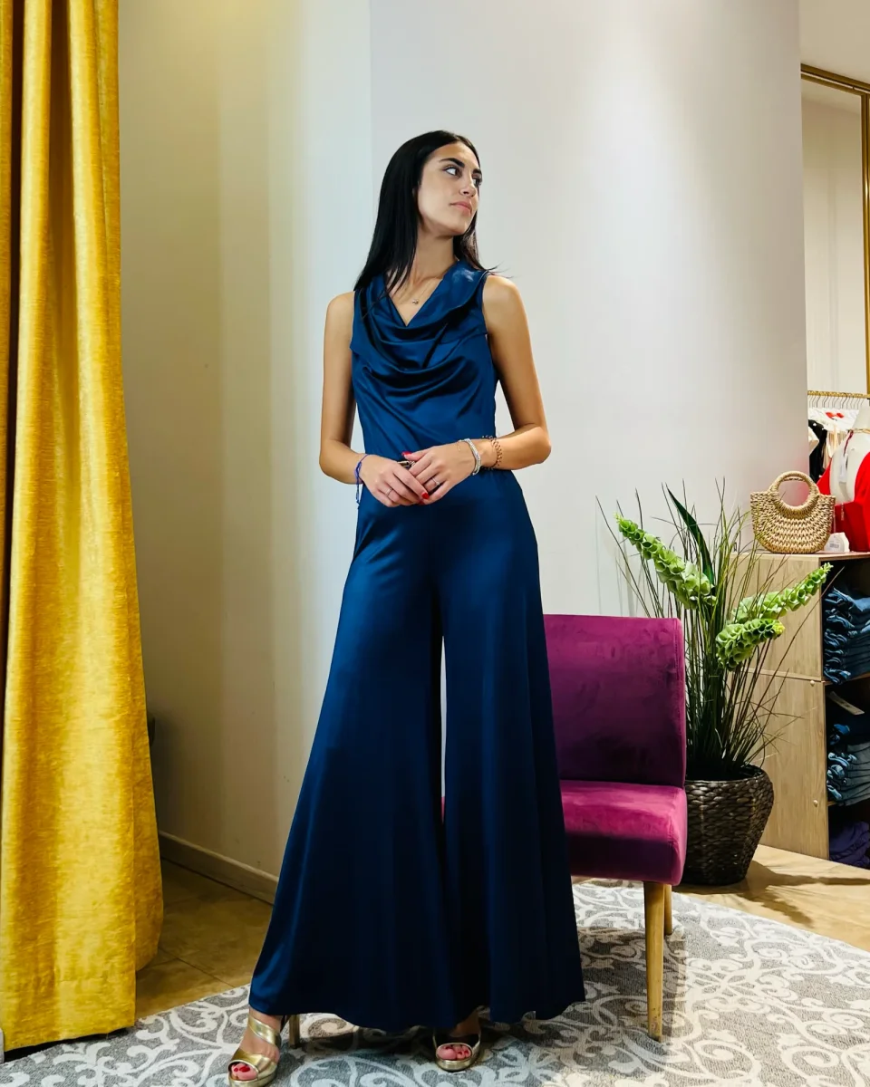 Tuta “Midnight Azure”. Tuta elegante con pantaloni palazzo in jersey.